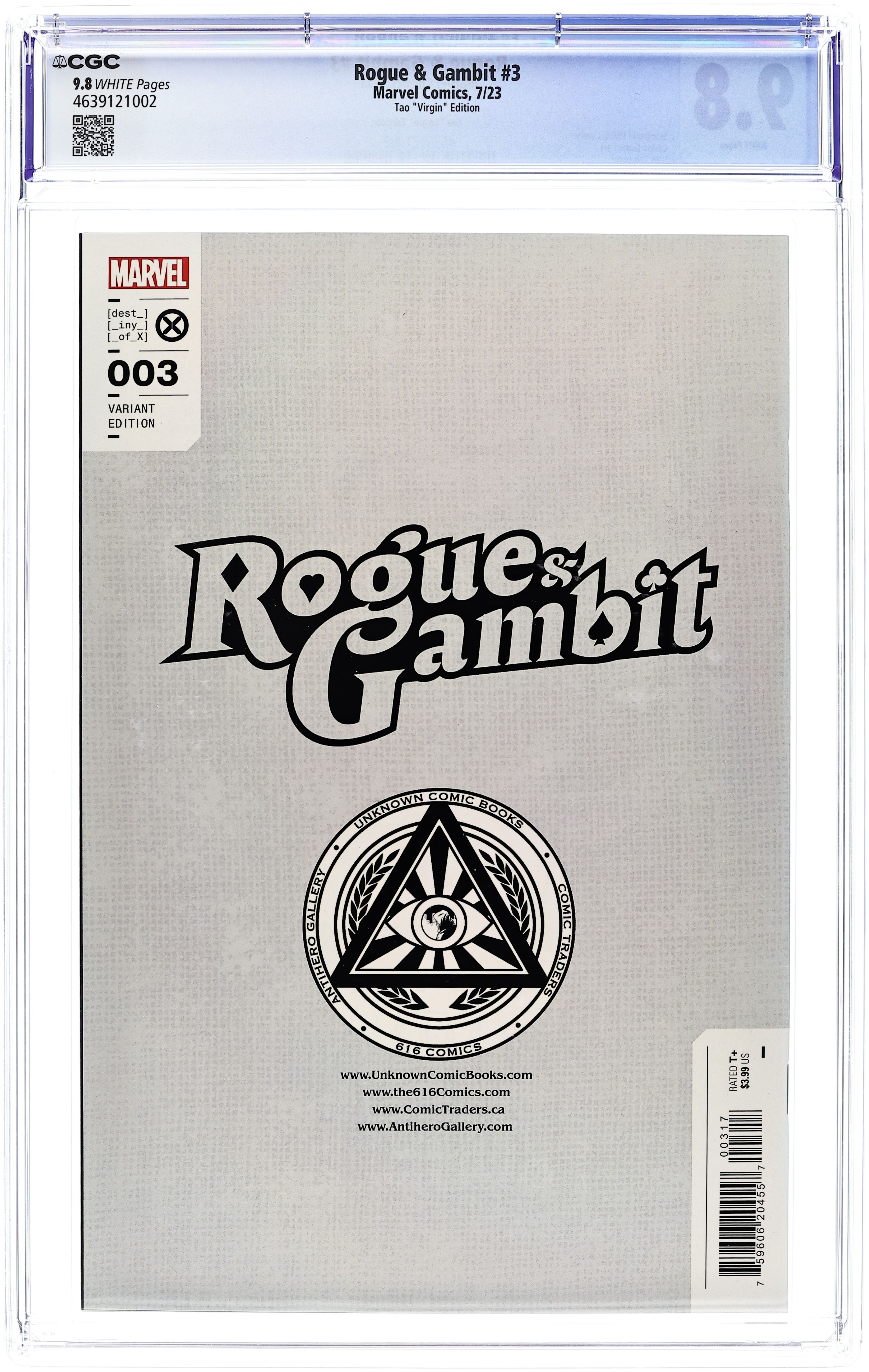 Comics Illuminati (Unknown Comics, Comic Traders, Anti-Hero Gallery, and The 616 Comics) Exclusive Virgin Cover by Ivan Tao. Written by Stephanie Phillips. Art by Carlos Gomez. BROKEN PROMISES AND BROKEN BONES! As Manifold's trail goes cold, tensions between Rogue and Gambit heat up! For months now, they've been pulling apart - Rogue busy with her X-Men duties, Gambit risking eternal death in Otherworld… Now, when Gambit discovers Rogue's been keeping secrets, the couple must face their issues head-on. Orrrr they could split up and tackle the fight solo - that sounds smart, right? But WHO is gathering super-powered humans? And why is Manifold so important anyway? The mystery continues in Stephanie Philips and Carlos Gómez's explosive romp through the Marvel U! 28 pages, full color. Rated T+