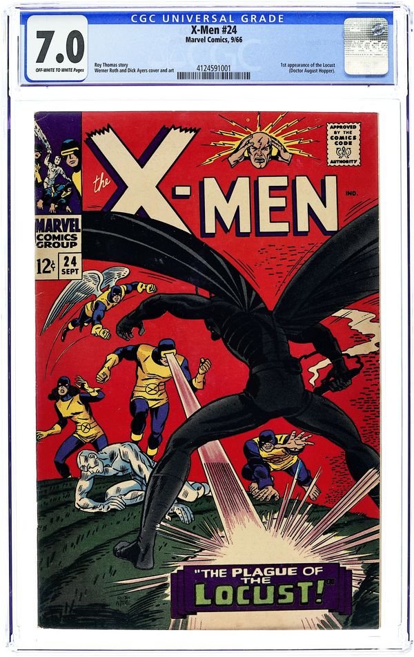 Cover pencils by Werner Roth, inks by Dick Ayers. The Plague of ... The Locust! starring Professor X, Cyclops, Marvel Girl, Angel, Beast, Iceman, Ted Roberts, and The Locust [August Hopper], script by Roy Thomas, pencils by Werner Roth, inks by Dick Ayers; August The Locust Hopper wants to unleash a plague of locusts on the world. Letter to the editor from comic inker D. Bruce Berry. 36 pgs. $0.12. Cover price $0.12.