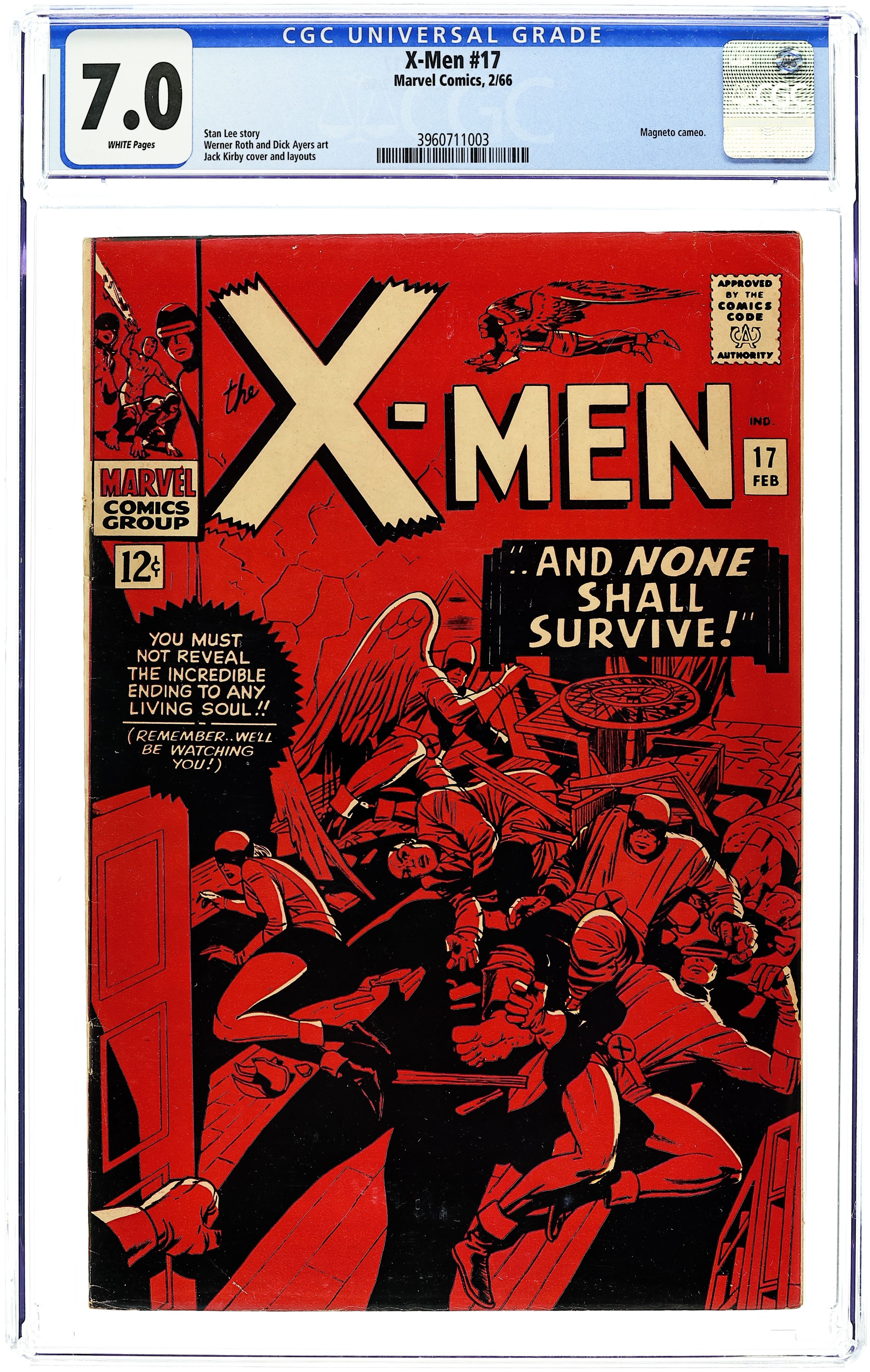 Cover pencils by Jack Kirby, inks by Dick Ayers. ...And None Shall Survive!, script by Stan Lee, pencils by Jack Kirby (p. 1 & layouts, pp. 2–20) and Werner Roth [as Jay Gavin] (pp. 2–20), inks by Dick Ayers; In the aftermath of their battle with the Sentinels, Hank, Bobby and Scott are taken to the hospital with injuries; Iceman is delirious in a coma but his companions recover quickly; When Warren's parents call and say they are dropping by for a visit, Angel flies back to the mansion where he is attacked by a mysterious stranger; Xavier and Cyclops, worried with no word from Angel, also return home and are attacked; Beast and Jean are the last to show up and are also taken down; As Warren's parents arrive at the mansion, they are greeted by Magneto. 36 pgs. $0.12. Cover price $0.12.