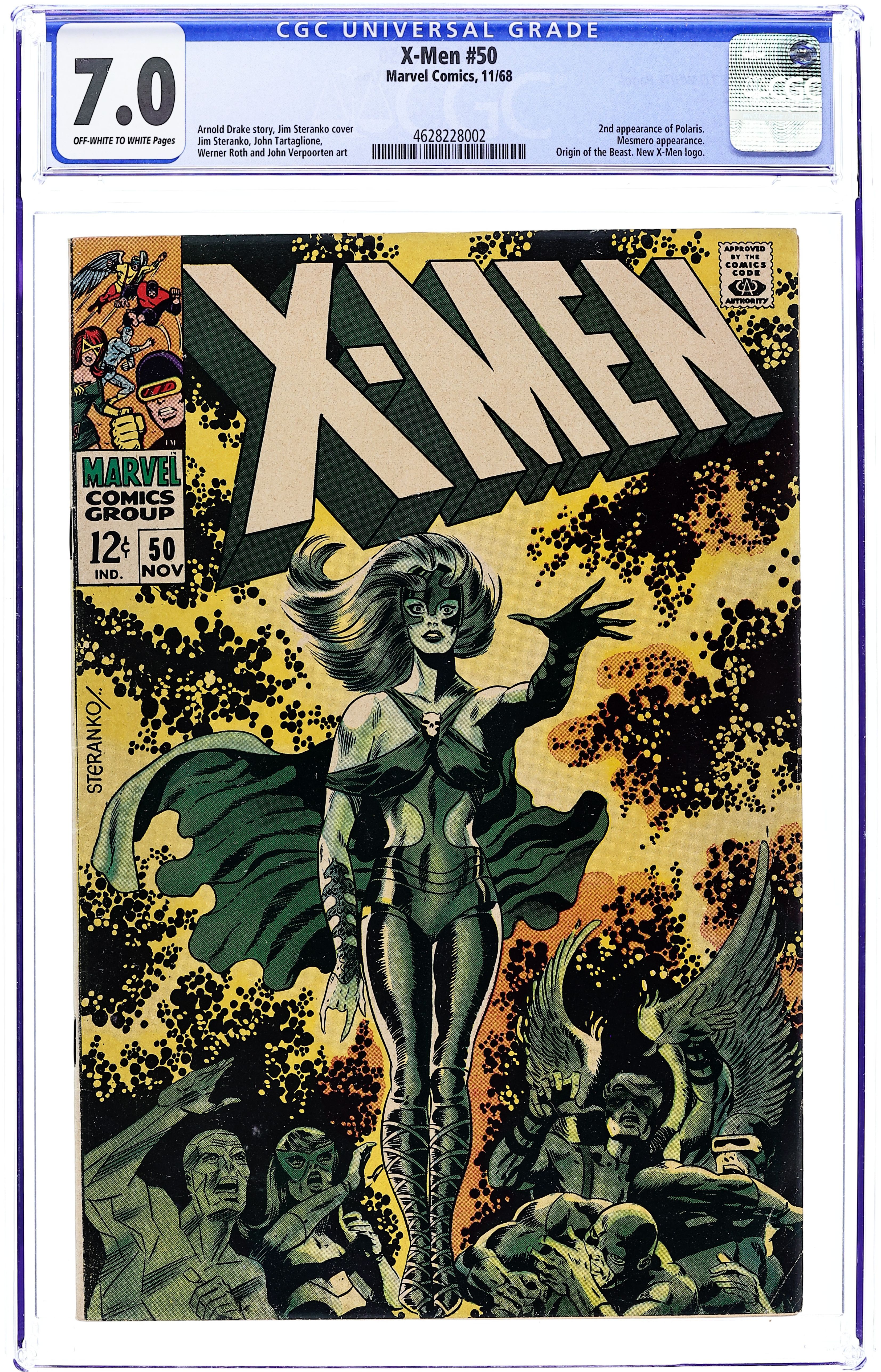 Starts Apr 4 First appearance of Lorna Dane (Polaris). Cover art by Jim Steranko. Who Dares Defy the Demi-Men?, script by Arnold Drake, pencils by Don Heck and Werner Roth, inks by John Tartaglione; Angel warns Jean about Cerebro beeping loudly, and she tells the other X-Men; a group commanded by Mesmero uses a machine (along with his powers) to turn latent mutants into full-fledged mutants in order to form his army; 1st appearance of Mesmero. A Beast Is Born--The Origins of the Uncanny X-Men, script by Arnold Drake, art by Werner Roth; how Beast got his powers. Letter to the editor from comic writer Tony Isabella. 36 pgs. $0.12. Cover price $0.12.