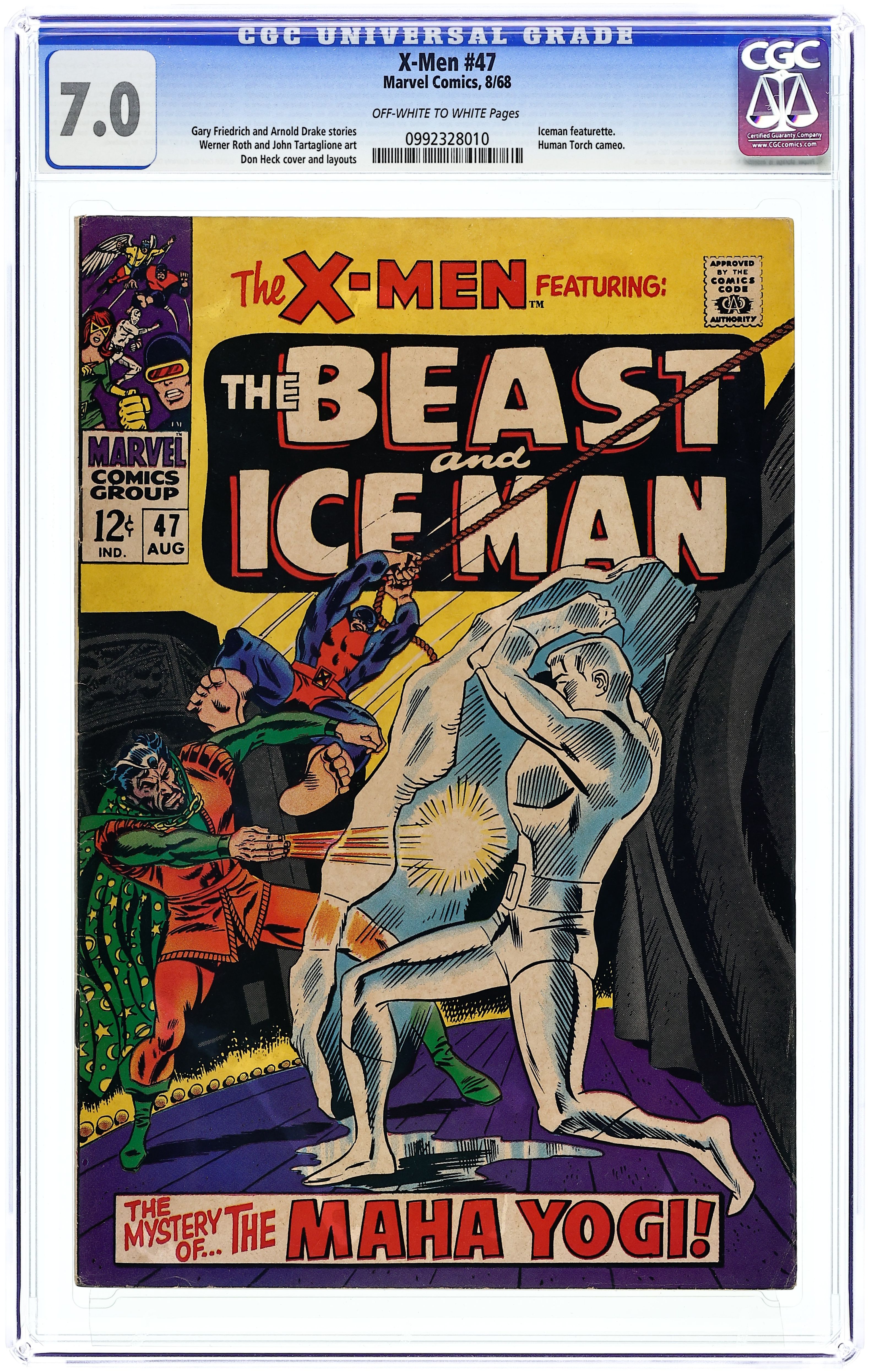 Cover pencils by Don Heck, inks by Frank Giacoia. The Warlock Wears Three Faces!, script by Gary Friedrich and Arnold Drake, pencils by Don Heck (layouts) and Werner Roth, inks by John Tartaglione; Iceman and Beast go with Vera and Zelda to watch Maha Yogi, a magician; Yogi, who is revealed to be Warlock, hypnotizes the crowd and everyone becomes a human bomb. I, the Iceman, script by Arnold Drake, pencils by Werner Roth, inks by John Verpoorten; explanation of Iceman's powers. 36 pgs. $0.12. Cover price $0.12.