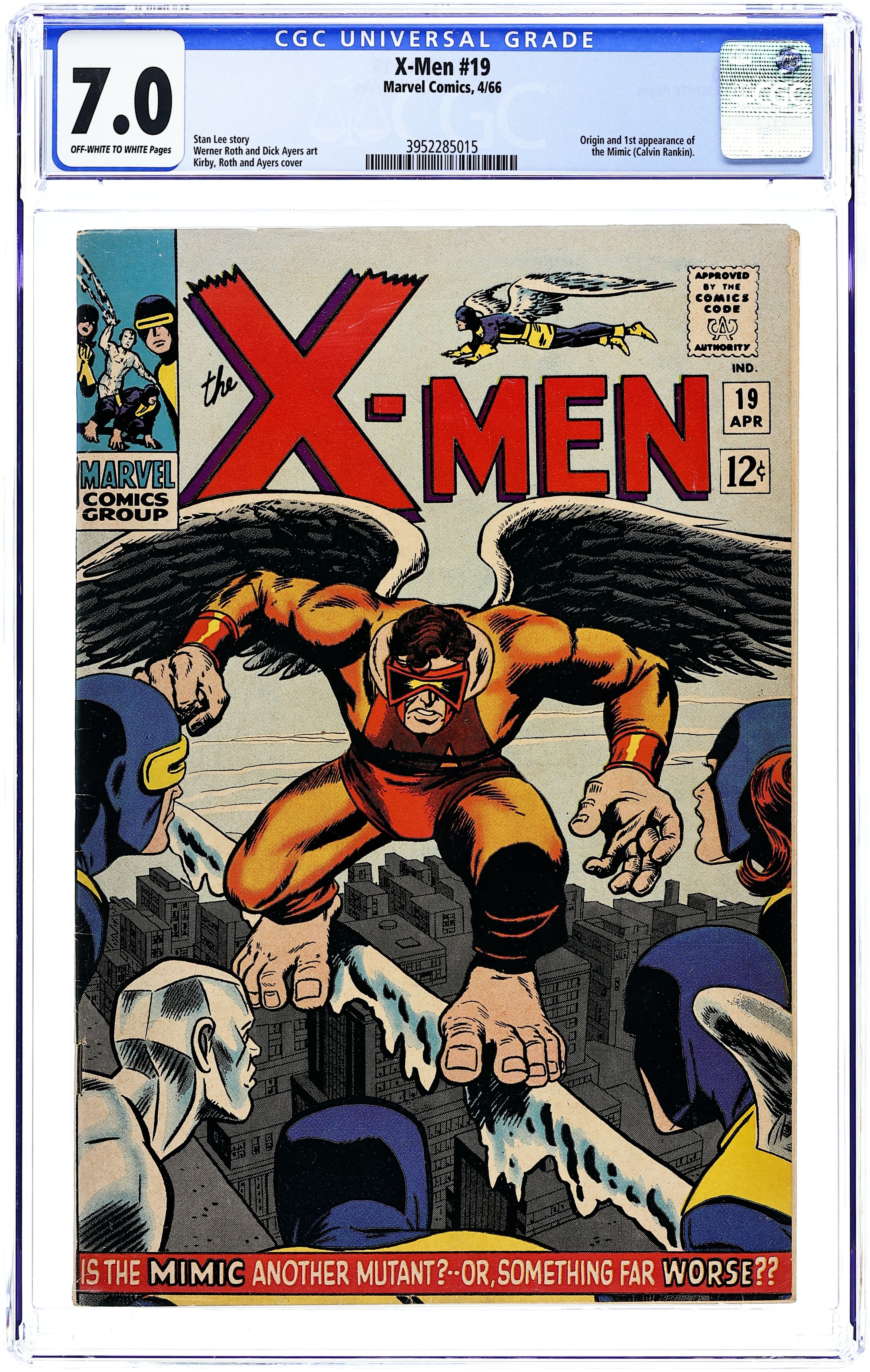 Starts Dec 15 Cover pencils by Jack Kirby (layouts) and Werner Roth, inks by Dick Ayers. Lo! Now Shall Appear--The Mimic!, script by Stan Lee, pencils by Werner Roth (as Jay Gavin), inks by Dick Ayers; The X-Men are off to take a vacation when Bobby and Hank tussle with the mysterious Calvin Rankin who beats them by mimicking their powers; Calvin then has an encounter with Jean at a restaurant; Realizing he is dealing with the X-Men, Calvin follows Jean home and asks to join the X-Men; once he has absorbed all of their powers, however, he battles them and captures Jean; The team follows him to his secret hideout deep in an old mine where Mimic uses their combined powers to uncover a machine his father built that will allow him to keep the X-Men's combined powers for good; Realizing something at the last minute, Xavier allows Mimic to use the machine which doesn't give him powers but, rather, strips his mimic powers away; 1st appearance of the Mimic. 36 pgs. $0.12. Cover price $0.12.