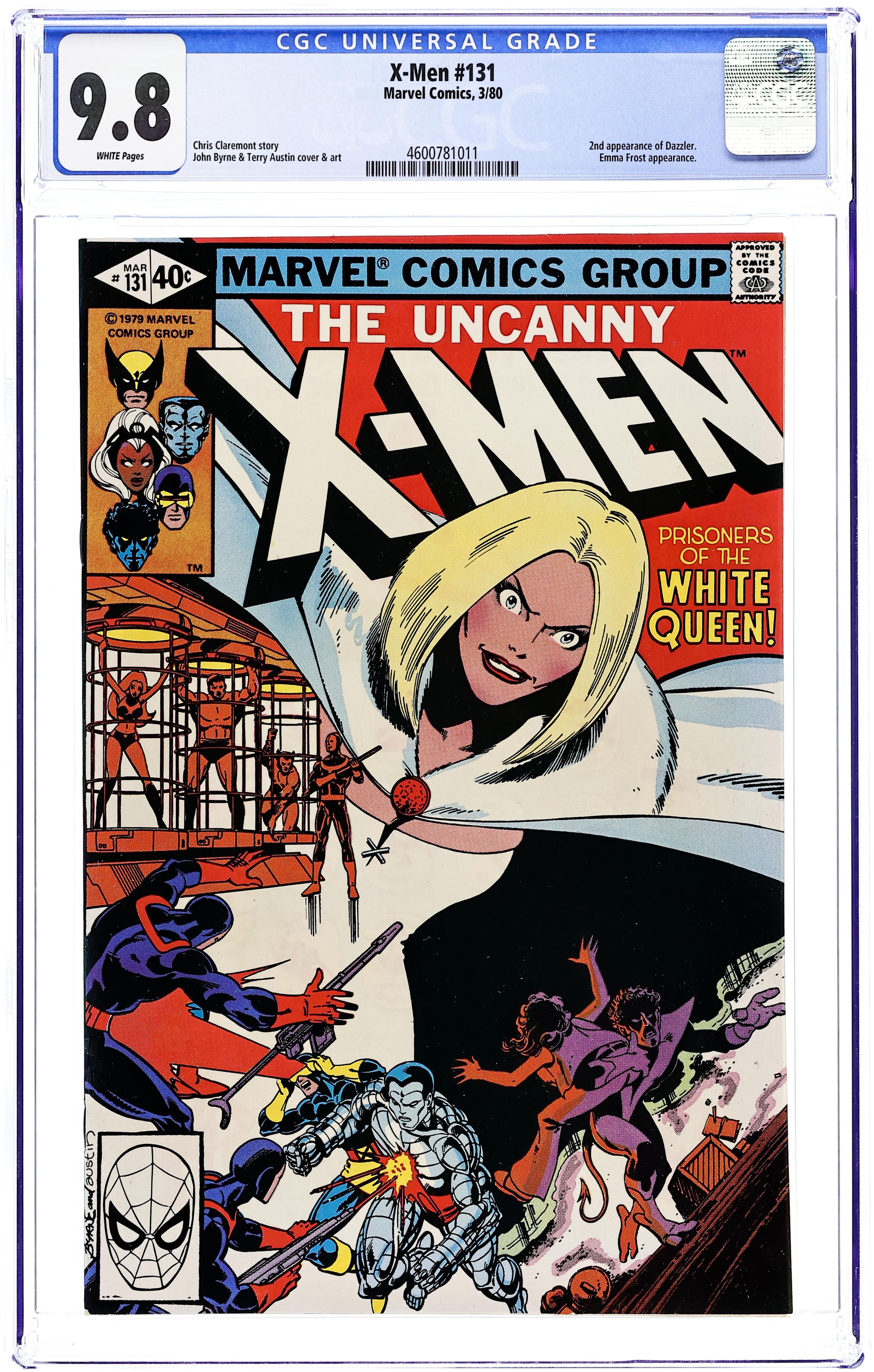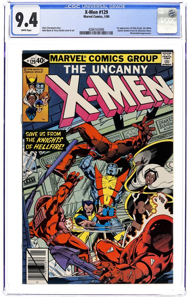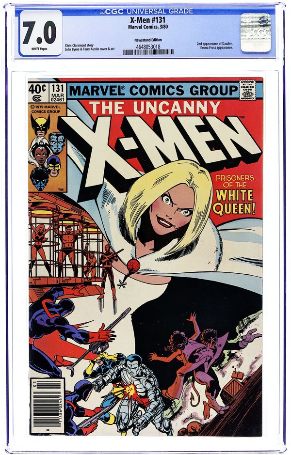 Newsstand Edition. The Dark Phoenix Saga: Part 1 of 9 - "God Spare the Children!" Story by Chris Claremont and John Byrne. Art by John Byrne and Terry Austin. This issue begins arguably the greatest and most tragic X-Men adventure of all time - The Dark Phoenix Saga. While the X-Men attempt to recruit a "New Mutant" by the name of Kitty Pryde, Wolverine, Colossus, and Storm are suddenly attacked by unknown assailants. What do these armored foes want, and who is the White Queen? 36 pages, full color. NOTE: 1st appearance of Kitty Pryde and Emma Frost, the White Queen. Cover price $0.40.