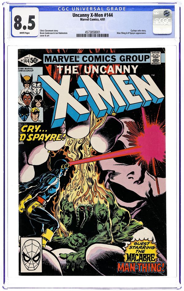 Newsstand Edition. "Even in Death!" Guest-starring the Man-Thing. Story by Chris Claremont. Art by Brent Anderson and Joe Rubinstein. Cyclops faces his fears in this macabre tale featuring the Man-Thing and the sinister D'Spayre. 36 pgs. Cover price $0.50.