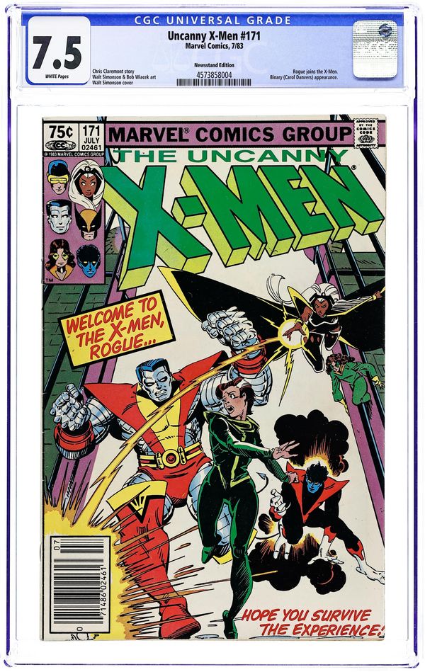 Newsstand Edition. "Rogue!" Guest-starring Binary. Story by Chris Claremont. Art by Walt Simonson and Bob Wiacek. Rogue has left the Brotherhood of Evil Mutants and arrives at the doorstep of Xavier's Institute seeking sanctuary and help from her erstwhile enemies, the X-Men. However, not everyone is prepared to welcome her with open arms, as the immensely powerful Binary returns for a little payback. Plus, Scott learns a peculiar secret about Madelyne. Cover price $0.60.