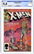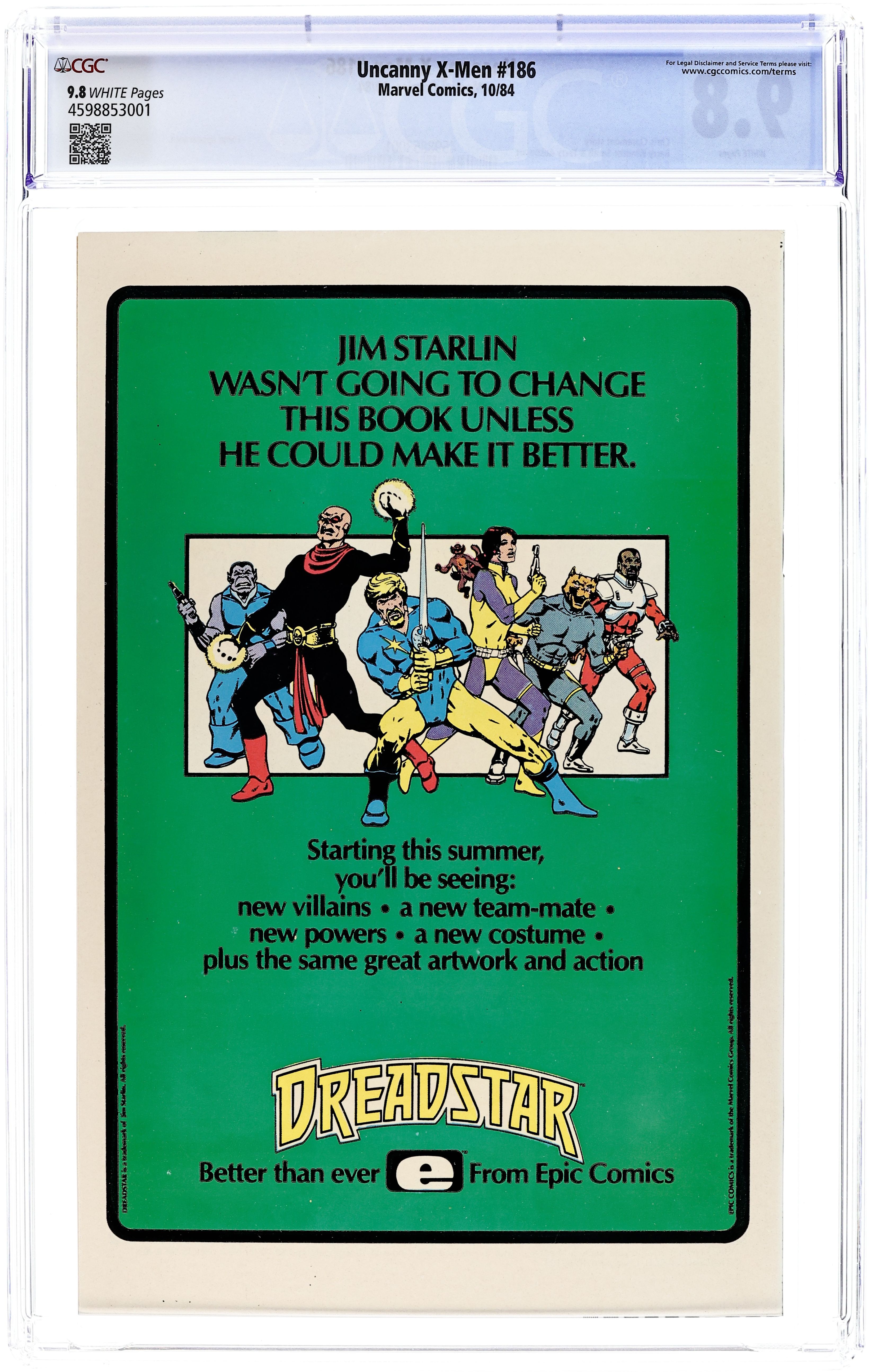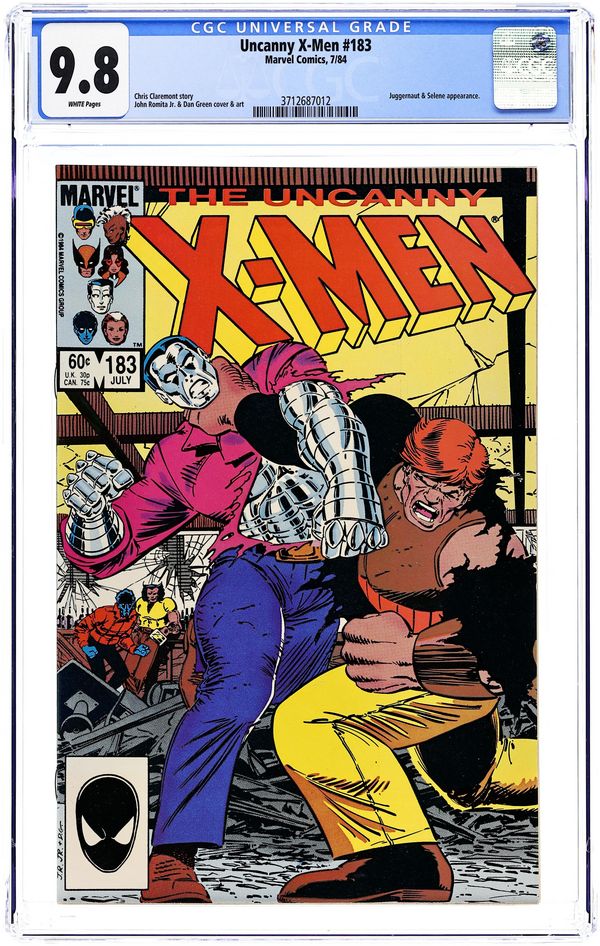 Direct Edition. "He'll Never Make Me Cry!" Story by Chris Claremont. Art by John Romita, Jr. and Dan Green. Peter reveals to Kitty his romantic affair with Zsaji, the beautiful alien healer he met on Battleworld (see Marvel Super Heroes Secret Wars [1984] #5), thus breaking the young girl's heart. Determined to set the boy straight, Wolverine and Nightcrawler take Peter out for a night on the town. Unfortunately, they end up at the same bar as the notorious Cain Marko. What follows is the most earthshaking battle between Colossus and the unstoppable Juggernaut ever seen. Plus, the introduction of a deadly new X-Men villain. 36 pgs. Cover price $0.60.