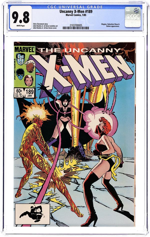 Direct Edition. "Two Girls Out to Have Fun!" Guest-starring Magma of the New Mutants. Story by Chris Claremont. Art by John Romita, Jr. and Dan Green. Rachel and the fiery mutant Magma battle the psychic-vampire Selene, the Black Queen of the Hellfire Club. Plus, more is revealed about the dystopian world of "Days of Future Past!" And, what ancient evil ceases the moment to reassert itself into the world of man? 36 pgs. Cover price $0.60.