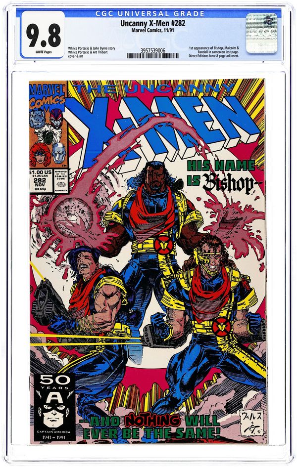 Direct Edition. "Payback!" Story by Whilce Portacio and John Byrne. Art by Whilce Portacio and Art Thibert. In one fell swoop the Upstarts have destroyed the Reavers and crippled the Hellfire Club. Next up, the Mutant Liberation Front. Who can stop these powerful new foes? Enter: Bishop! NOTE: 1st appearance of Bishop. 40 pgs. Cover price $1.00.