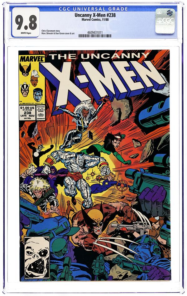 Direct Edition. "Busting Loose...!" Part 2 of 4. Story by Chris Claremont. Art and cover by Marc Silvestri and Dan Green. Rogue and Wolverine have been taken prisoner in Genosha, a nation where mutants are oppressed and enslaved. Can the X-Men's two toughest members manage to find a way to escape when their mutant abilities have been suppressed? Well, either they will...or they'll die trying. 36 pgs. Cover price $1.00.