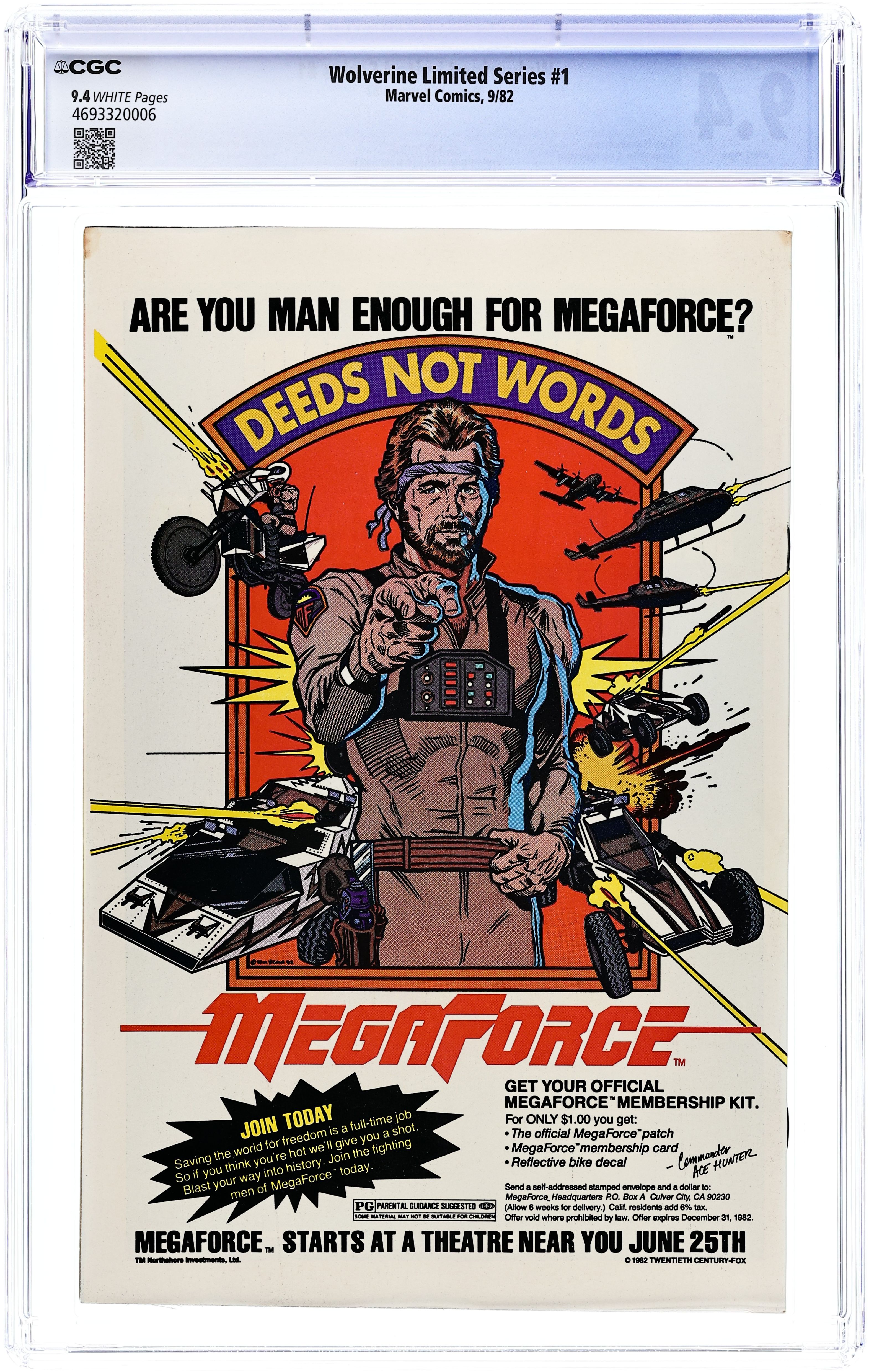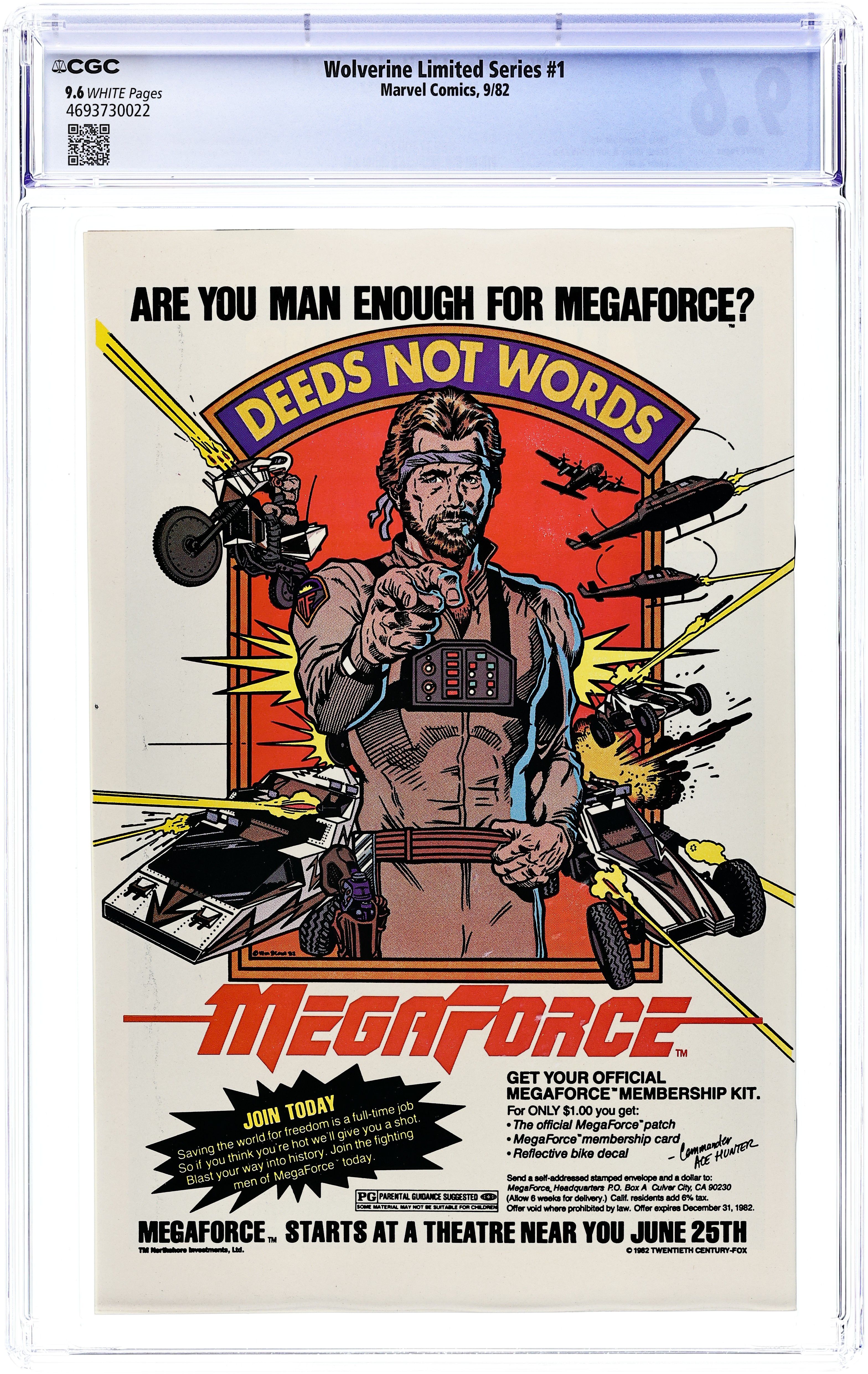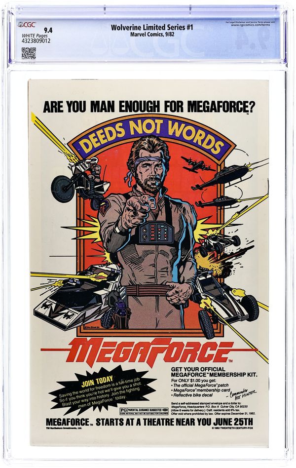 Newsstand Edition. 1 of 4 Featuring Wolverine in his first solo series fighting in Japan. "Wolverine." Script by Chris Claremont, pencils by Frank Miller, inks by Joe Rubinstein. Miller/Rubinstein cover. Back cover MegaForce ad with art by William Stout. Cover price $0.60.