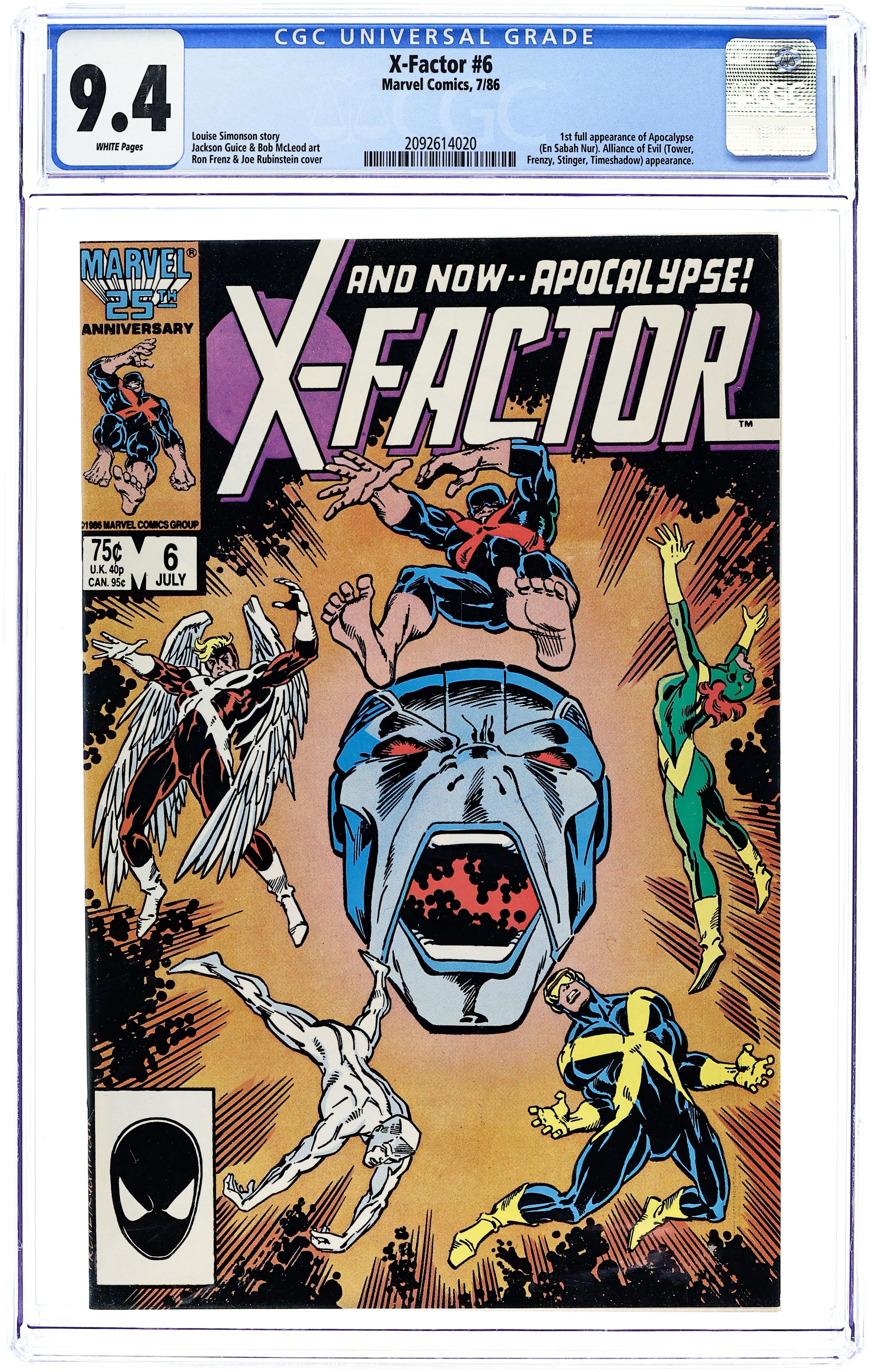 Newsstand Edition. "Tapped Out!" Part 1 of 2. 1st appearance of Apocalypse (shadowed cameo). Story by Bob Layton. Art by Jackson Guice and Joe Rubinstein. Cover by Ron Frenz and Joe Rubinstein. It's a classic super-hero/super-villain throw-down when X-Factor must battle the Alliance of Evil (Frenzy, Tower, Stinger, and Timeshadow) for the life of a mutant. Featuring a new menace by the name of Apocalypse, an evil mutant who will become a major thorn in the sides of the X-Men and X-Factor. Cover price $0.75.
