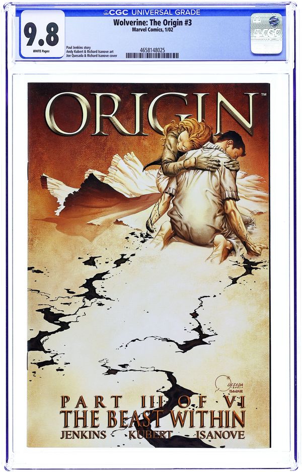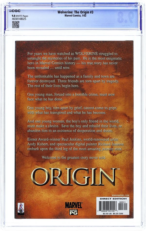 cover by joe quesada paul jenkins/andy kubert ? THE SCOOP: This origin you've all been waiting for continues! ? THE STORY: Wolverine's tale takes on an added dimension as new details are revealed about the mysterious man named Logan! What new secrets will be revealed in this issue? Everyone is going to be talking about the revelations made in this amazing series -- and this issue's secret could be the one to top them all! ? THE CREATORS: No one examines the psyche like Paul Jenkins (PETER PARKER: SPIDER-MAN, INHUMANS, SENTRY, etc.), so we've teamed him up with master X-Men artist Andy Kubert (ULTIMATE X-MEN)! We even got our own EIC, Joe Quesada, to draw the covers! ? THE FORMAT: Each chapter of this six-issue series will be 32 pages, with ads -- printed on glossy stock paper with a cardstock cover. 7-59606-05155-7-00311 (MarvelPG) 3.50 Cover price $3.50.