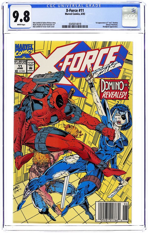 Newsstand Edition. First appearance of 'real' Domino (Neena Thurman). "Friendly Reminders" Cover pencils by Rob Liefeld, inks by Trevor Scott. Friendly Reminders, script by Rob Liefeld (Plot) by Fabian Nicieza, pencils by Mark Pacella, inks by Dan Panosian; Deadpool invades the X-Force complex to confront "Domino," really his old shapeshifting girlfriend Vanessa who has been spying on Cable and crew. Cover price $1.25.