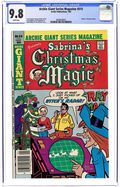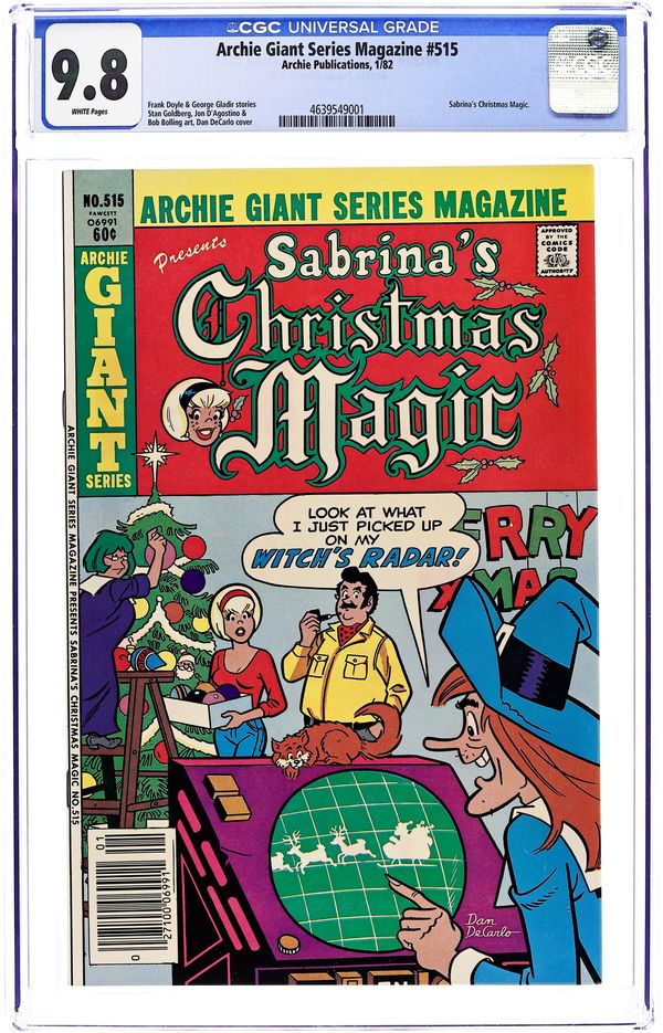 Sabrina's Christmas Magic. Cover art by Dan DeCarlo. "Spirited Sprite," script by Frank Doyle, pencils by Stan Goldberg, inks by Jon D'Agostino; Ambrose takes a job as a department store Santa and zaps up presents for everyone. "Initially Speaking" one-page story starring Li'l Jinx. "Wonder Worker," script by George Gladir, pencils by Bob Bolling; Sabrina meets one of Santa's elves. "Booty Duty" one-page story; Sabrina and Hilda fly to the North Pole to fill Santa's stocking for Christmas. "Holiday Spirit" starring Sabrina Spellman, Cousin Ambrose, and Hilda Spellman, script by George Gladir, pencils by Bob Bolling. Archie Club News. "With a Little Help from His Friends"; Hilda and Zelda help Santa deliver presents without him knowing about their help. 36 pgs., full color. Cover price $0.60.