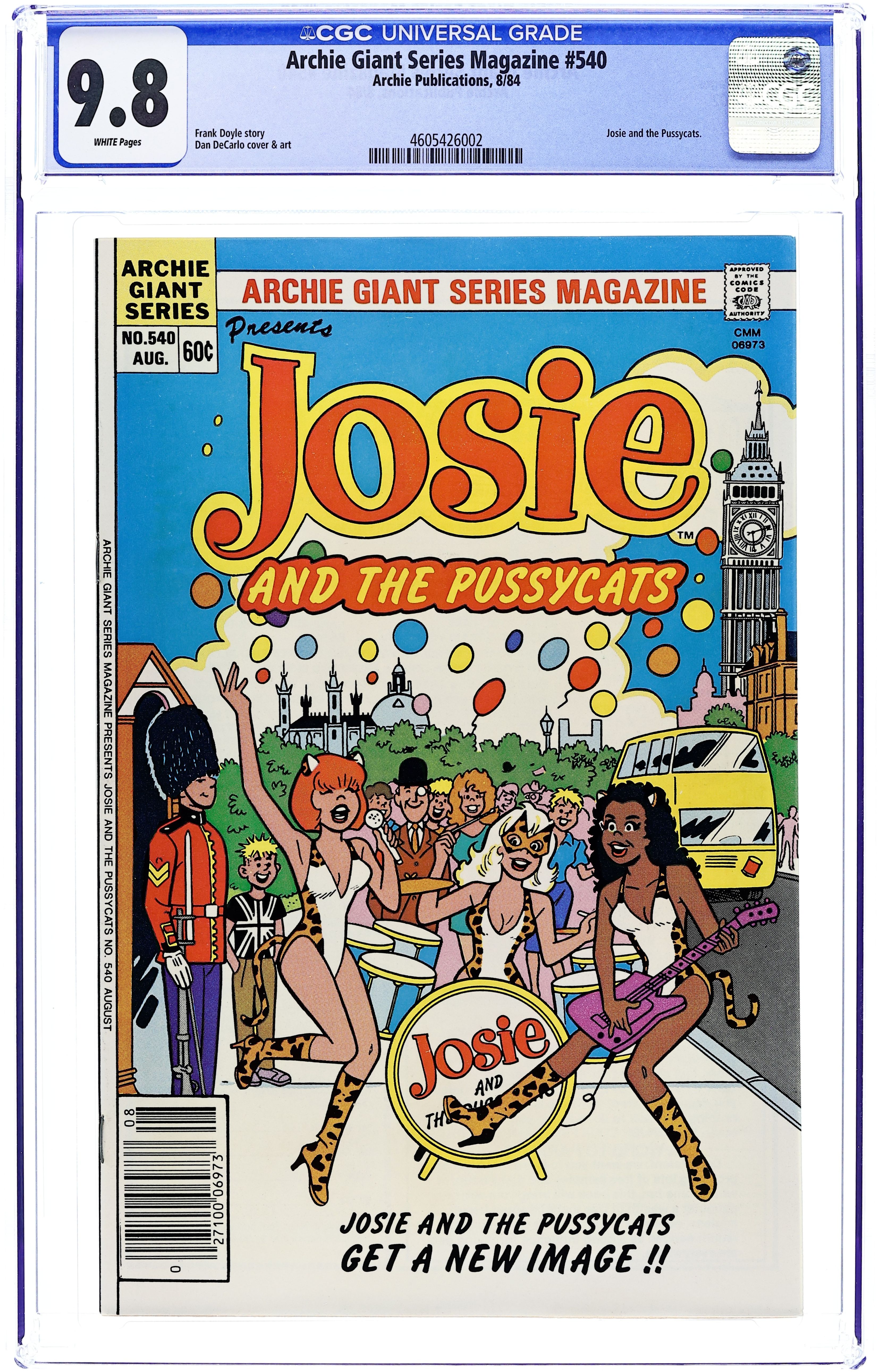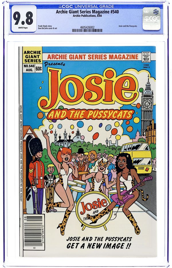 Josie and the Pussycats. "Down, Down, Down They Go," script by Frank Doyle, pencils by Dan DeCarlo, inks by Jim DeCarlo; The Pussycats announce that they're disbanding, due to being financially unable to continue. All-New Katy Keene Special ad. "Last Minute Reprieve," script by Frank Doyle, pencils by Dan DeCarlo, inks by Jim DeCarlo; Mr. Cabot reveals to his accountant that he's backing the Pussycats hoping that they'll lose a bundle of money and give him a juicy tax write-off. "A Hair-Raising Tale," script by Frank Doyle, pencils by Dan DeCarlo, inks by Jim DeCarlo; After their spending spree, the girls (accompanied by Alex and Alexandra) fly to London for their first gig. Pussycats Fashion Finds fashion page, art by Dan DeCarlo. "Nothing Like A Poor Winner," script by Frank Doyle, pencils by Dan DeCarlo, inks by Jim DeCarlo; Pipp Skweek gives the Cabots gifts that contain hidden diamonds, which he hopes the Cabots will smuggle unsuspectingly out of England. 36 pgs., full color. Cover price $0.60.