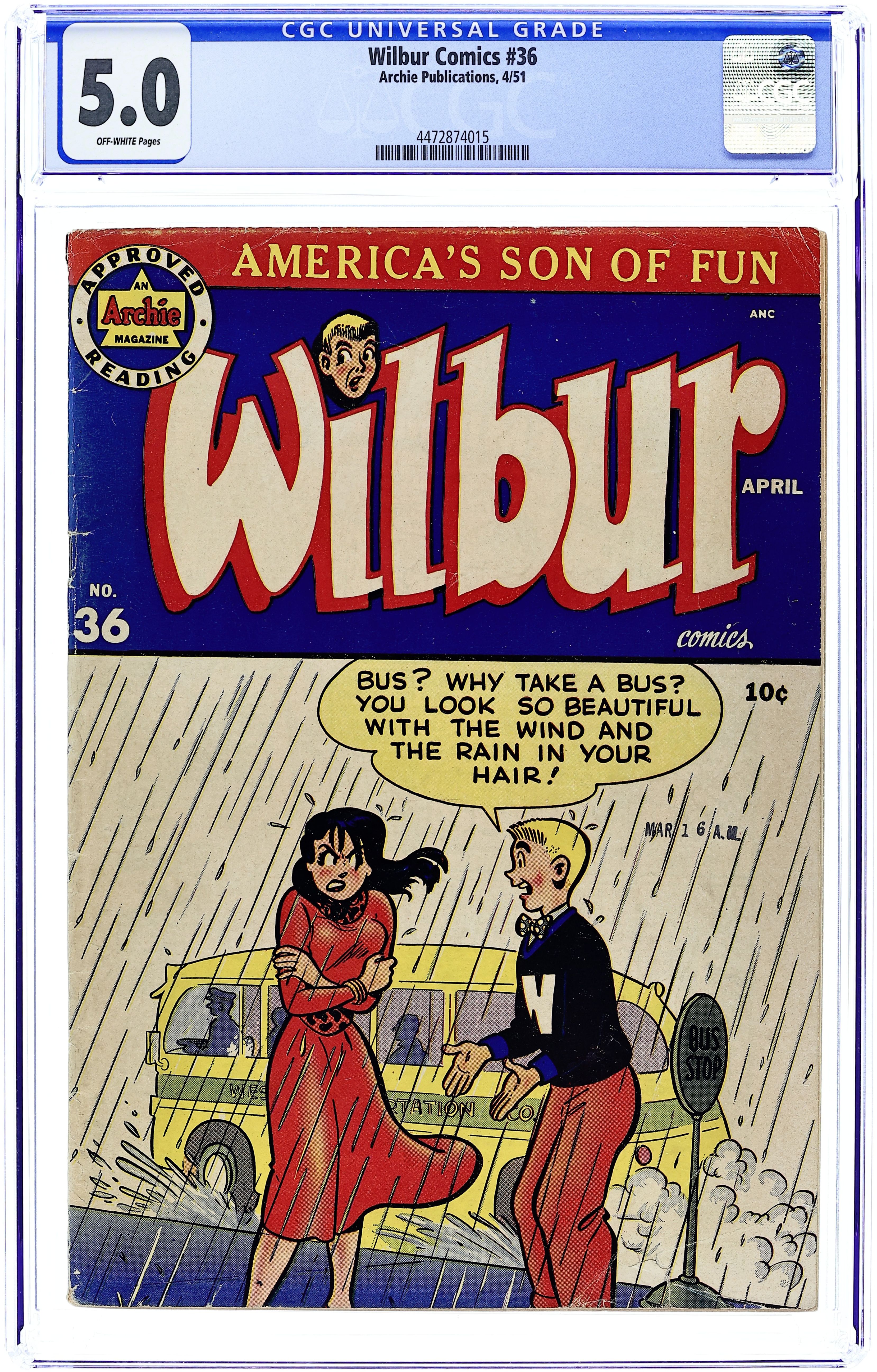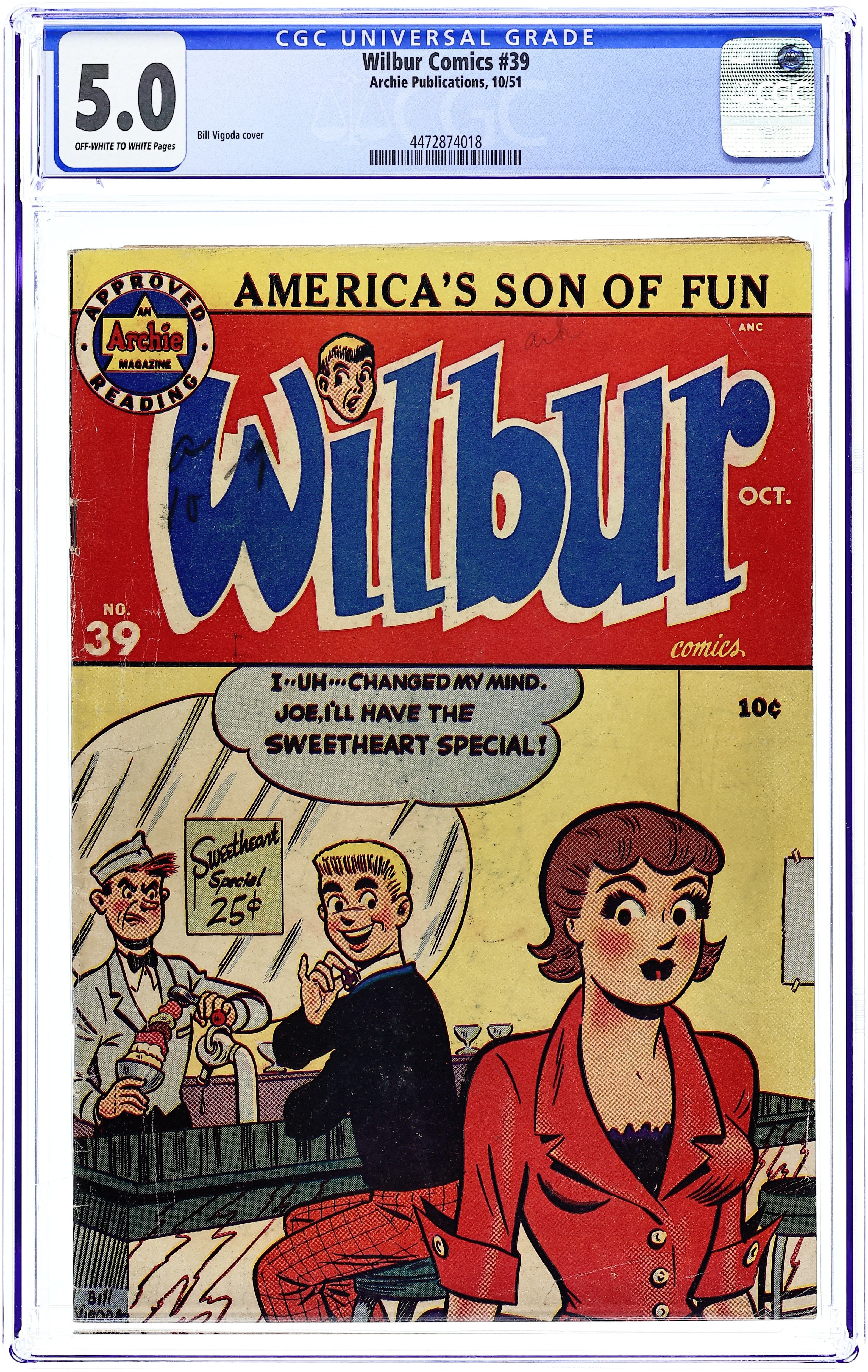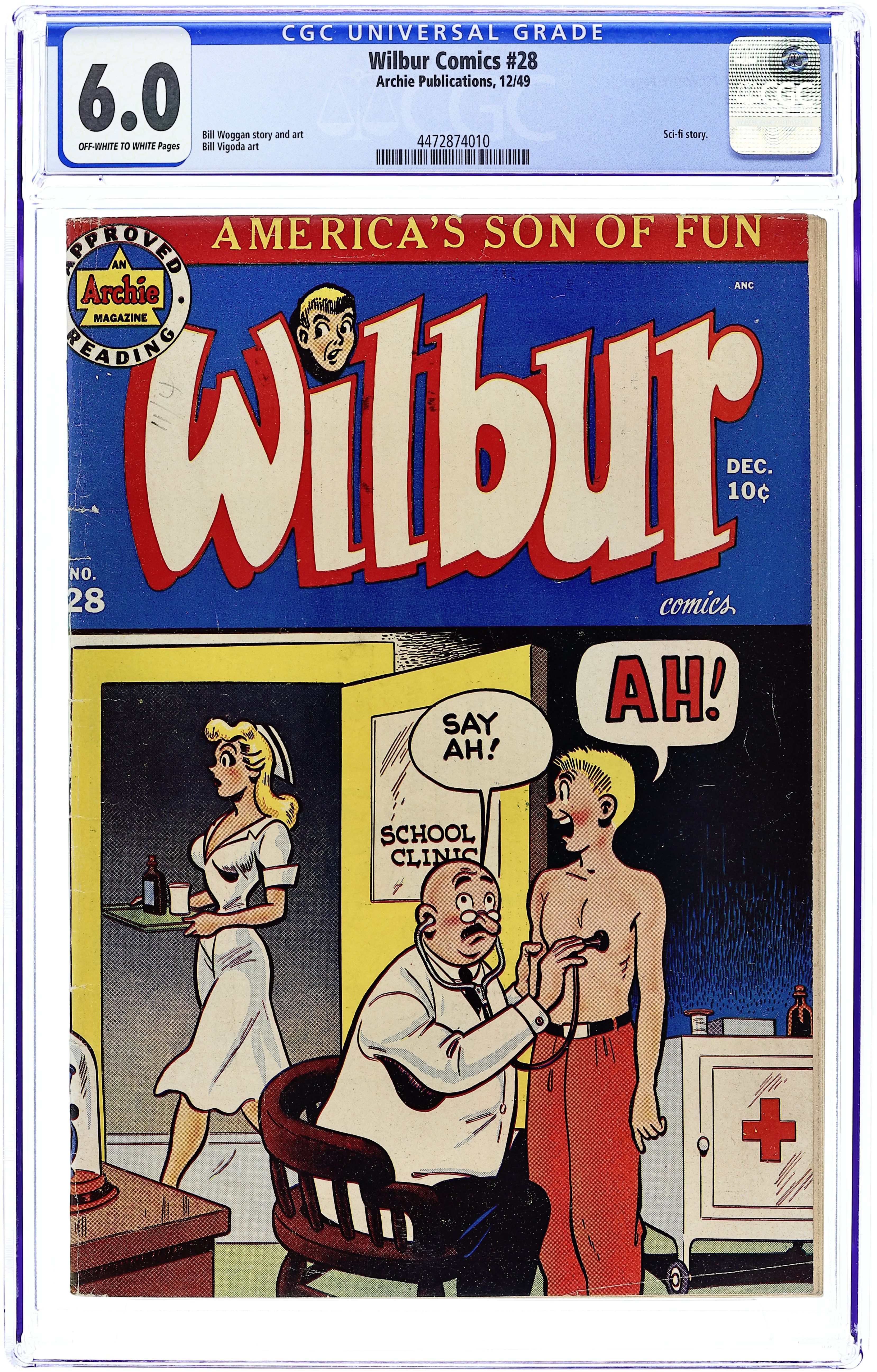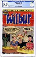 Cover by Al Fagaly. "About Face," art by Bill Vigoda; Wilbur begins a series of pranks when he gets his order of Plastimasks in the mail. "My Rhyme Is Your Rhyme," art by Bill Vigoda; The Nursery Rhyme Costume Dance at Westfield High School causes more trouble than Principal Dripwaite bargained for. Untitled story, art by Bill Vigoda; Laurie tries to win over Wilbur under the guise of doing research for her book. "Chicken Feed," art by Bill Vigoda; Wilbur tries to help Linda keep pests out of her garden. "Of Mice and Wilbur," art by Bill Vigoda; Wilbur tries to get on Mr. Dripwaite's good side by finding a bunch of cats to help rid the school of its mice epidemic. "Tell A Phone The Answer," art by Bill Vigoda; Radio contests and radio commercials add up to a headache for Mr. Wilkin. Untitled Katy Keene story, script and art by Bill Woggon; Sis models reader-submitted outfits to wear to a birthday party--and then eats all of the candy she was giving as a present before she arrives. 52 pgs., full color. Cover price $0.10.