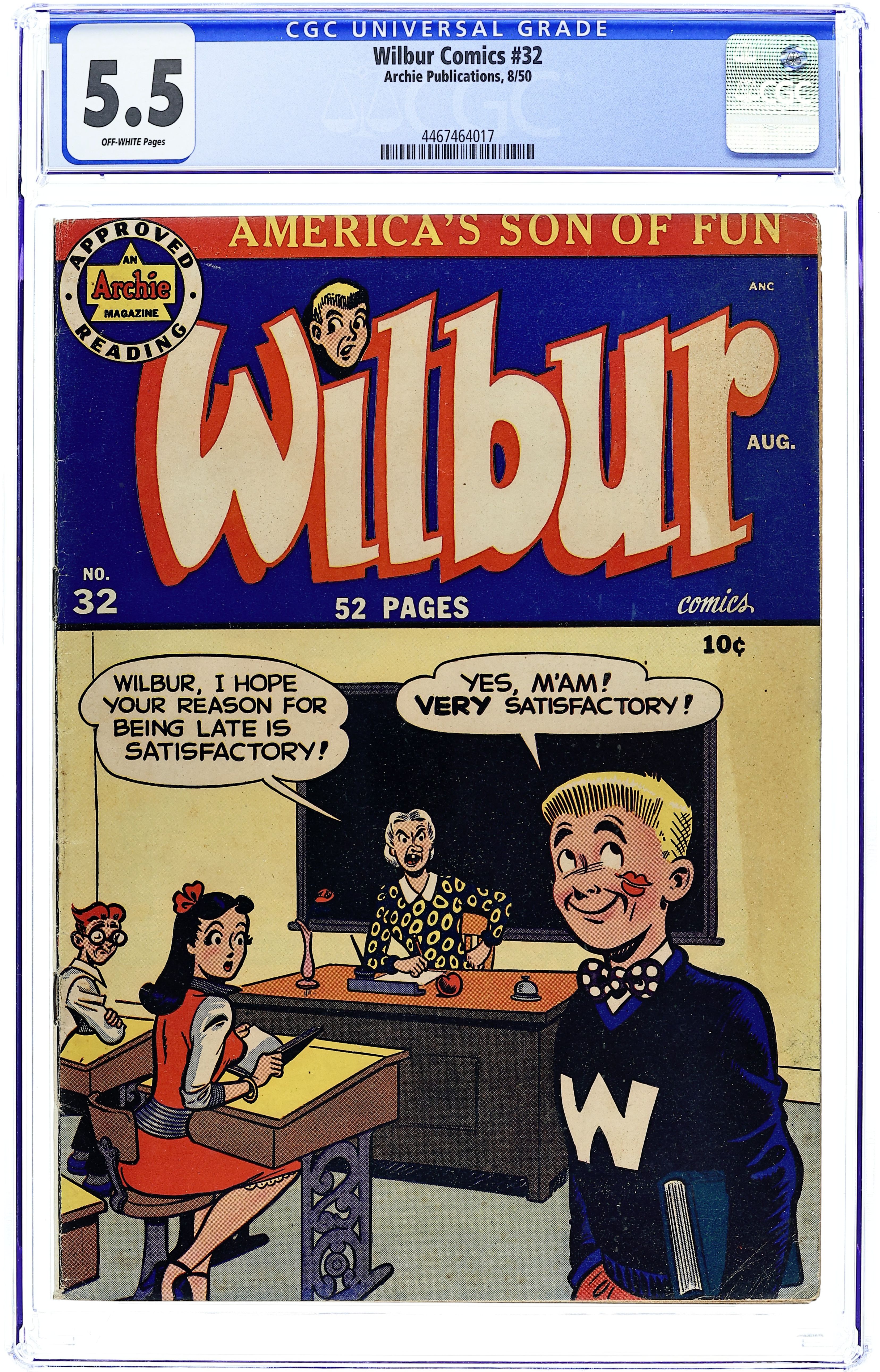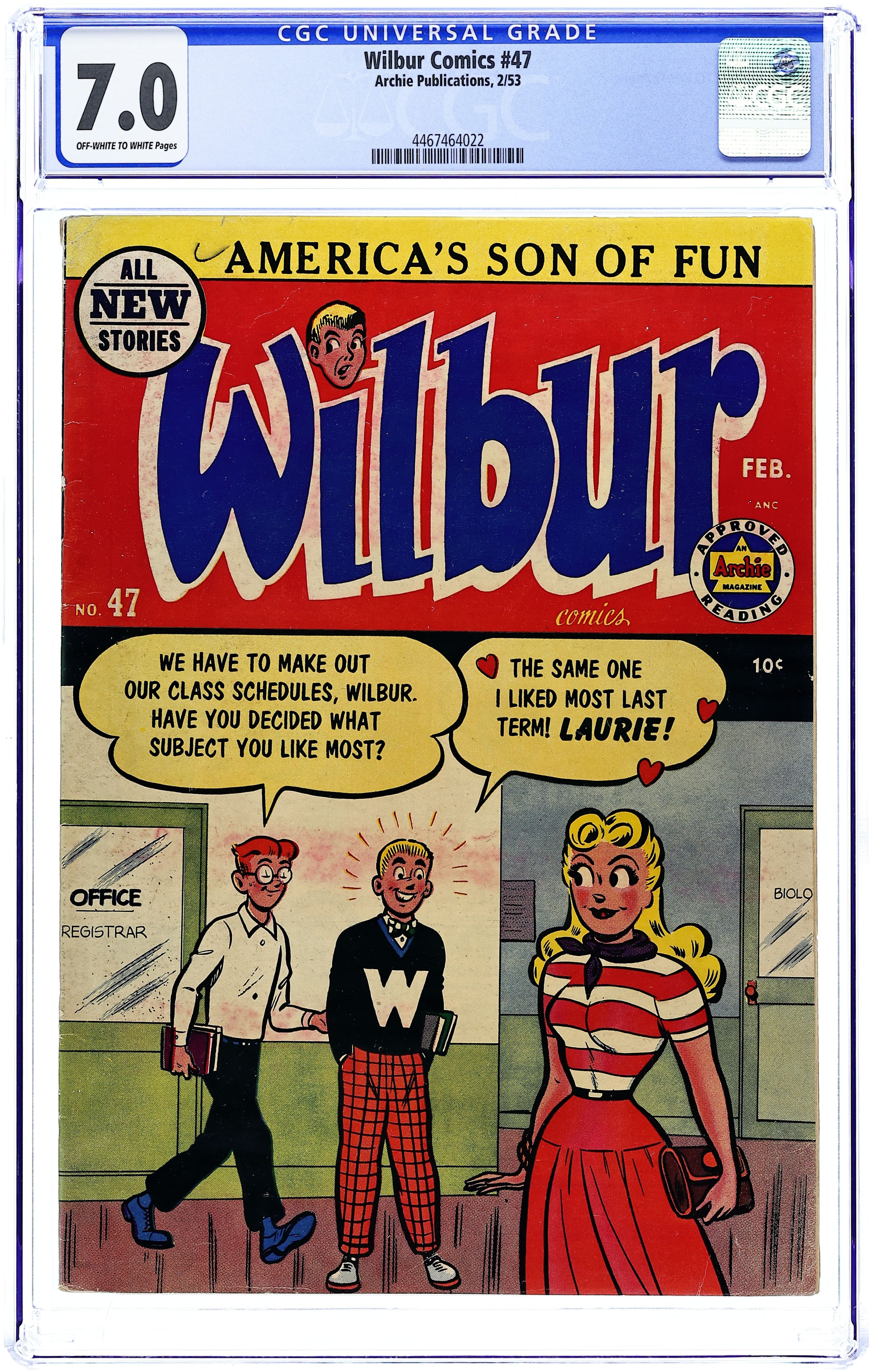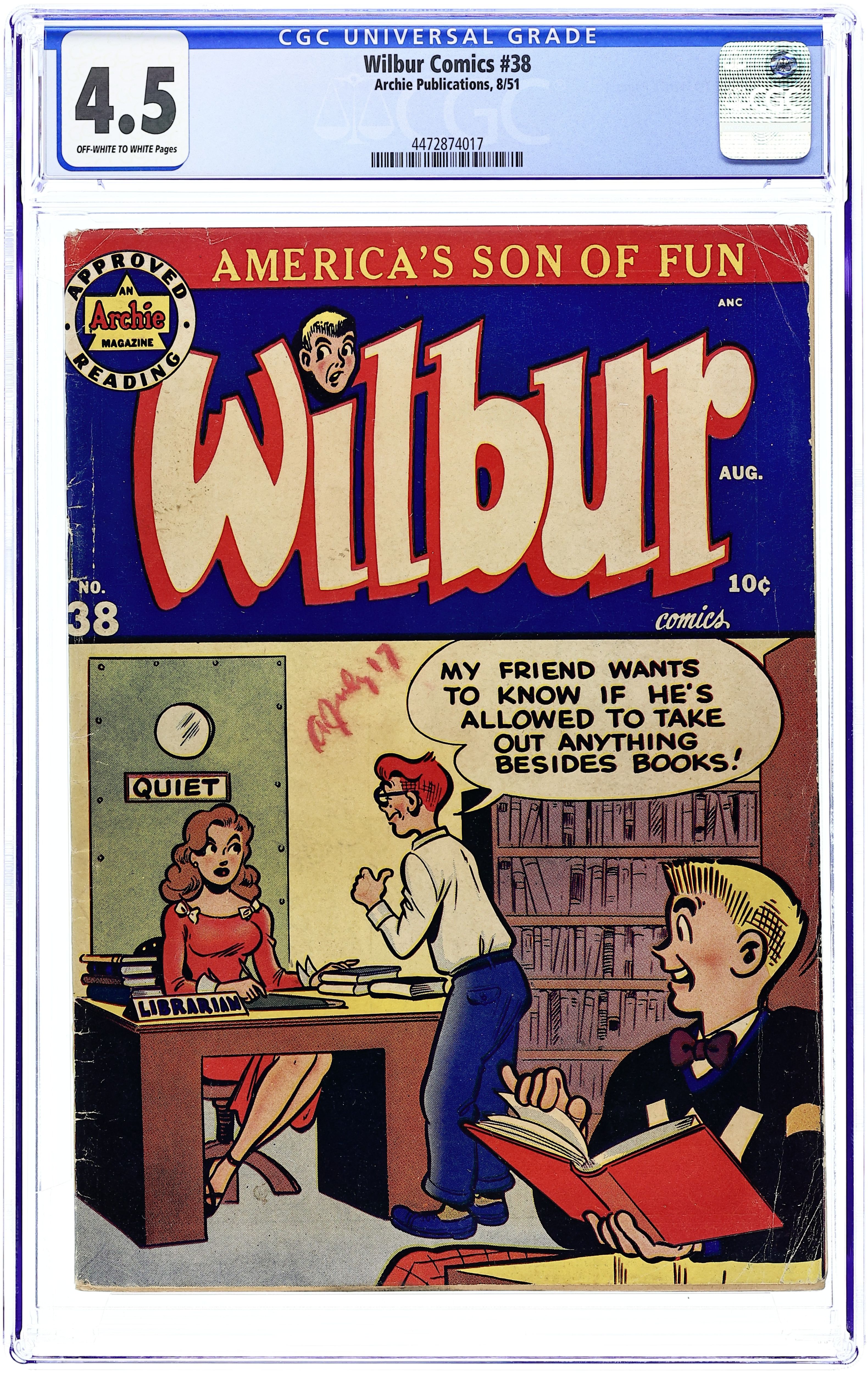 Cover by Al Fagaly. "About Face," art by Bill Vigoda; Wilbur begins a series of pranks when he gets his order of Plastimasks in the mail. "My Rhyme Is Your Rhyme," art by Bill Vigoda; The Nursery Rhyme Costume Dance at Westfield High School causes more trouble than Principal Dripwaite bargained for. Untitled story, art by Bill Vigoda; Laurie tries to win over Wilbur under the guise of doing research for her book. "Chicken Feed," art by Bill Vigoda; Wilbur tries to help Linda keep pests out of her garden. "Of Mice and Wilbur," art by Bill Vigoda; Wilbur tries to get on Mr. Dripwaite's good side by finding a bunch of cats to help rid the school of its mice epidemic. "Tell A Phone The Answer," art by Bill Vigoda; Radio contests and radio commercials add up to a headache for Mr. Wilkin. Untitled Katy Keene story, script and art by Bill Woggon; Sis models reader-submitted outfits to wear to a birthday party--and then eats all of the candy she was giving as a present before she arrives. 52 pgs., full color. Cover price $0.10.