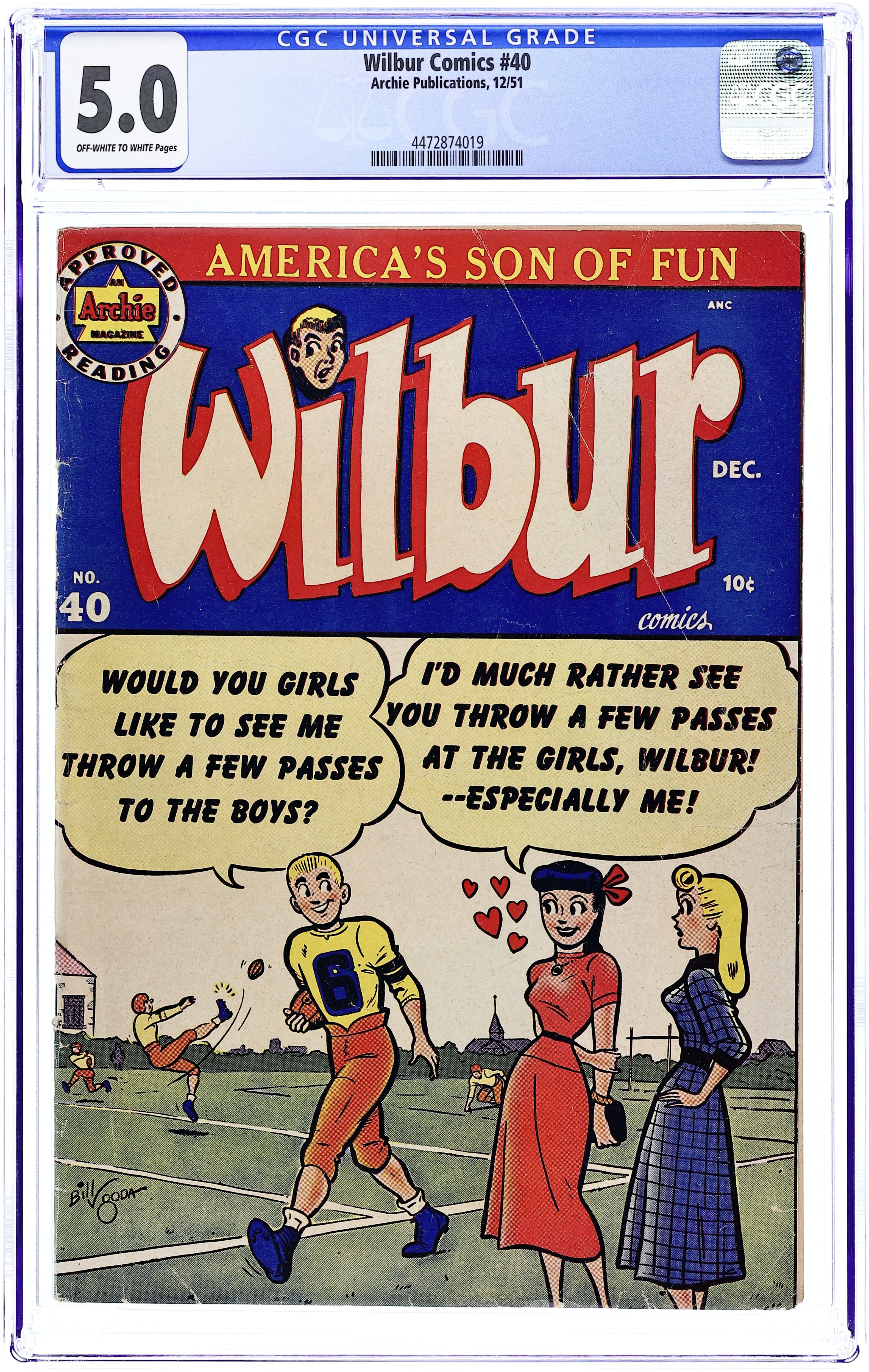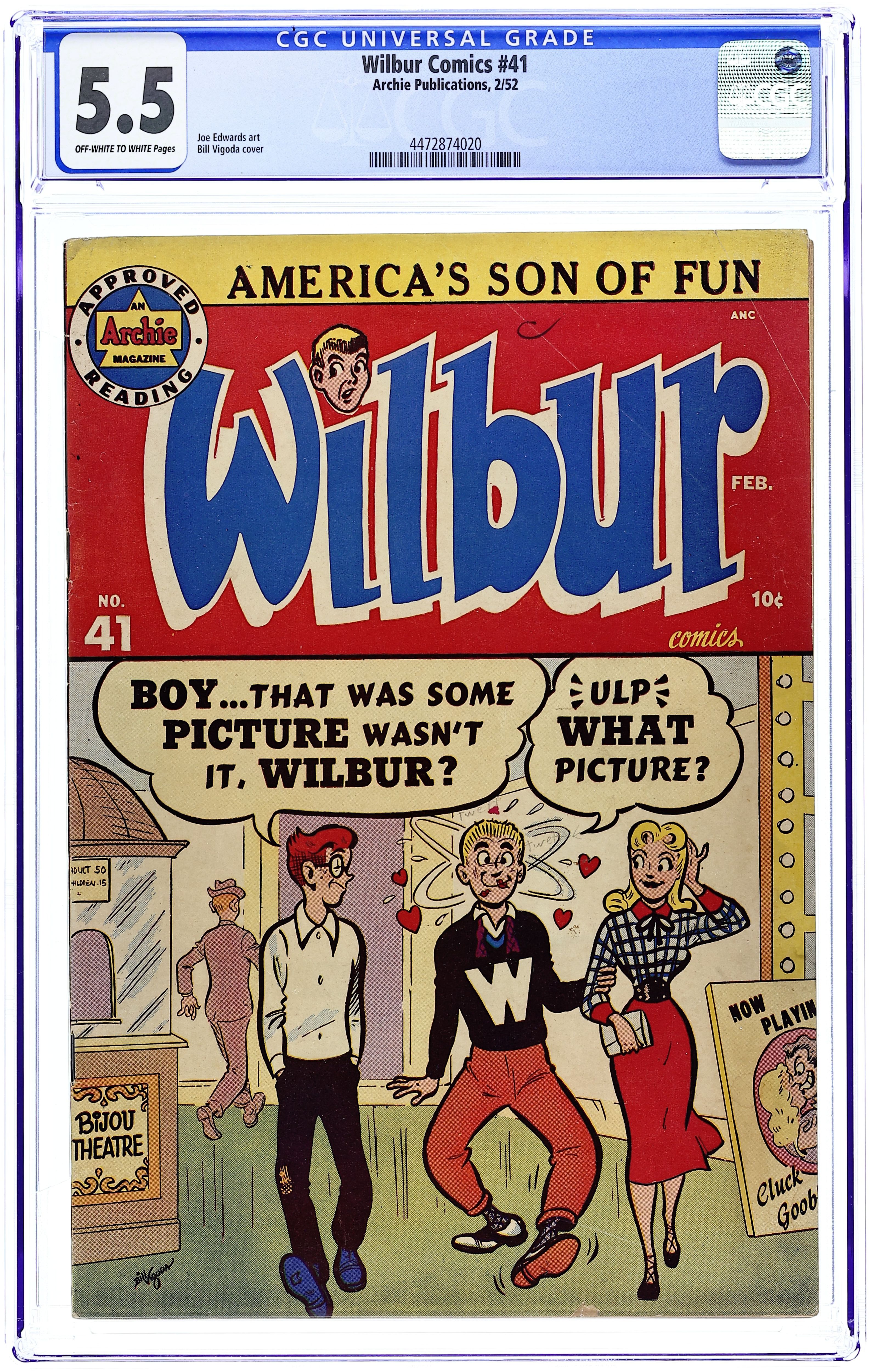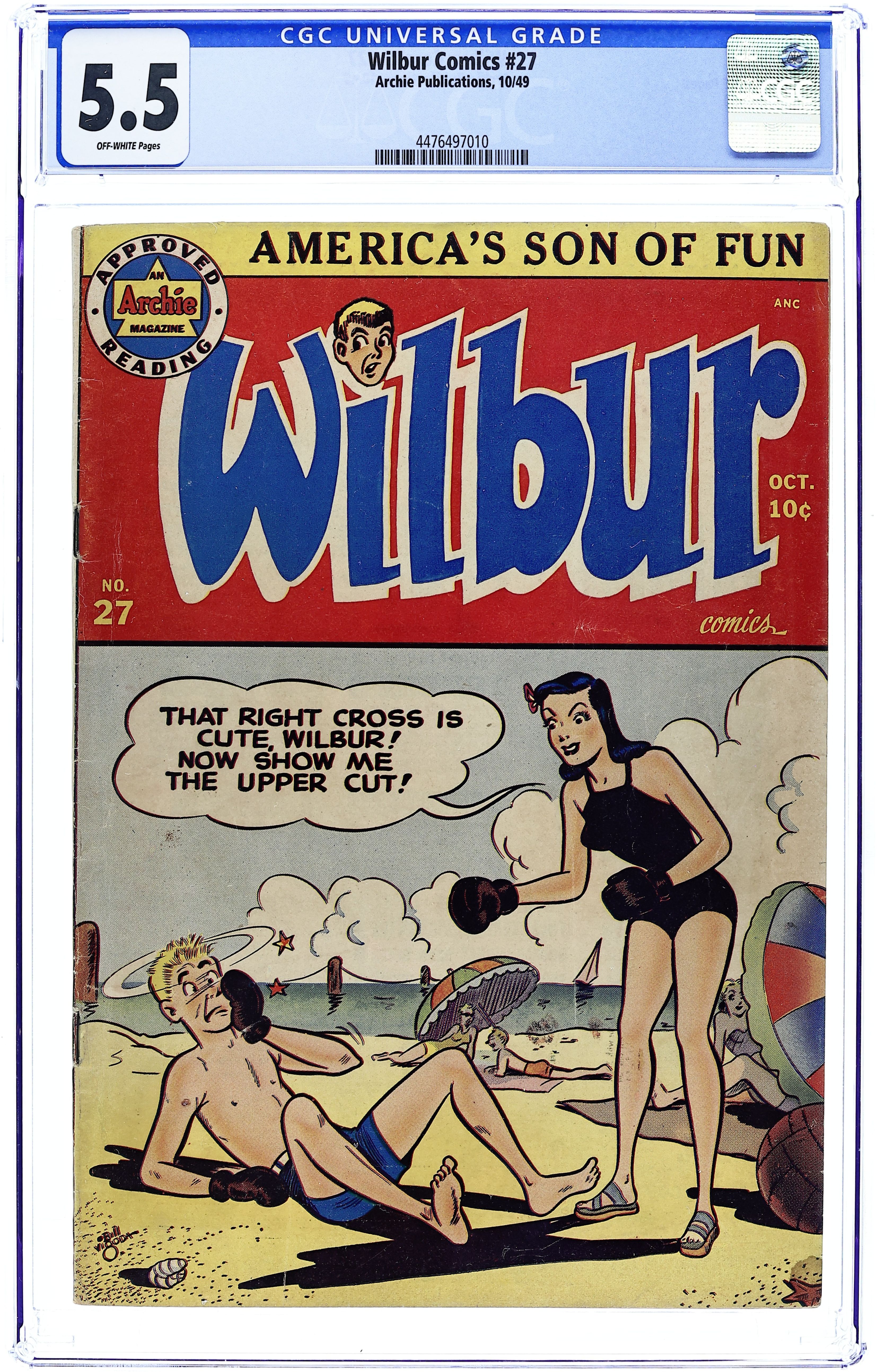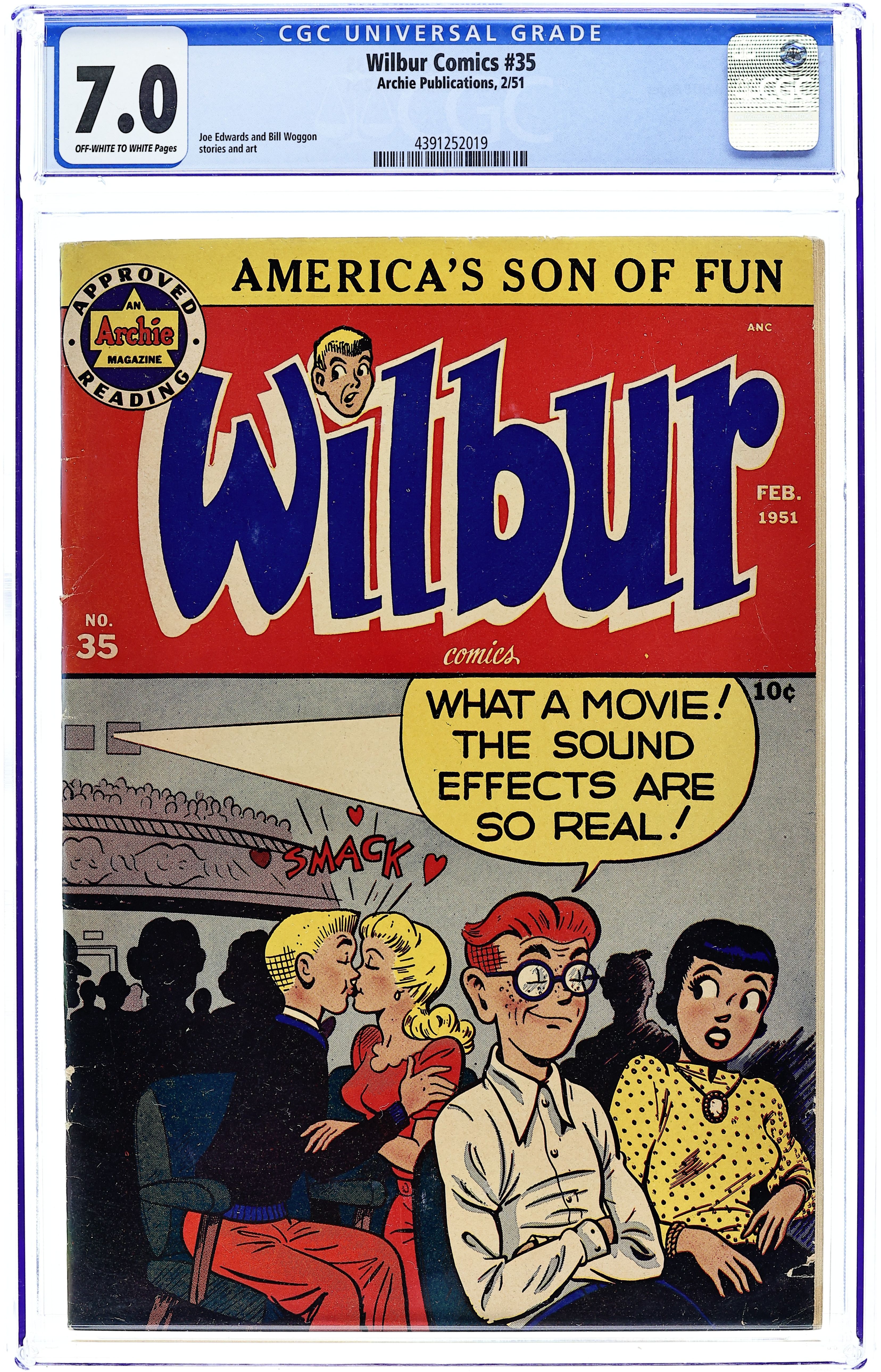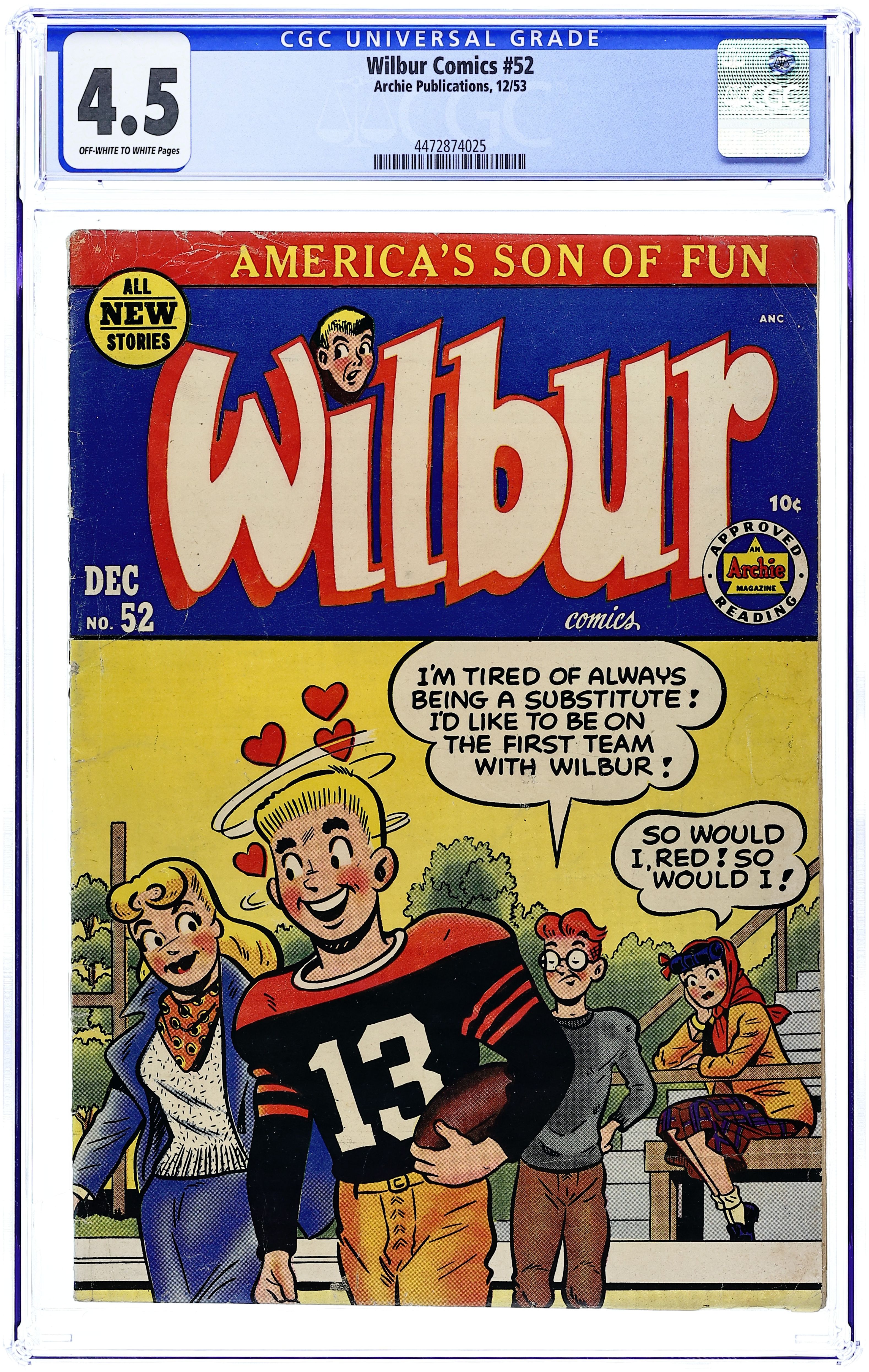 "The Hole Truth," pencils by Joe Edwards; Wilbur tries to go 24 hours without lying. "It Pays to be Sick," pencils by Joe Edwards; Wilbur tries to slightly injure himself so Laurie will visit him. "Snakes Alive," pencils by Joe Edwards; Wilbur gets in trouble with a toy snake prank. "The All American Town," pencils by Joe Edwards; Wilbur plays baseball. "Stuff About Stars" text article. "Wet Paint," pencils by Joe Edwards; Wilbur gets in trouble for testing a Wet Paint sign. "New Boy Friend" starring Katy Keene, art by Bill Woggon; Sis meets her new boyfriend Billy. Katy Keene cutout fashion designs. 52 pgs., full color. $0.10. Cover price $0.10.