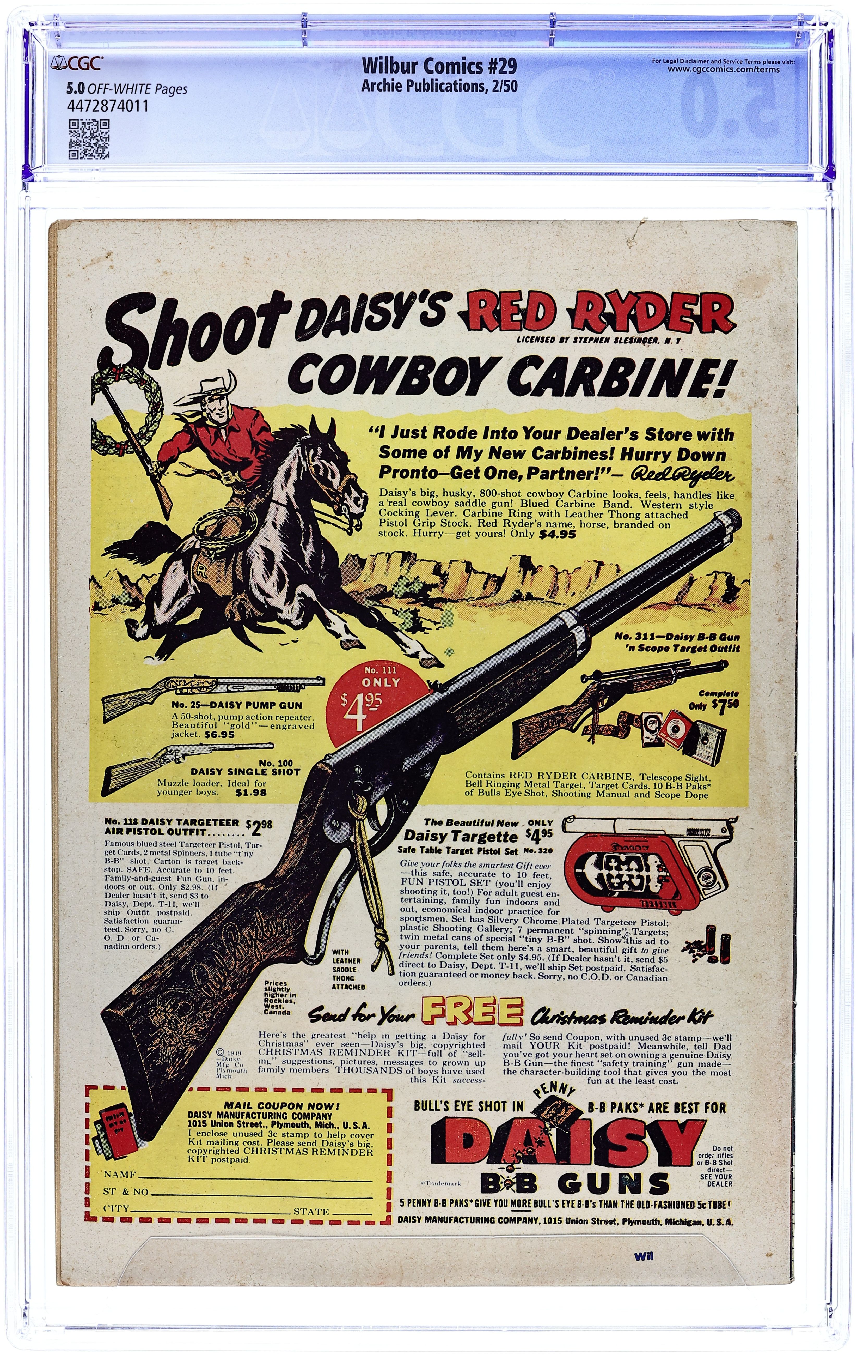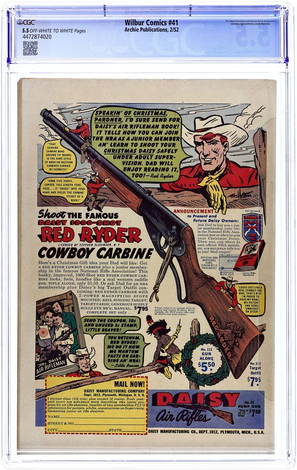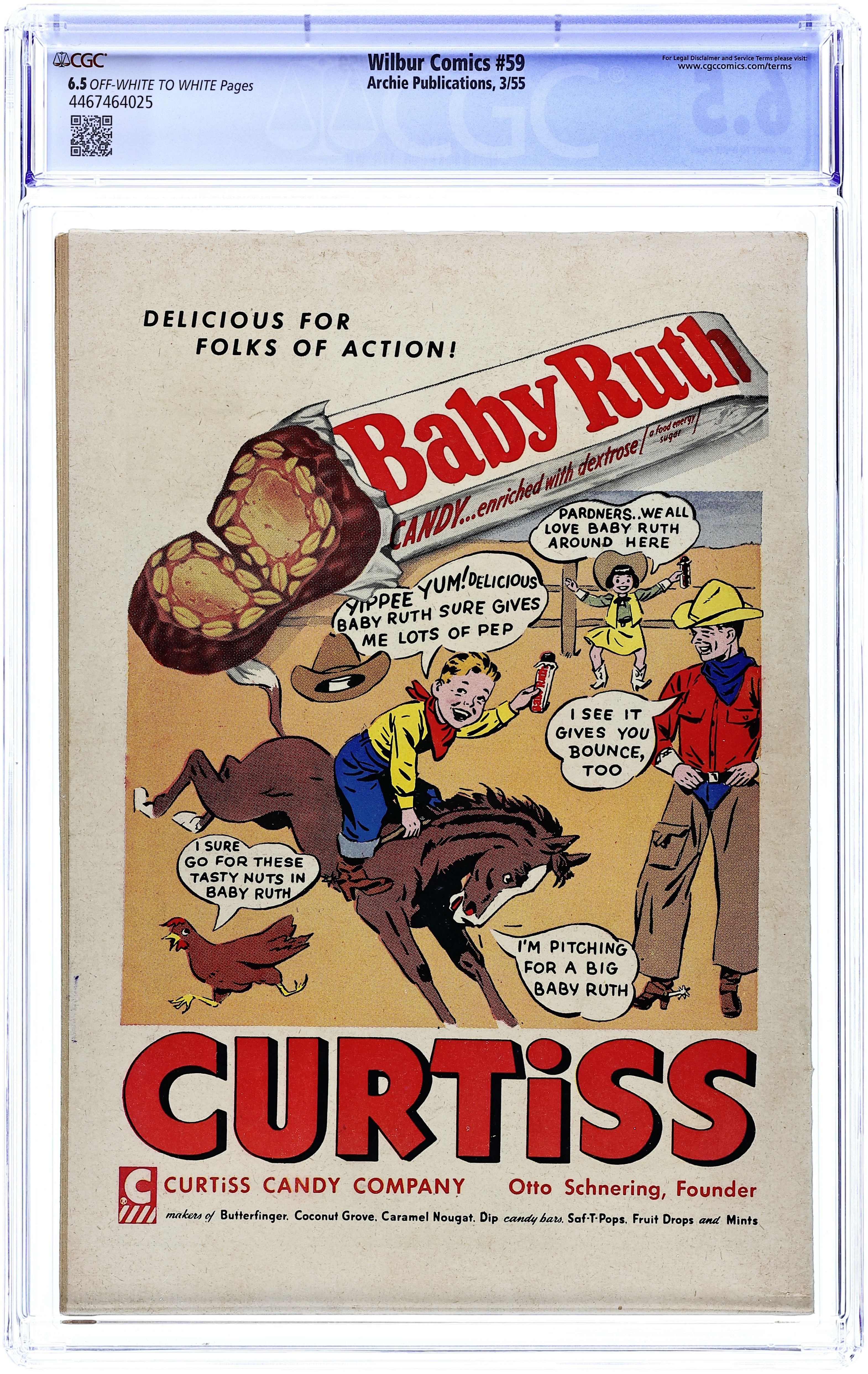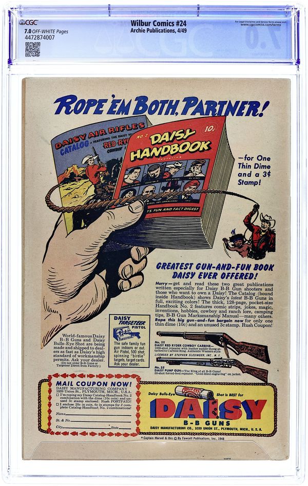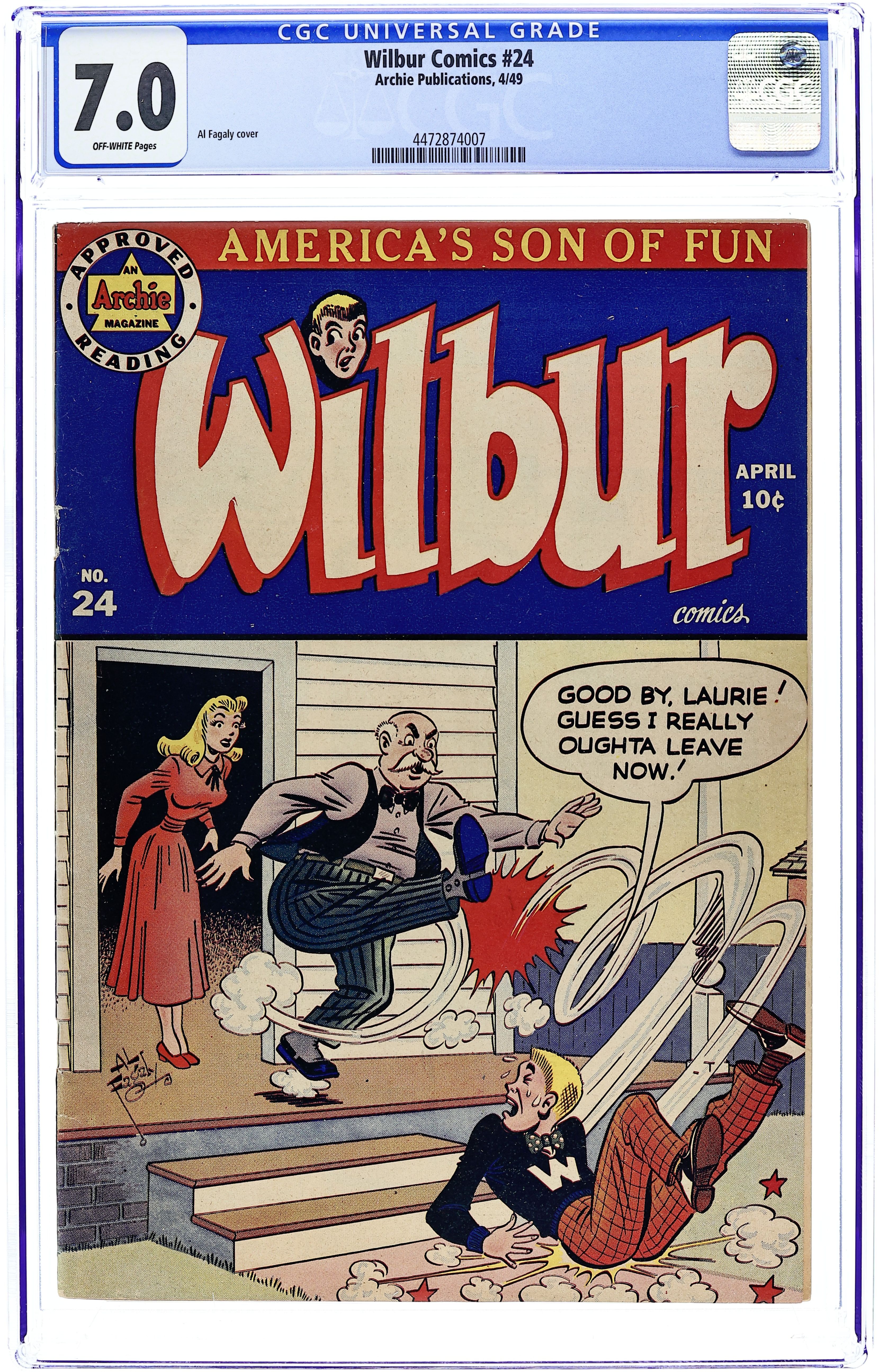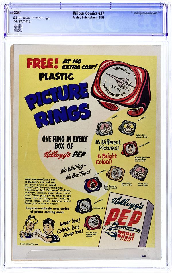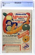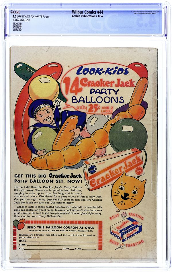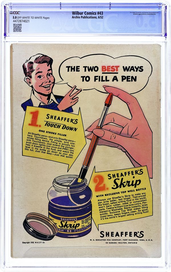 "The Hole Truth," pencils by Joe Edwards; Wilbur tries to go 24 hours without lying. "It Pays to be Sick," pencils by Joe Edwards; Wilbur tries to slightly injure himself so Laurie will visit him. "Snakes Alive," pencils by Joe Edwards; Wilbur gets in trouble with a toy snake prank. "The All American Town," pencils by Joe Edwards; Wilbur plays baseball. "Stuff About Stars" text article. "Wet Paint," pencils by Joe Edwards; Wilbur gets in trouble for testing a Wet Paint sign. "New Boy Friend" starring Katy Keene, art by Bill Woggon; Sis meets her new boyfriend Billy. Katy Keene cutout fashion designs. 52 pgs., full color. $0.10. Cover price $0.10.