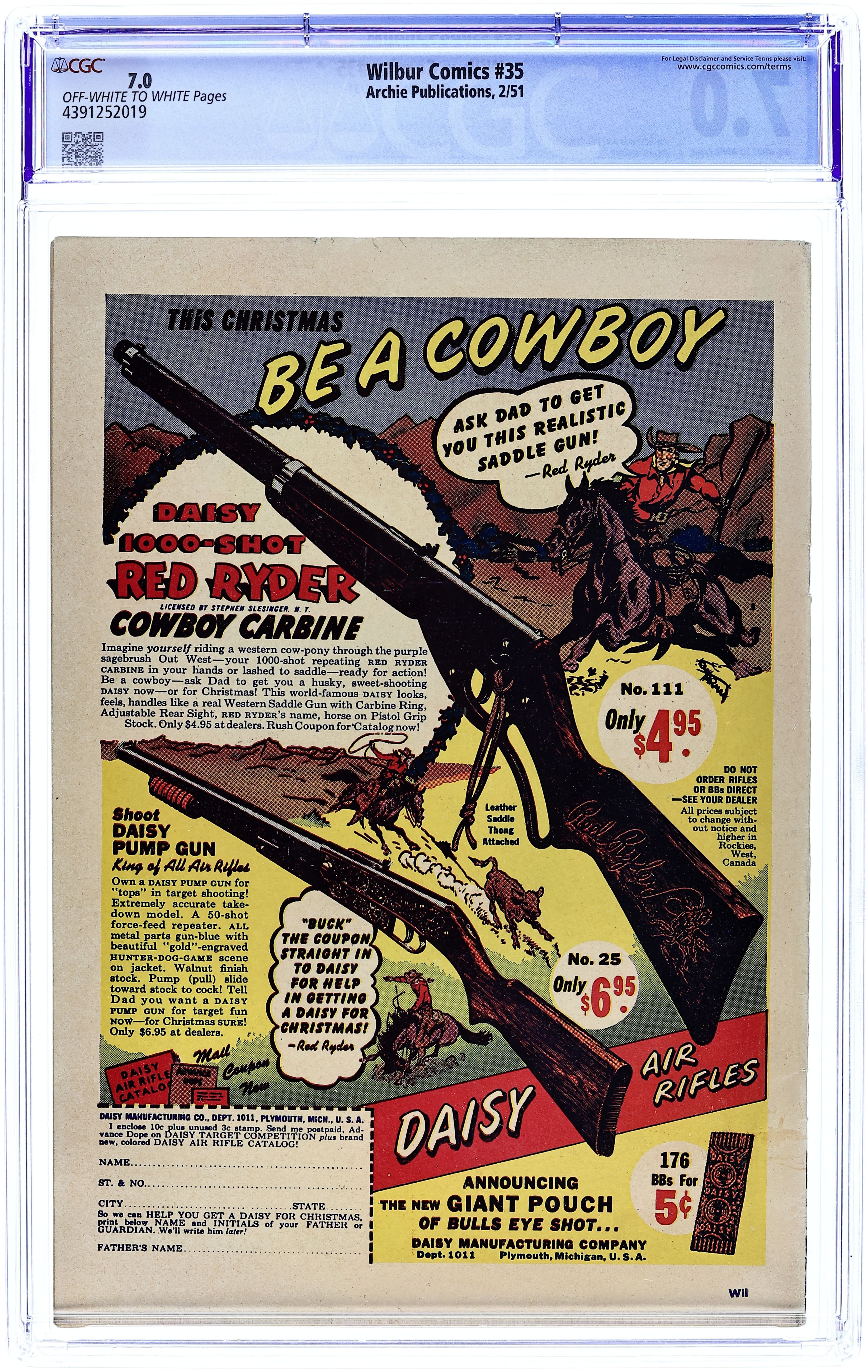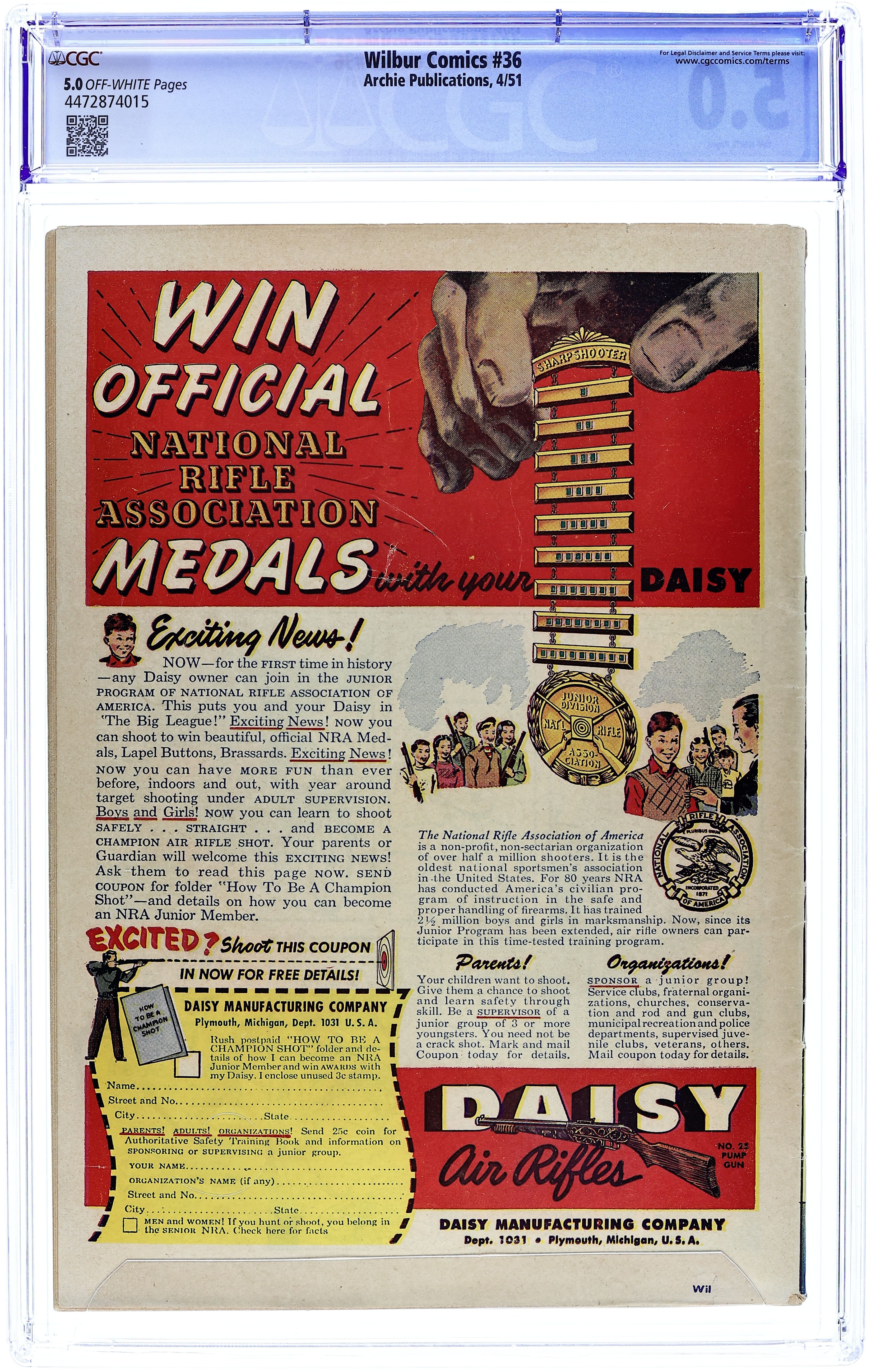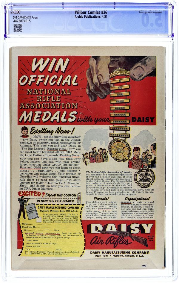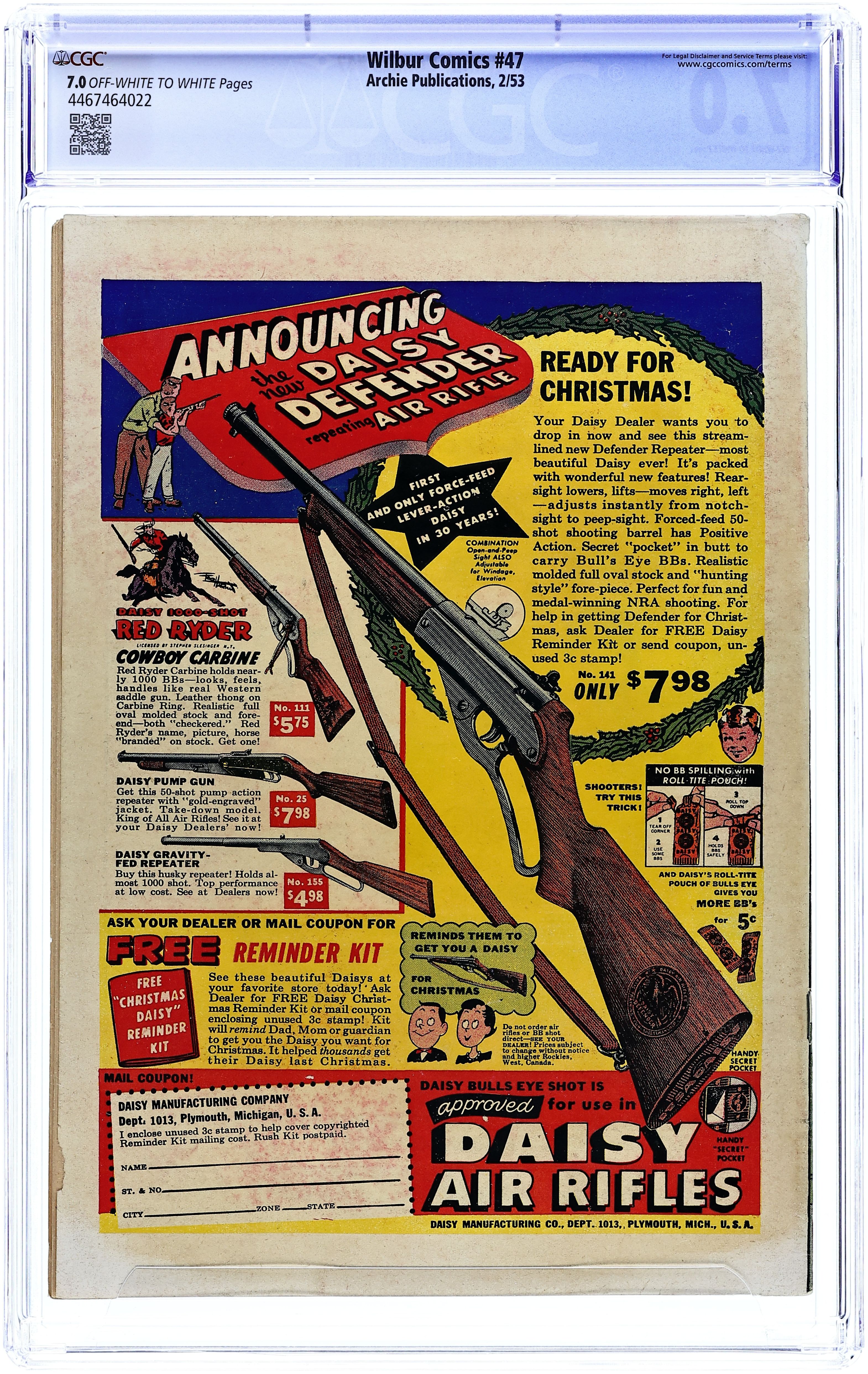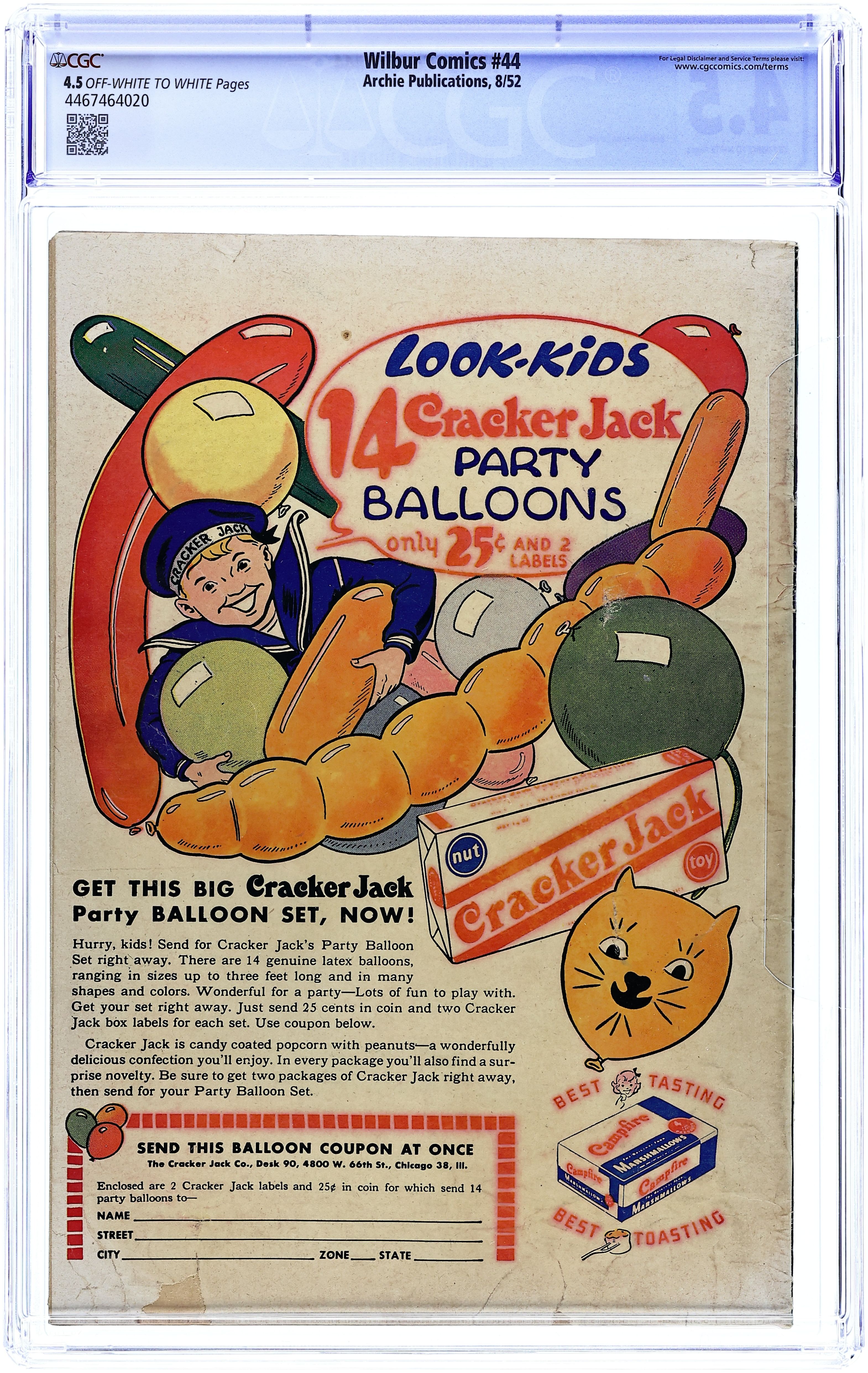 "The Hole Truth," pencils by Joe Edwards; Wilbur tries to go 24 hours without lying. "It Pays to be Sick," pencils by Joe Edwards; Wilbur tries to slightly injure himself so Laurie will visit him. "Snakes Alive," pencils by Joe Edwards; Wilbur gets in trouble with a toy snake prank. "The All American Town," pencils by Joe Edwards; Wilbur plays baseball. "Stuff About Stars" text article. "Wet Paint," pencils by Joe Edwards; Wilbur gets in trouble for testing a Wet Paint sign. "New Boy Friend" starring Katy Keene, art by Bill Woggon; Sis meets her new boyfriend Billy. Katy Keene cutout fashion designs. 52 pgs., full color. $0.10. Cover price $0.10.