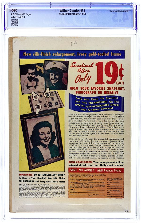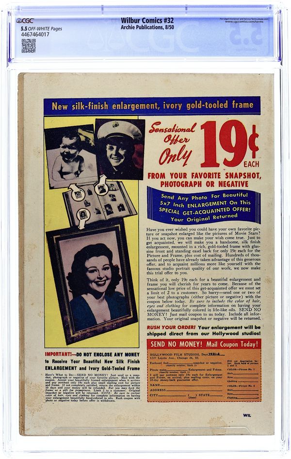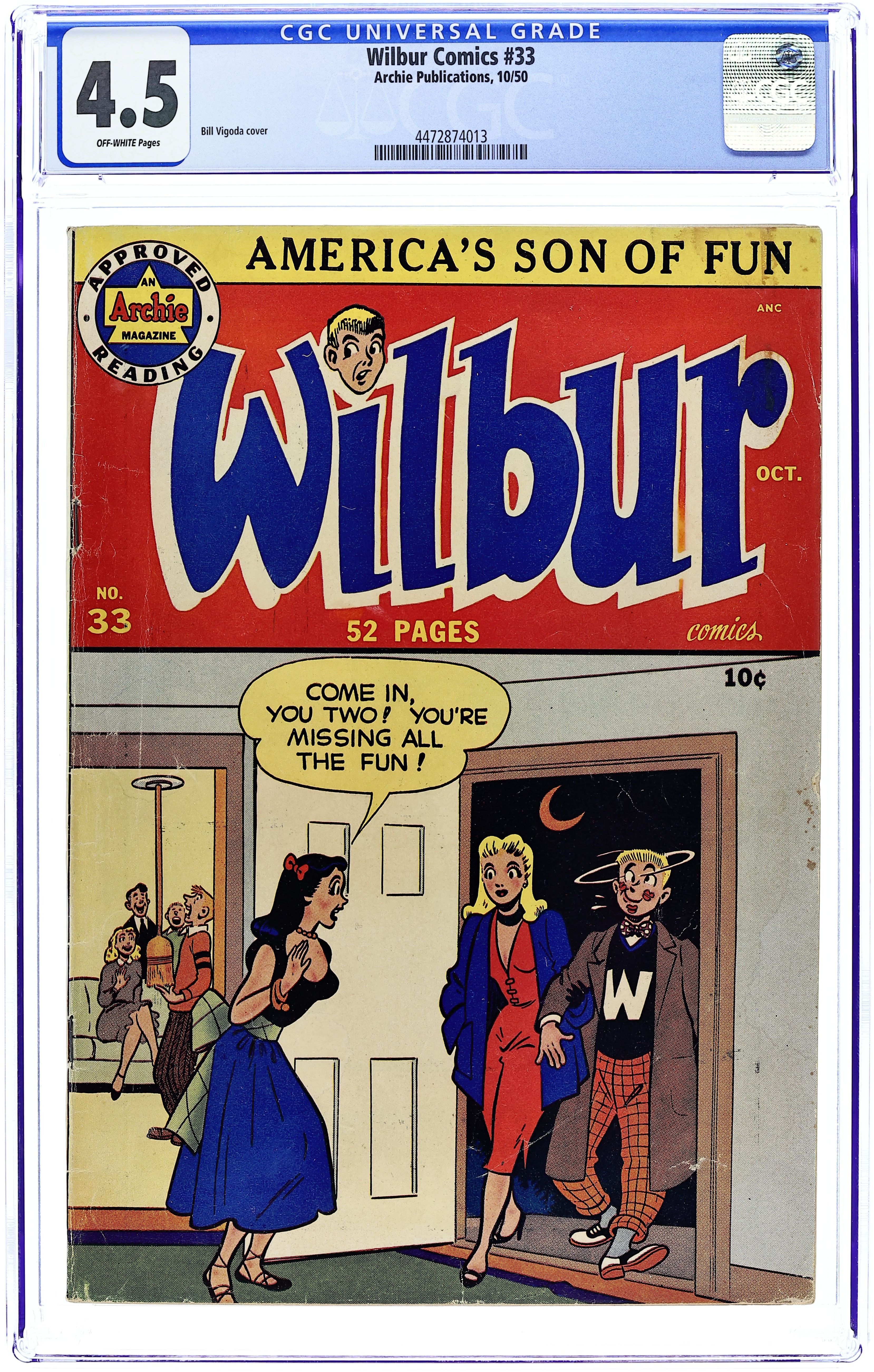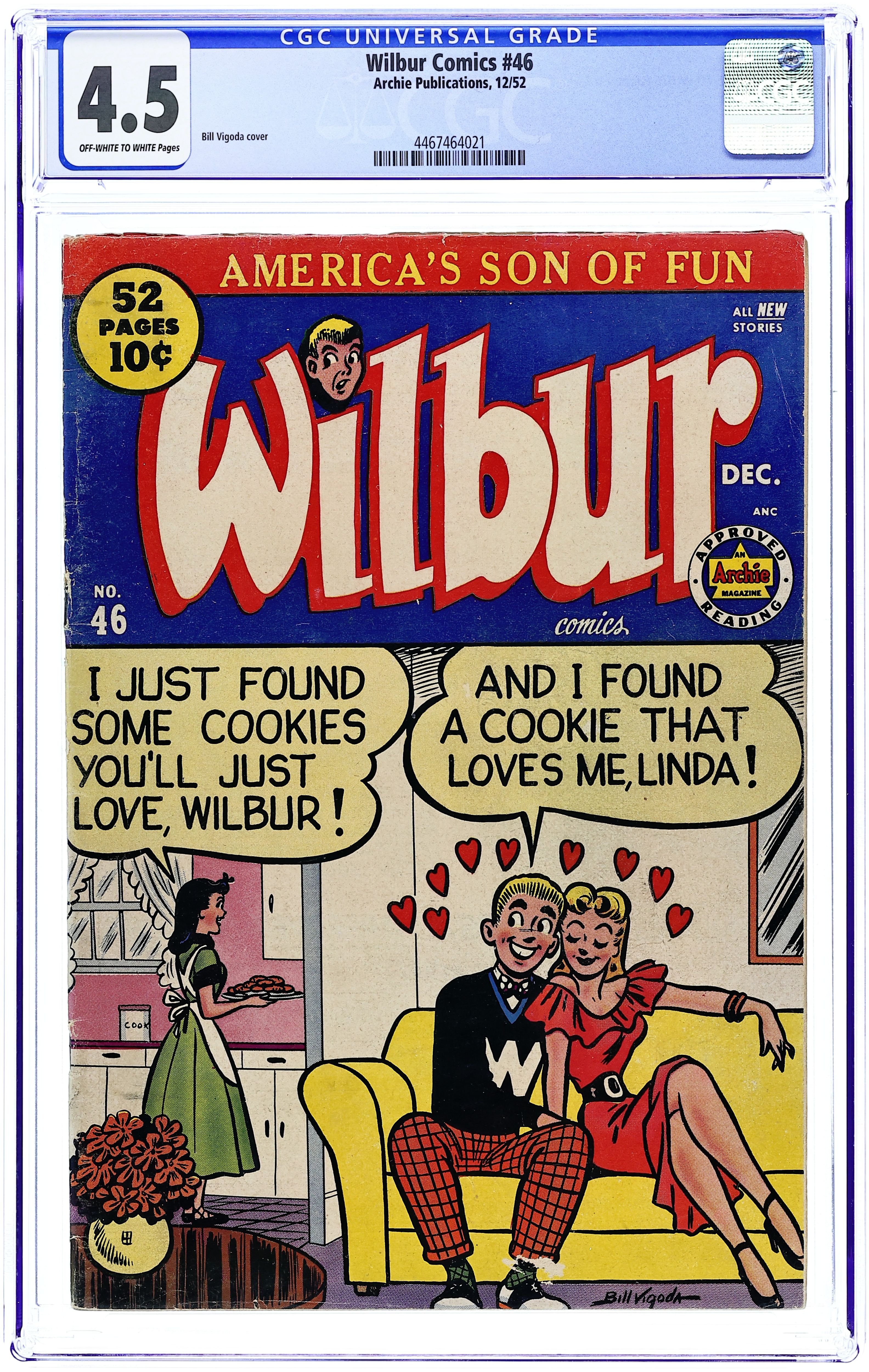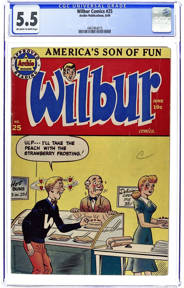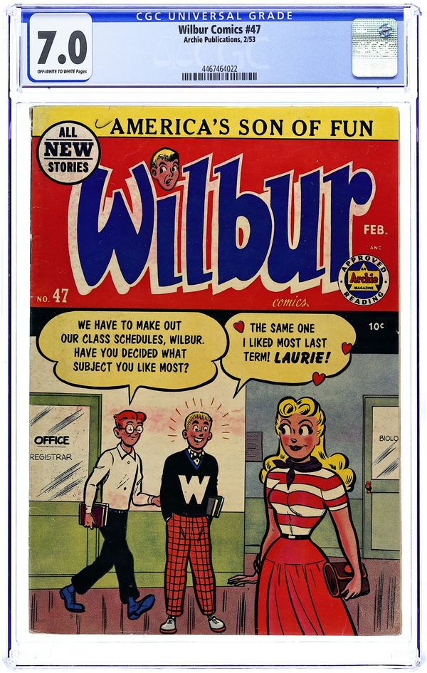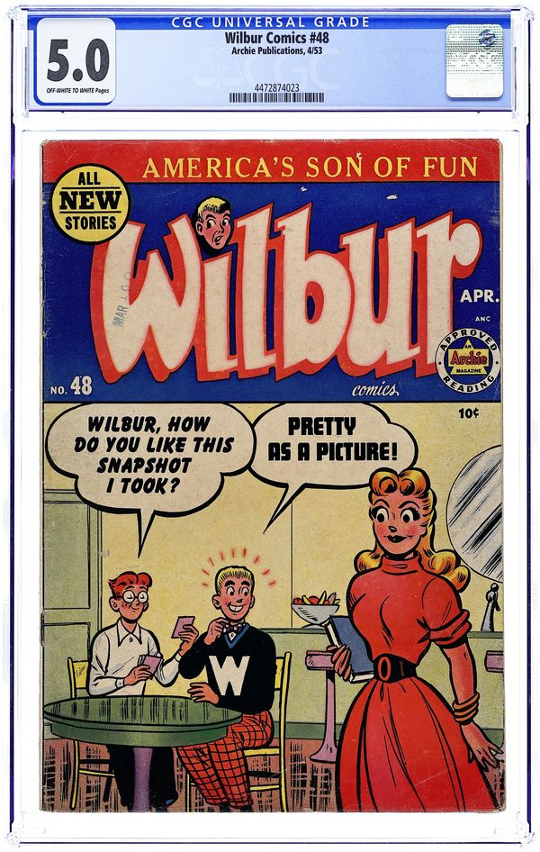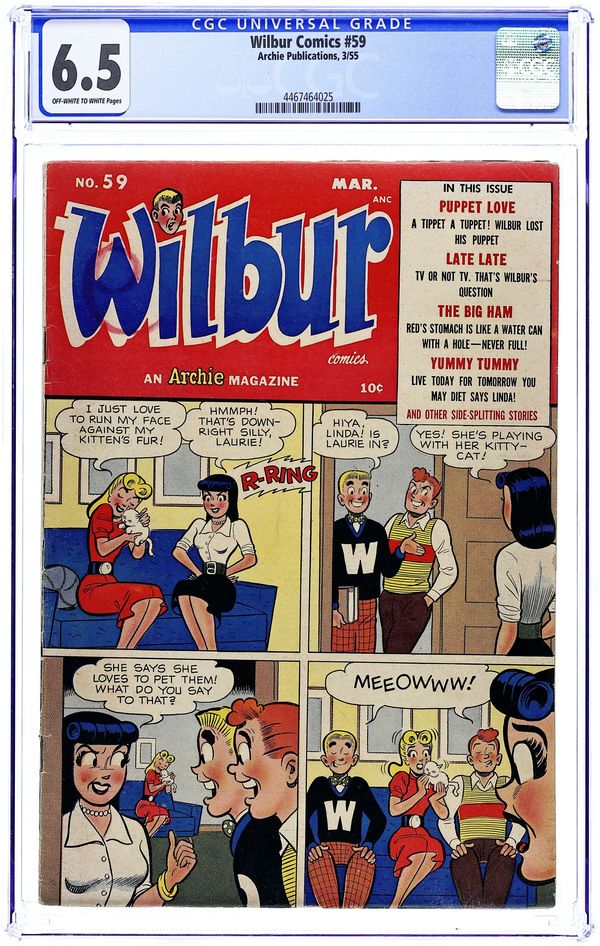 Cover pencils by Bill Vigoda. "Kiddin' on the Keys," pencils by Bill Vigoda; Mr. Wilkin buys a television set to get Wilbur interested in music. Archie ad. "The Model Builder," pencils by Bill Vigoda; Wilbur takes pictures of Laurie and Linda but mixes up the pictures while mailing them. "Now You See It-Now You Don't"; Mr. Wilkin gets confused between Wilbur's cardboard fire hydrant and a real fire hydrant. "For Whom The Phone Rings"; Mr. Wilkin tries to wait for a phone call and take a bath at the same time. Suzie ad. Untitled Katy Keene story, script and art by Bill Woggon; Katy Keene and Sis wonder what it will be like in Hollywood. Darling Love ad. "Baby Talk," pencils by Bill Vigoda; Mr. Wilkin and Mrs. Wilkin fight over who taught Wilbur to talk. 52 pgs., full color. $0.10. Cover price $0.10.