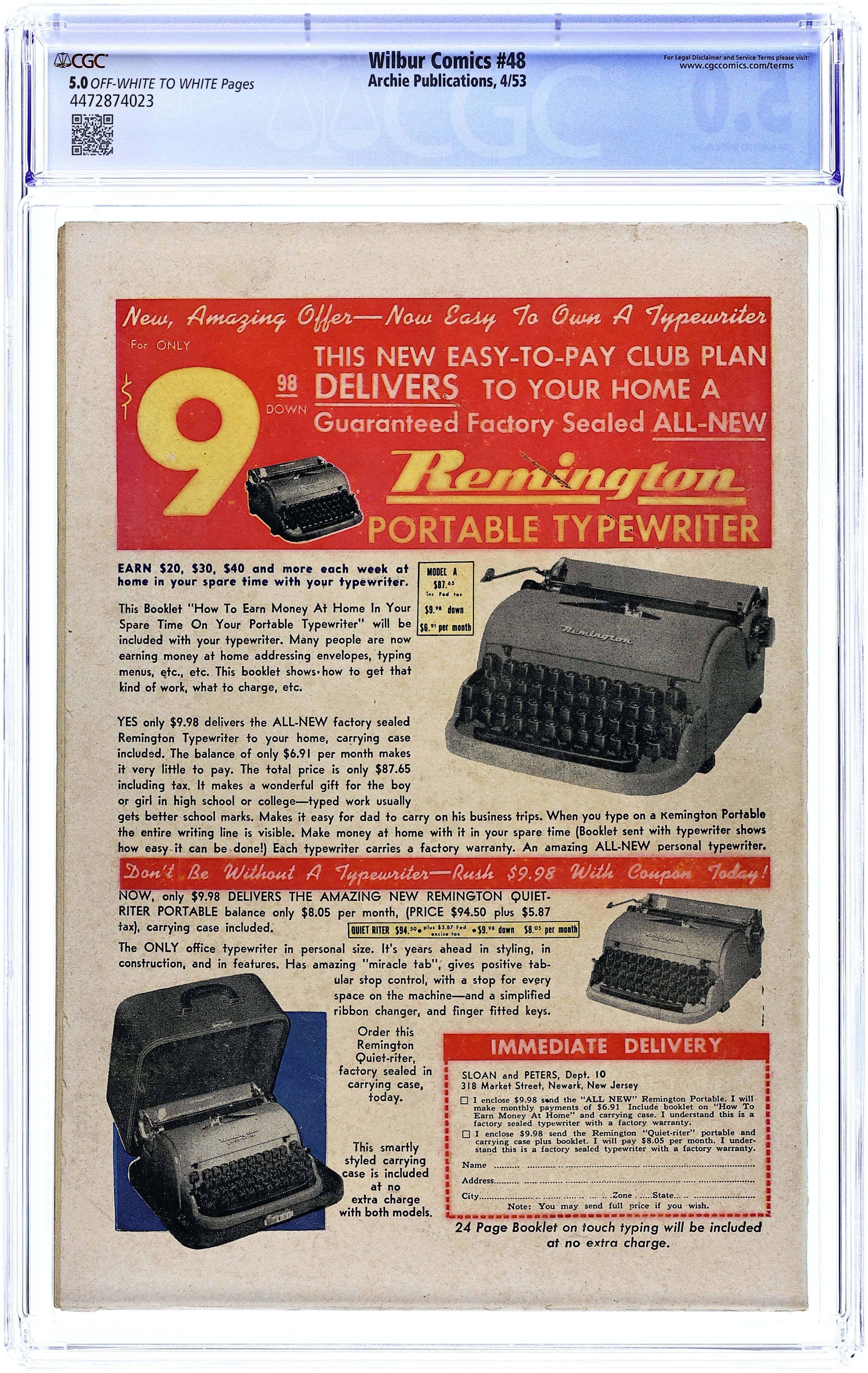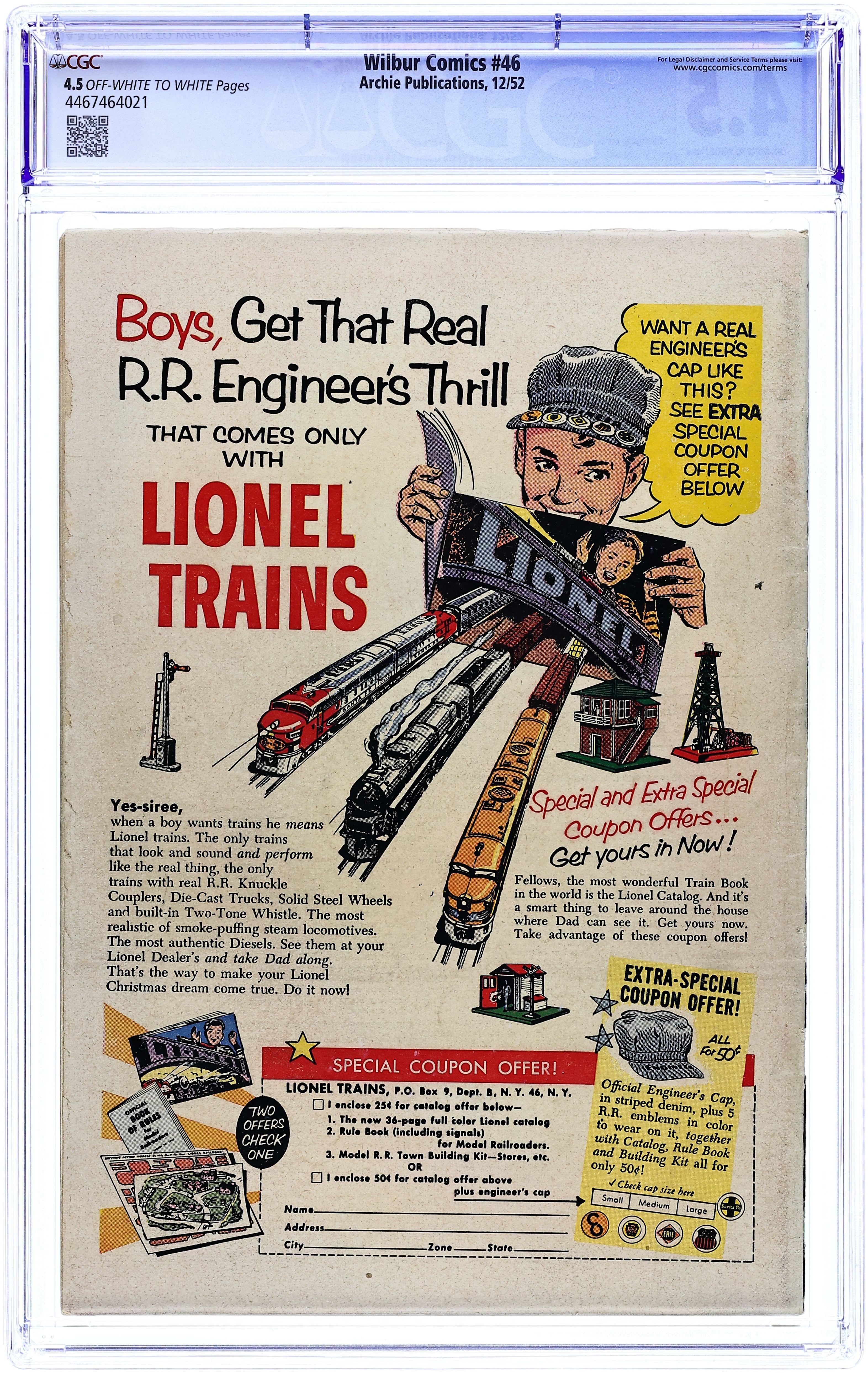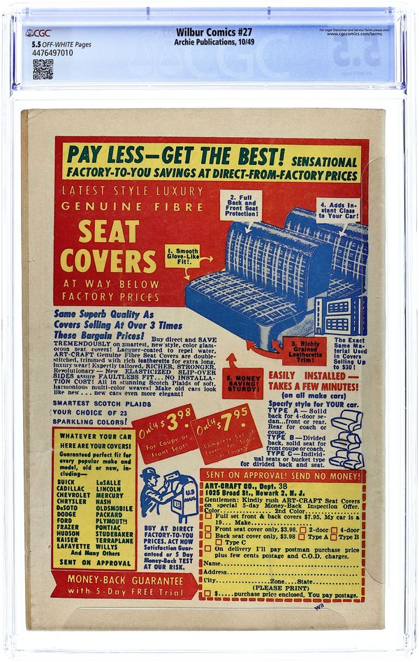 Cover art by Al Fagaly. "Finders Weepers"; Wilbur finds a wallet with a fifty dollar bill in it. "It Pays to Advertise!"; Wilbur gets a job at the Drink Rink as a soda jerk. "The Water Works"; Slats goes fishing when Wilbur is put in charge of the class while Miss Gargle goes to a meeting. Archie house ad. "The Builder"; Wilbur and Red build a garage for Wilbur's car. Betty and Veronica house ad. Stuff About Stars article. Archie house ad. Untitled Katy Keene story, script and art by Bill Woggon; K. O. asks Katy to go skiing, but then Randy asks her to go swimming with him. Katy Keene and Archie Series house ads. "Love Notes"; Wilbur goes to Laurie's to hear some new records. 52 pgs., full color. Cover price $0.10.