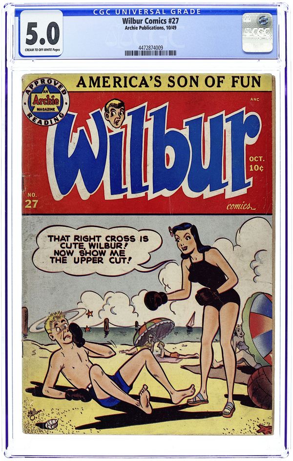 Cover art by Bill Vigoda. The Famous Archie Series Characters house ad. "Cops 'N Robbers"; Wilbur dresses as a crook for Laurie's costume party, then he has to make a deposit at the bank for his father. "Knots to You!"; After Laurie turns down Wilbur for lunch, Linda worries he's going to hang himself. "Flight from Fight"; Slats and Wilbur are going to fight, then Wilbur hears the school doctor talking about what bad condition Slats is in and decides not to fight him. Jughead house ad. "Poem! Sweet Poem!"; Cleaning the attic, Wilbur finds a poem his father wrote to his mother; he also finds a book of poems he borrowed from Laurie over a year ago. Wilbur Puzzle Page, art by Dave Berg. "Follow the Leader"; Linda has taught Wilbur to dance the samba. "Clutter Bug"; Red and Wilbur run to watch a fire then learn that it was started by a cluttered attic. Untitled Katy Keene story, art by Bill Woggon; Katy and Sis listen to K. O.'s big fight on radio, and Sis imagines what's happening based on the announcer's descriptions. Swim Fashions page with Katy Keene, art by Bill Woggon. 52 pgs., full color. Cover price $0.10.