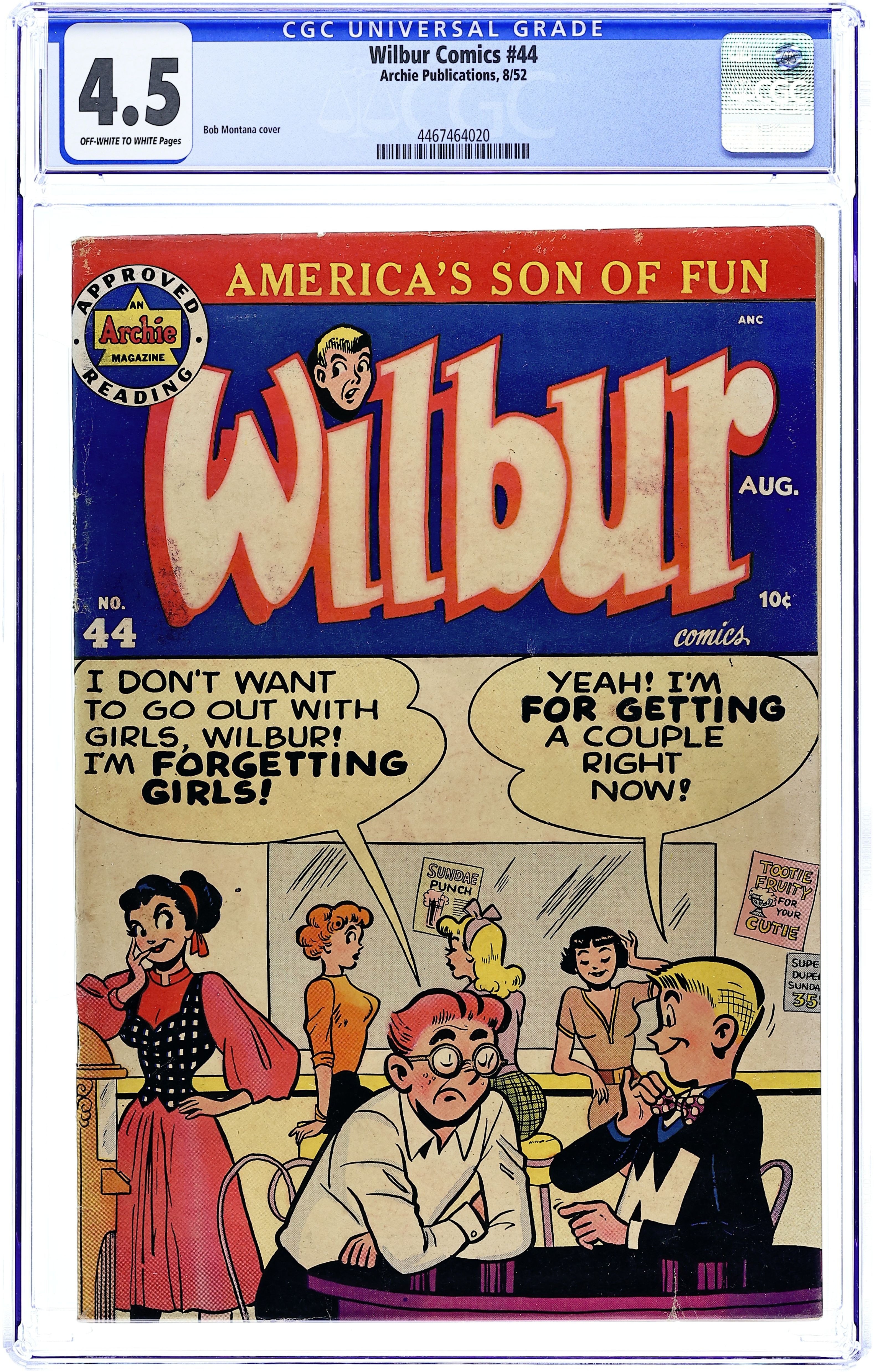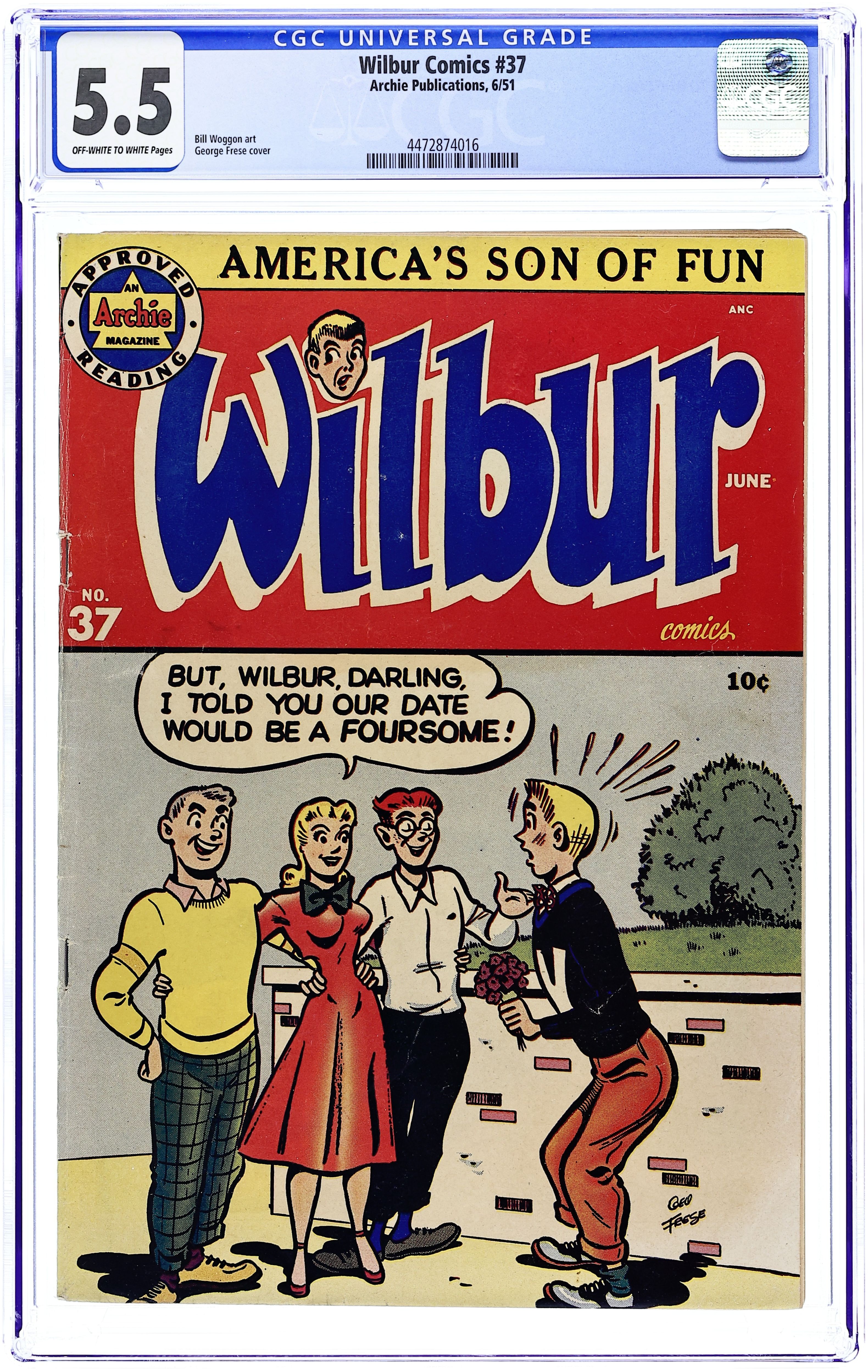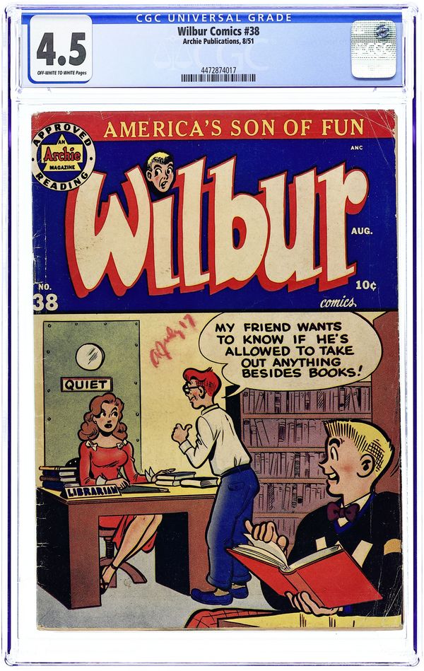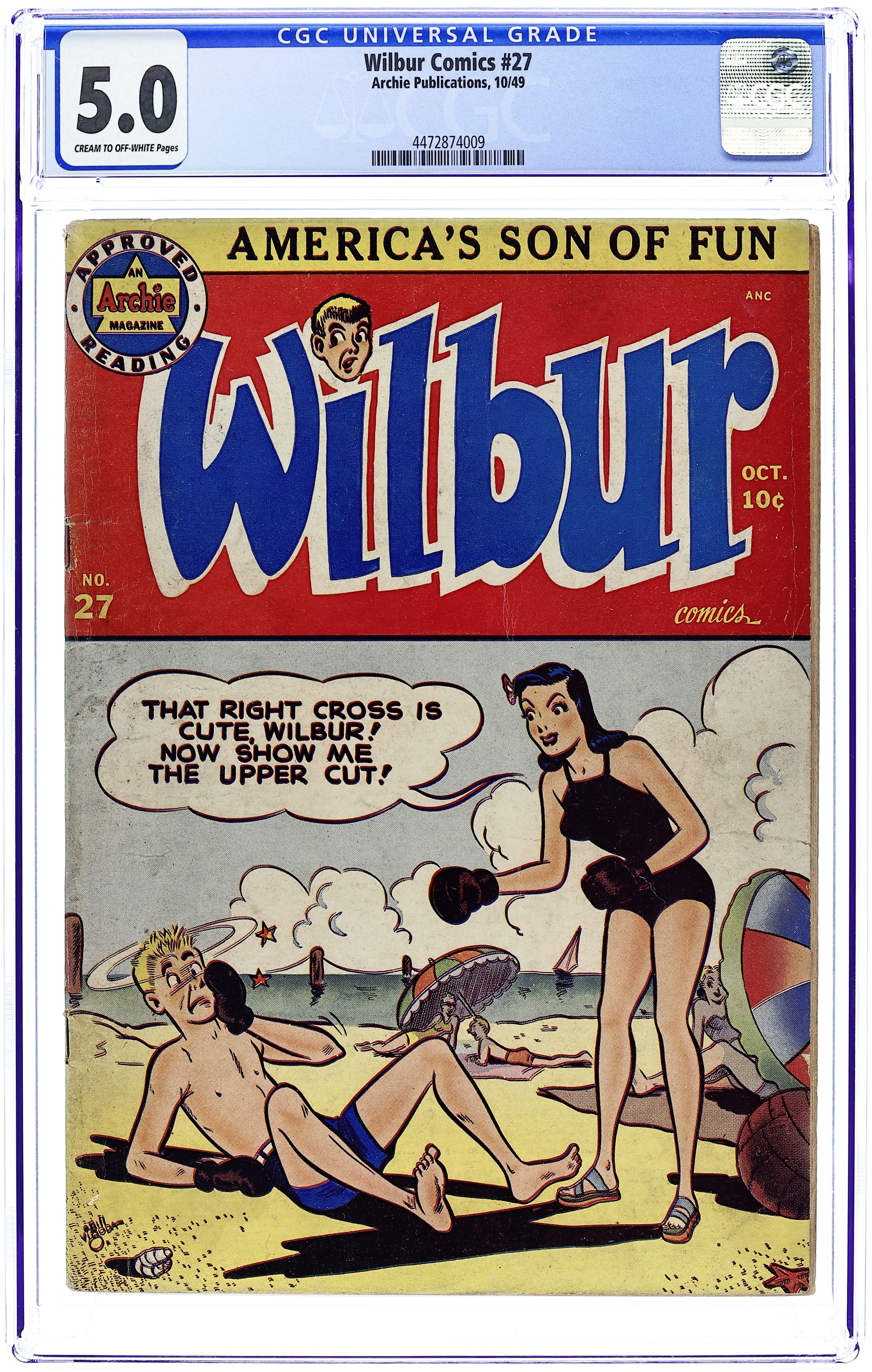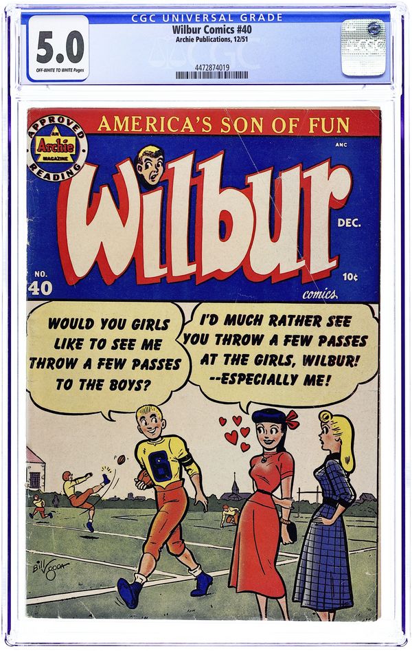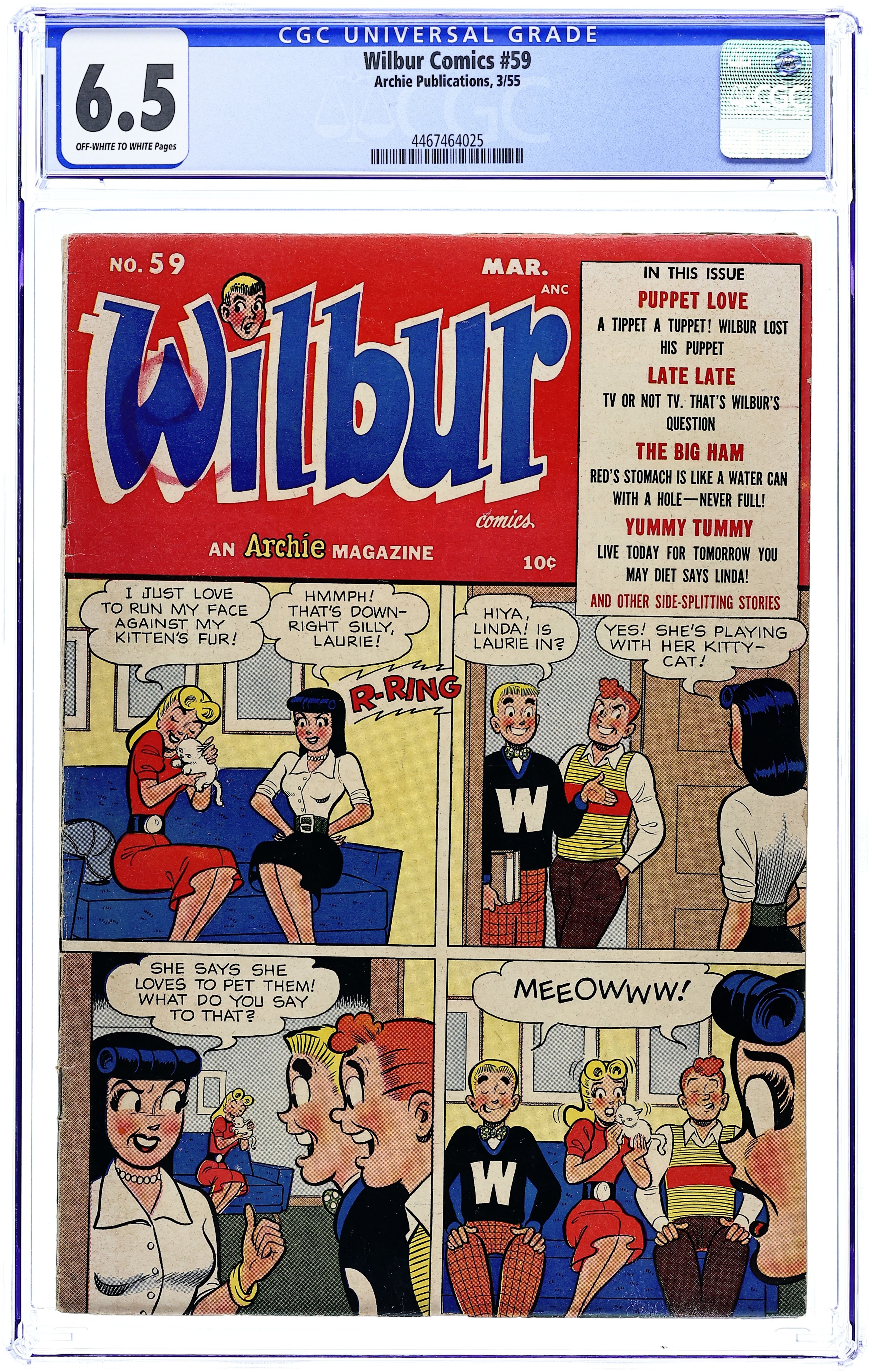 "Love Me-Love My Dog"; Laurie has a new dog, a chihuahua. Wilbur takes him for a walk and gets in trouble when the dog falls in a mail dropbox. Archie Annual ad. Katy Keene ad. "Wilbur versus the Green Hairnet"; Wilbur makes a joke about hiring professional wrestler The Green Hairnet for the Riverdale High "All Sports Night," but Laurie takes him seriously and plasters the school with posters. "A Pressing Engagement"; Linda comes up with a plan to have Wilbur go without a date to the dance, figuring she would have a chance once he's alone at the dance. "Name Your Poison"; Wilbur dreams he is a knight in days of old. Untitled Katy Keene story, script and art by Bill Woggon; Katy and Sis discuss how to attract attention at the corner of Hollywood and Vine. Archie's Comic-Quiz. "Cupid's Capers"; Miss Gargle tells Wilbur and Red a sad story about her wedding day during World War I when the groom (a soldier) was late and she called off the wedding. 52 pgs., full color. Cover price $0.10.