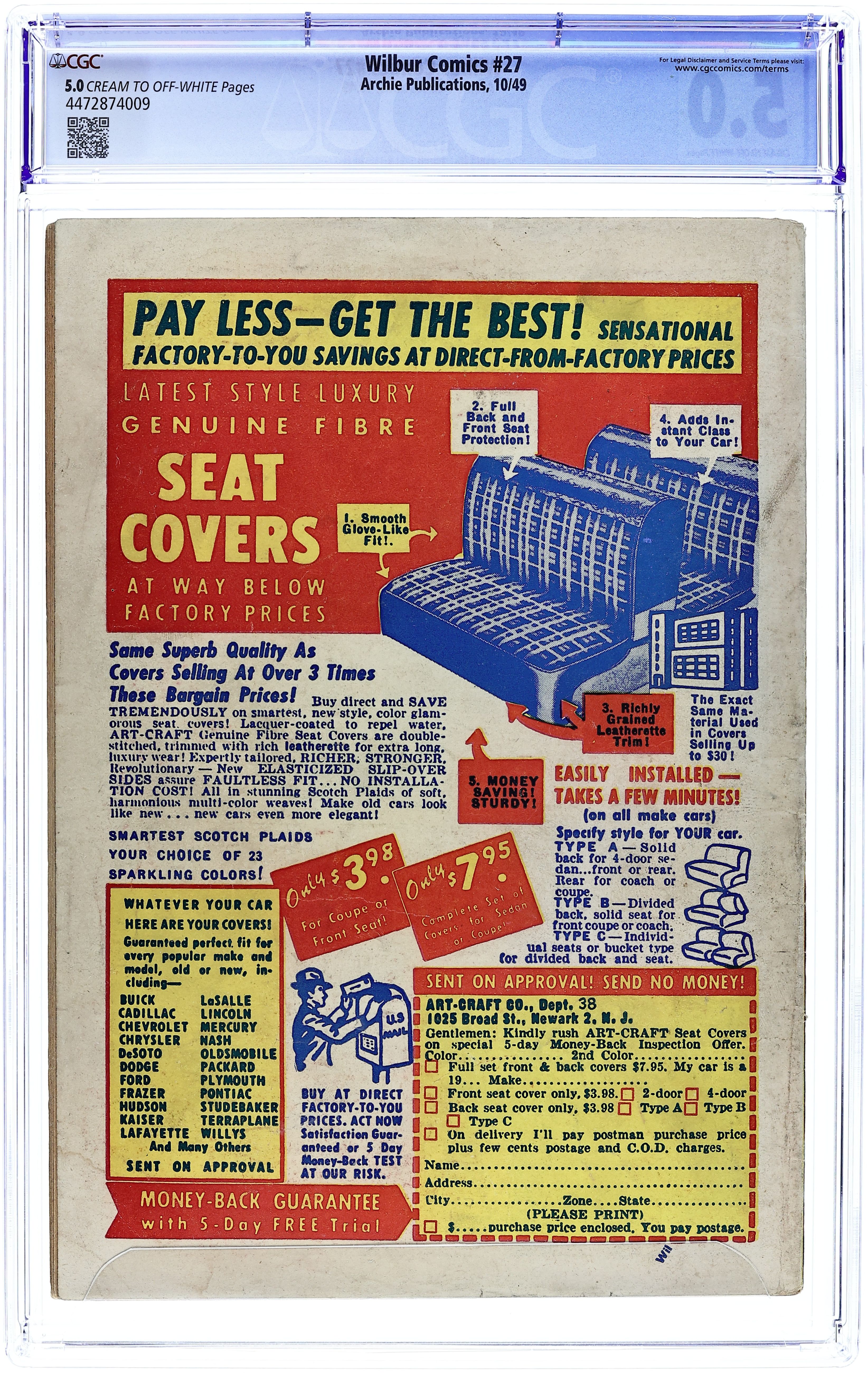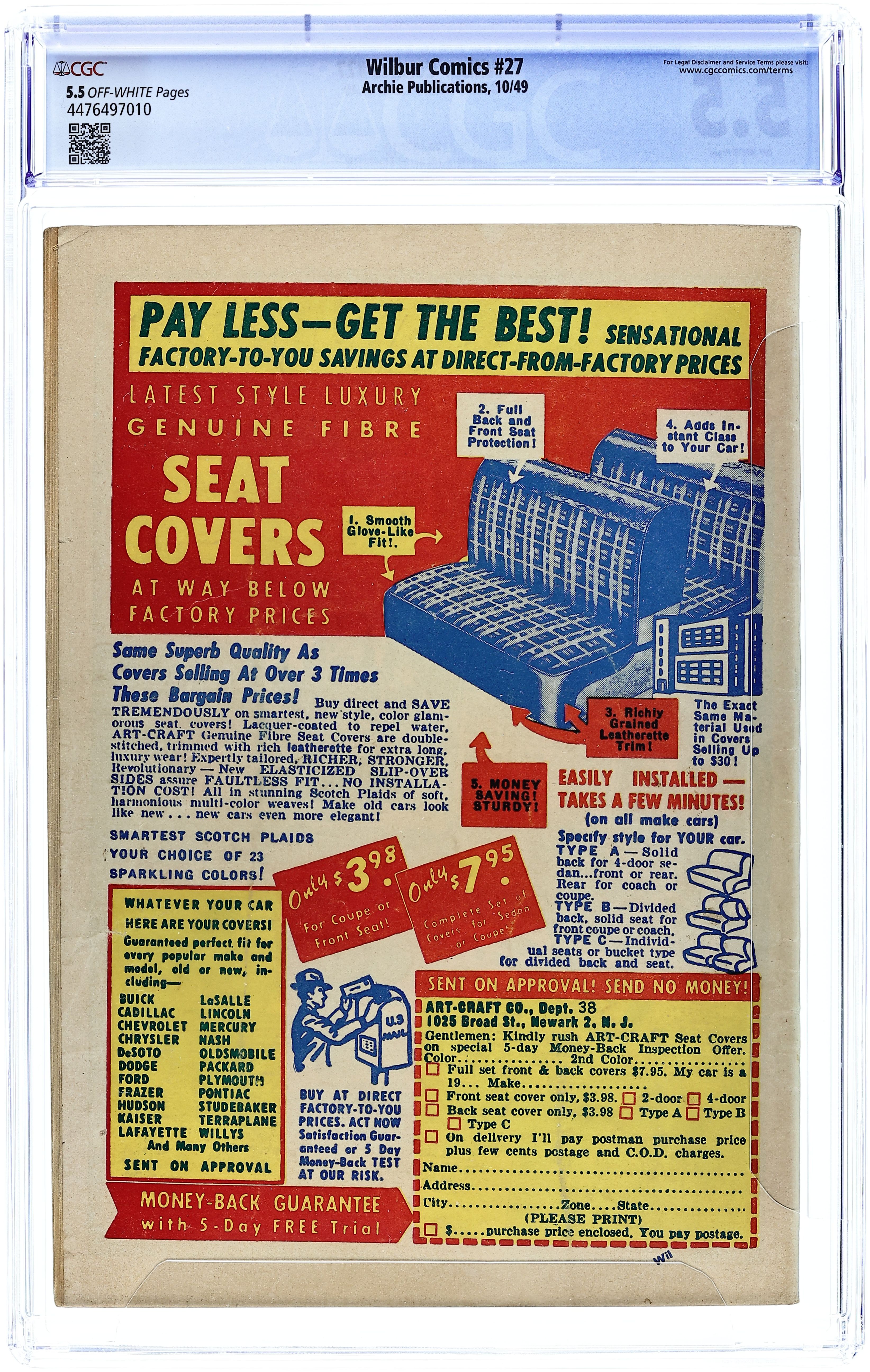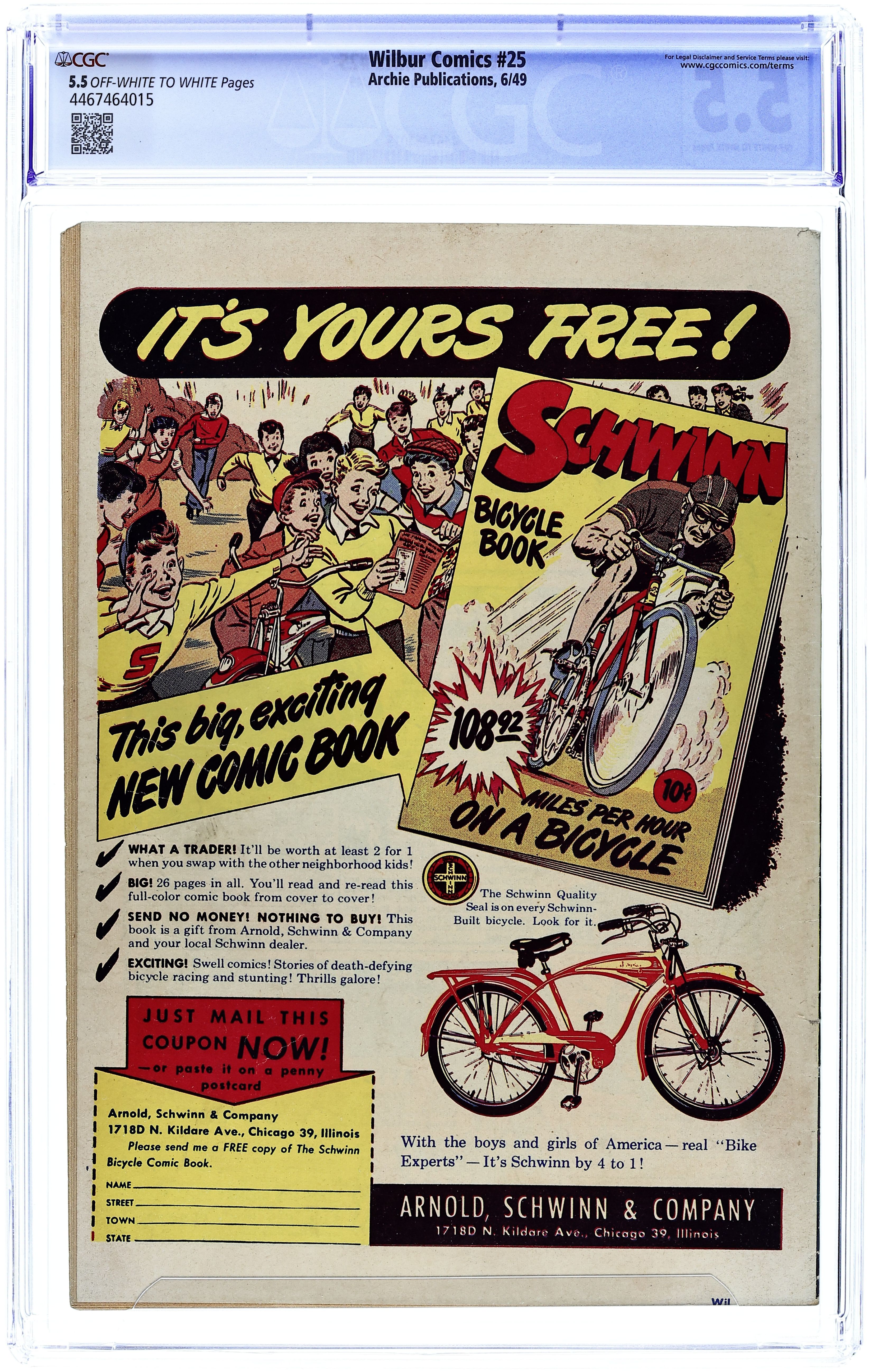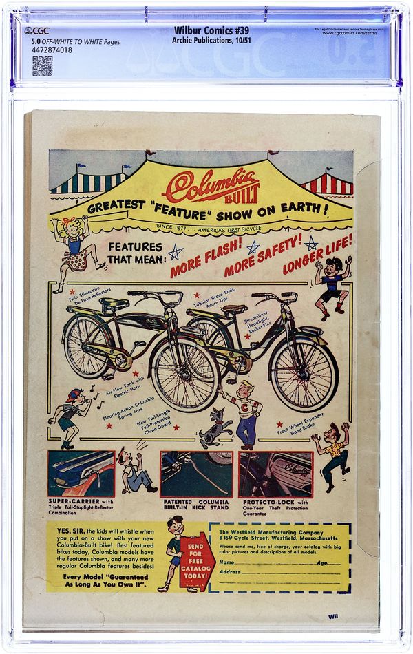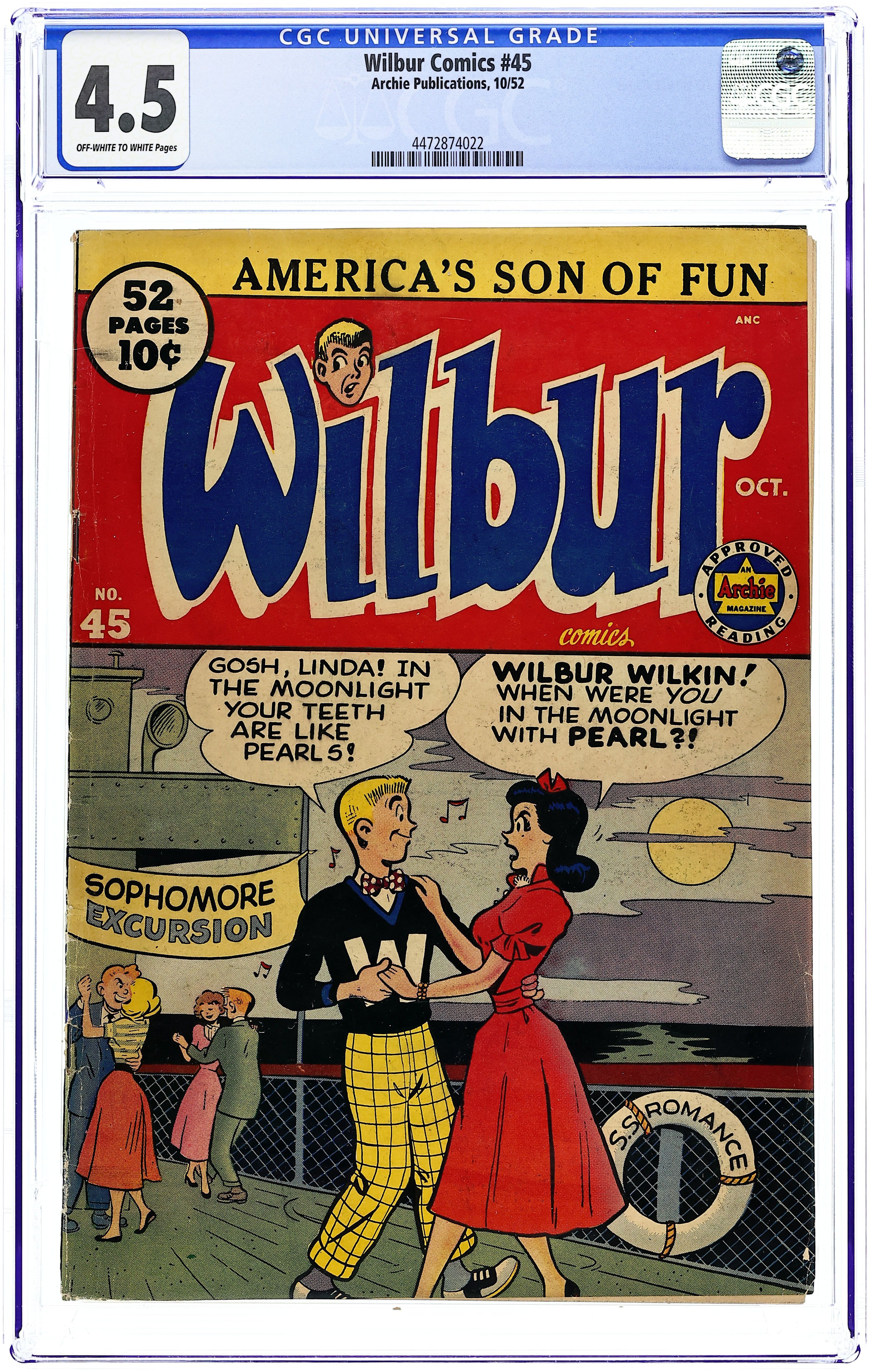 "Love Me-Love My Dog"; Laurie has a new dog, a chihuahua. Wilbur takes him for a walk and gets in trouble when the dog falls in a mail dropbox. Archie Annual ad. Katy Keene ad. "Wilbur versus the Green Hairnet"; Wilbur makes a joke about hiring professional wrestler The Green Hairnet for the Riverdale High "All Sports Night," but Laurie takes him seriously and plasters the school with posters. "A Pressing Engagement"; Linda comes up with a plan to have Wilbur go without a date to the dance, figuring she would have a chance once he's alone at the dance. "Name Your Poison"; Wilbur dreams he is a knight in days of old. Untitled Katy Keene story, script and art by Bill Woggon; Katy and Sis discuss how to attract attention at the corner of Hollywood and Vine. Archie's Comic-Quiz. "Cupid's Capers"; Miss Gargle tells Wilbur and Red a sad story about her wedding day during World War I when the groom (a soldier) was late and she called off the wedding. 52 pgs., full color. Cover price $0.10.