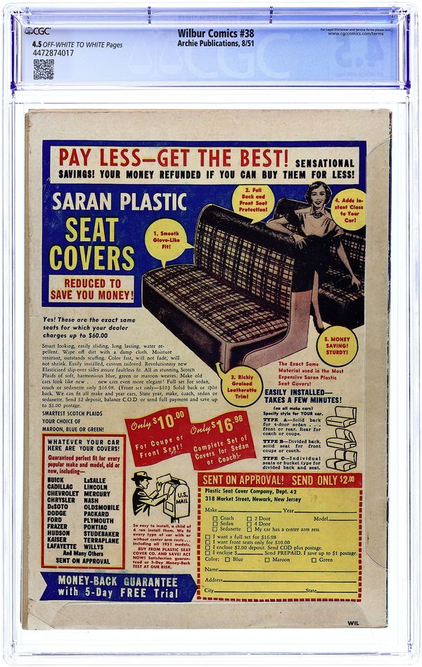 "Applied Psychology"; Linda is reading a book on child psychology that she plans to use when babysitting. "Pocket Size Safety," art by Dave Berg; Wilbur goes through the ice, but is able to save himself with two ice awls connected with strings. "Raising the Devil"; Wilbur needs money for an upcoming dance when he finds an envelope filled with money. Word ladder and a maze. "Help Not Wanted," script and art by Joe Edwards; Wilbur's dad hires Wilbur as an office boy. Super Duck house ad. "Book Lovers"; Five one-panel gags about teens and books. Wilbur Puzzle Page. "All Bright and Shiner," script and art by Joe Edwards; Wilbur promises Laurie to drive her to the beauty parlor after school, but then has to stay after school. "Hold Everything!", script and art by Joe Edwards; Wilbur is trying to fix his jalopy, but Laurie is annoyed that his car isn't working. Untitled Katy Keene story, script and art by Bill Woggon; Katy is upset that she hasn't heard from K. O. and thinks he doesn't love her anymore. Katy Keene Pin-Up and Fashions page, art by Bill Woggon. A word ladder and a connect the dots puzzle. "All Wet," script and art by Joe Edwards; Laurie forgot a package at the soda shoppe and Wilbur takes it to her in the rain. 52 pgs., full color. Cover price $0.10.
