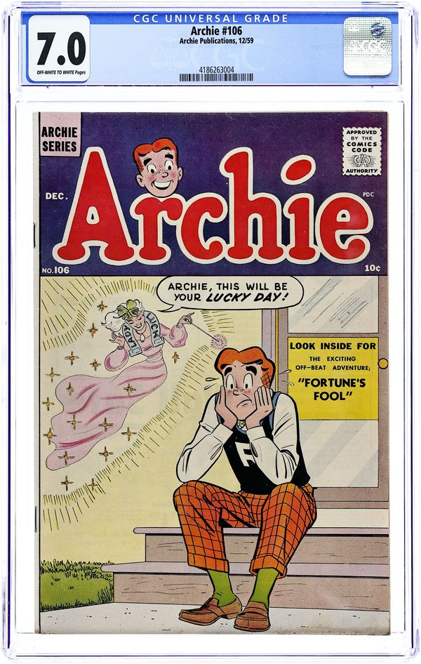 Cover by Bill Vigoda? Stories by Ray Gill and unknown. Art by Bill Vigoda and Ray Gill. Featuring Archie in: "The Builder"; "The Talent Scout"; "Giving Is Living" (introductions of Blinky and Charlie); "The Cold Shoulder"; "A Peck of Trouble"; and "Hard To Swallow"! Plus: 2-page text piece "Hollywood Tattle Tales"! Full color. Cover price $0.10.