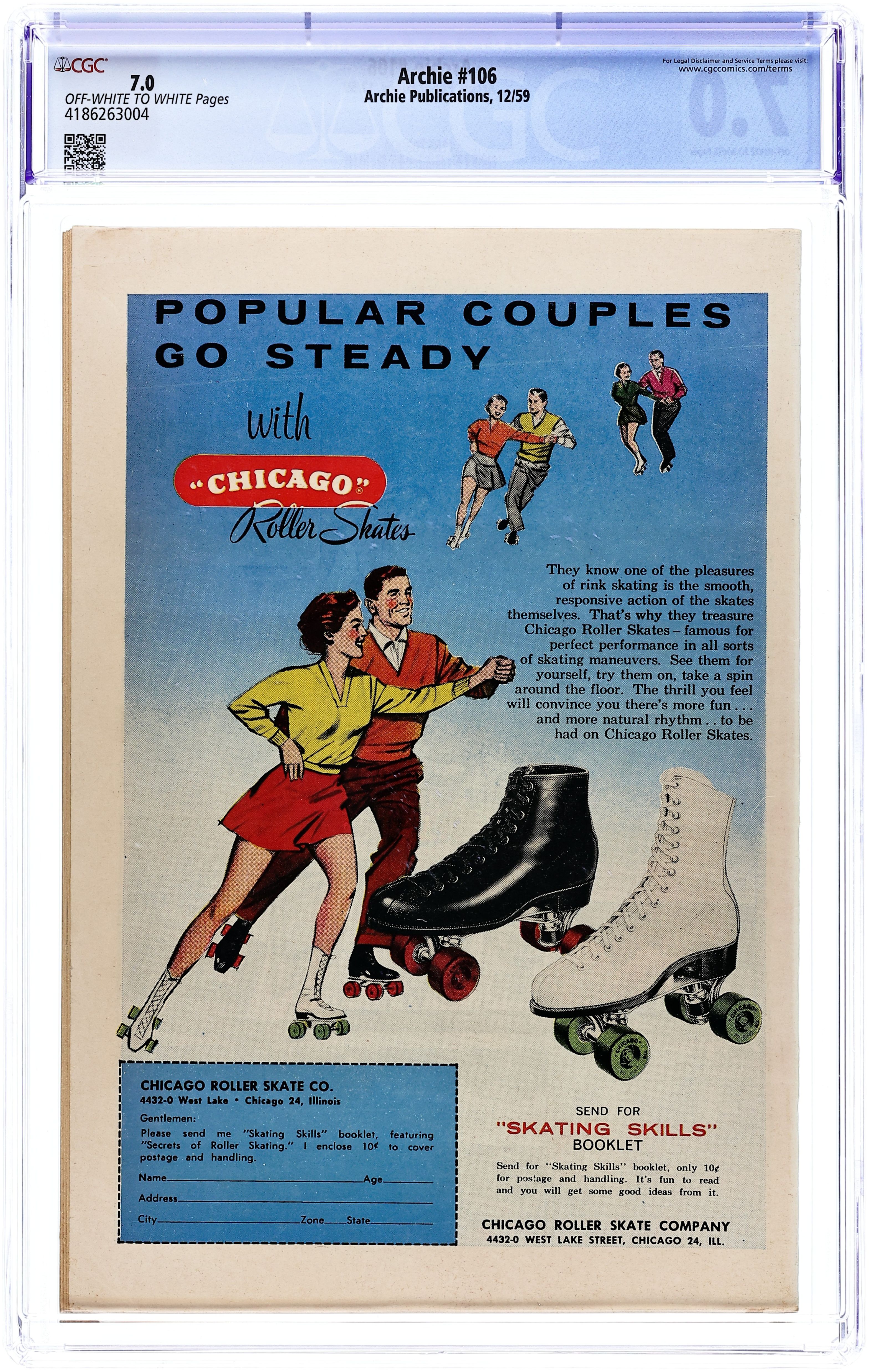 "Drown and Out"; Archie gets a job as a lifeguard; Betty pretends to be drowning in order for Archie to rescue her, but she overdoes the hugging in the water and Archie has to sock her to get them to shore. "Pranks For the Memory"; Jughead gets hit on the head by a baseball and apparently has temporary amnesia. "Change Your Oil!"; Archie asks the pharmacist to fill a prescription; The prescription is mostly castor oil. "Backfield in Emotion"; The girls are upset that the boys signed up for football and won't date them as much. Archie's Pals 'n' Gals Annual ad. "A Shorts Story"; The boys are wearing Bermuda shorts to school, much to Miss Grundy's displeasure. "Snow Use" text story. "Rags to Riches"; Wilbur and Red sneak into the exclusive Westfield Country Club to go swimming on a hot day. "Missile-Man"; Archie makes a homemade boomerang; It almost hits Mr. Lodge, who tries to get rid of it by throwing it away, which doesn't work. "Pair of Spectacles"; Moose has a part in the school play that requires him to have bad eyesight except when wearing glasses; He's having trouble remembering that, so Betty and Veronica tell him to stay in character until the next rehearsal. Archie's Joke Book ad. Archie Club ad. "Dragnut!"; Everywhere he turns, Mr. Weatherbee is faced with students singing the "Grabnet" [Dragnet] theme song or using versions of the show's catch phrases ("Just the facts, ma'am," etc.), which is driving him crazy. 36 pgs., full color. Cover price $0.10.