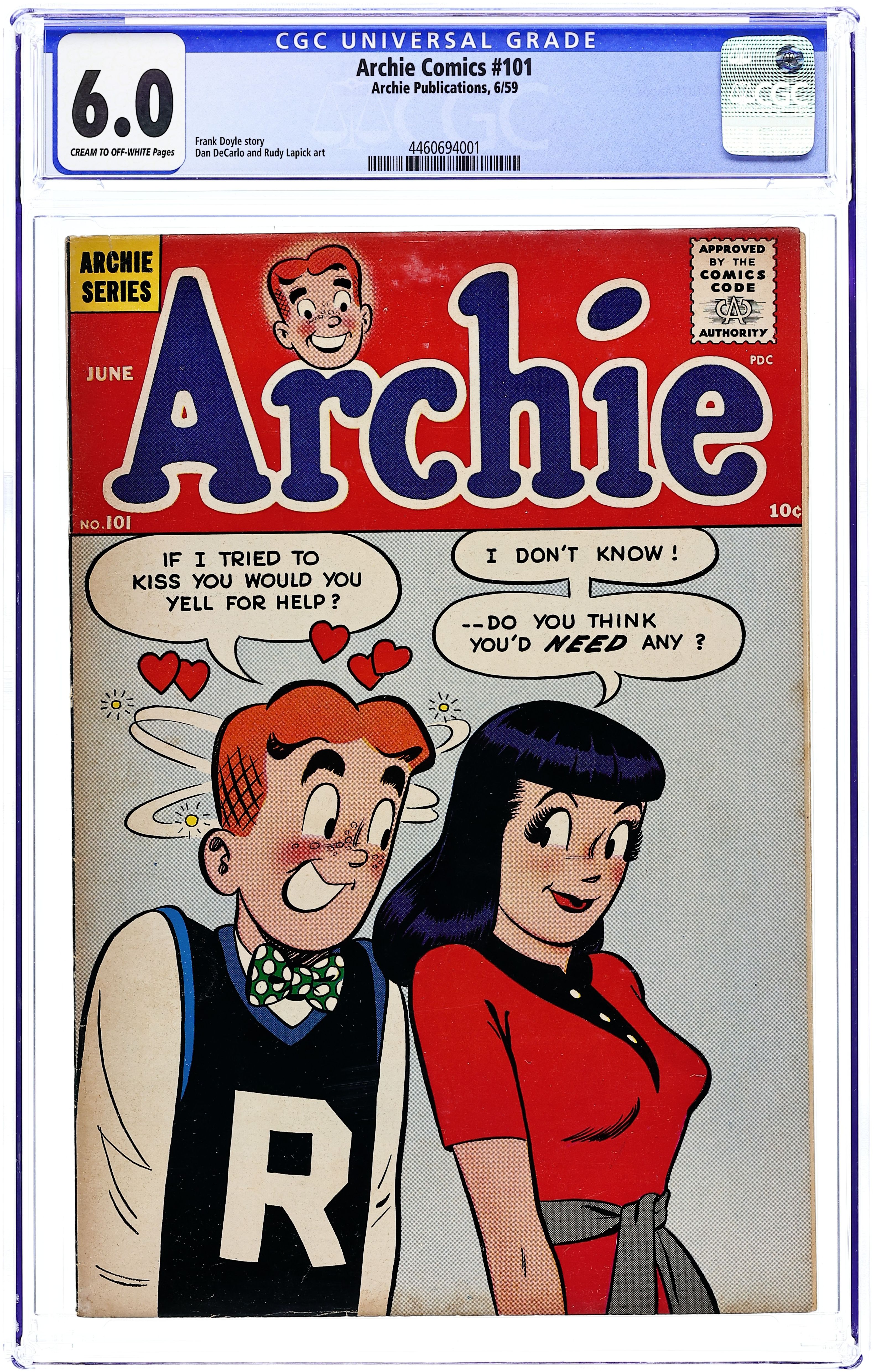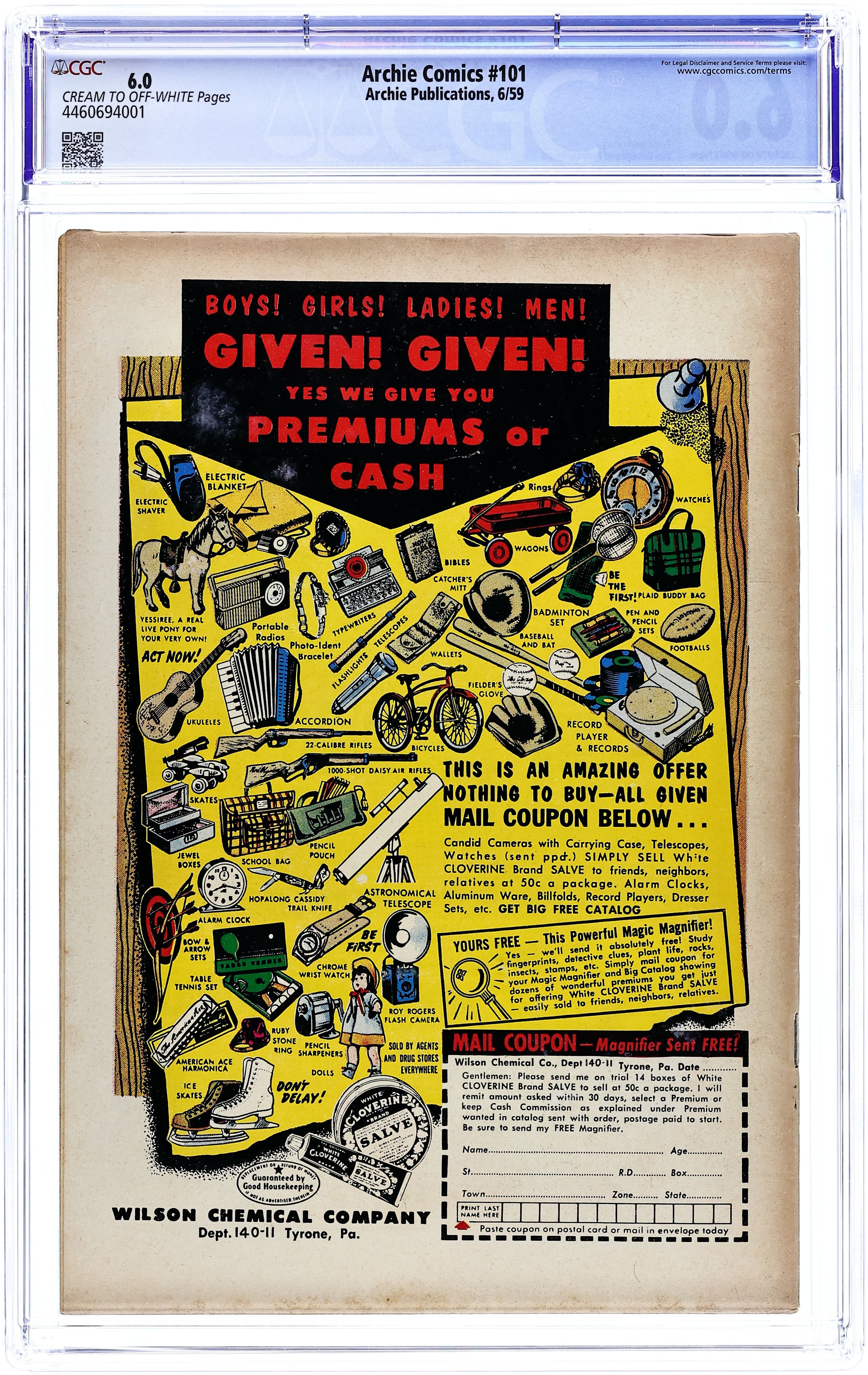 Cover by Bill Vigoda. Stories by unknown. Art by Bill Vigoda and Terry Woik Szenics. Archie and Jughead sell shampoo door-to-door to get money that Jughead needs in "The Super-Salesman"; Archie donates his blood, but when he returns to the dressing room, his clothes are gone in an Archie Short; Betty and Veronica's constant bickering causes chaos for the teachers at Riverdale High School in "Bitter Sweets"; Archie and Jughead win a scrap contest and a trip to the Bar X Dude Ranch in Arizona in "The Cowboy"; and Archie takes Veronica on a girls picnic in "The Queen of the May"! Plus: Archie gets a job delivering groceries in the 2-page text story "Archie Doesn't Work Here Anymore!" by Will Williams. Also: "Archie Magic Page" and "Betty and Veronica's Fashion Page"! 52 pages, full color. Cover price $0.10.