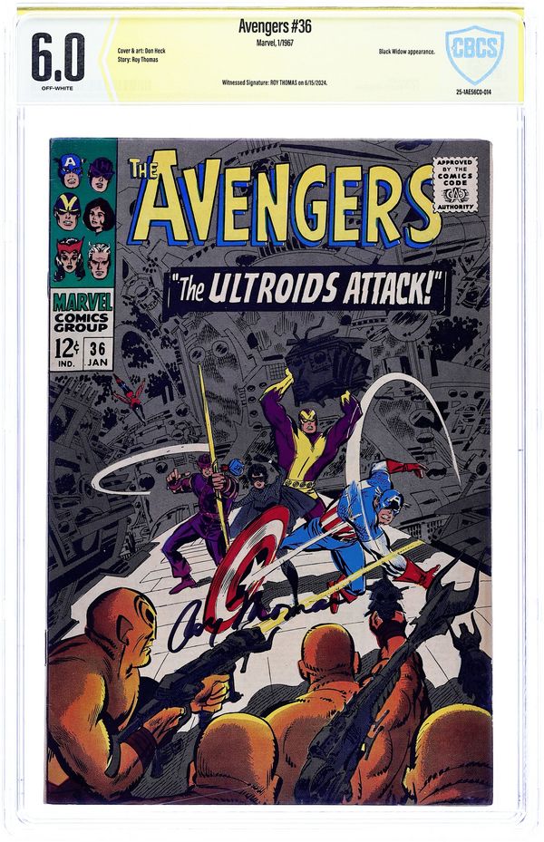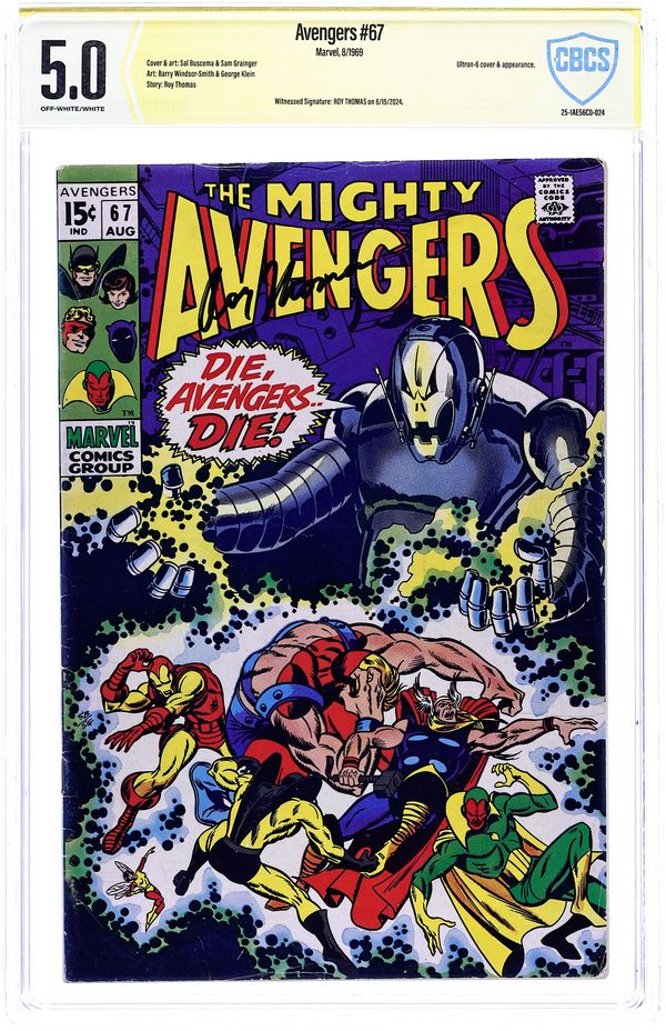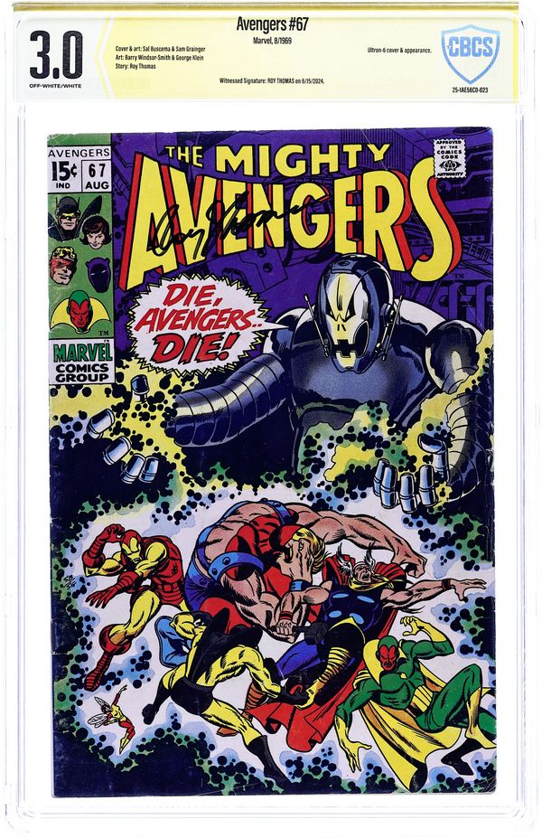 "We Stand at Armageddon!" Part 2 of 3. Script by Roy Thomas. Pencils by Barry Windsor-Smith. Inks by George Klein. Cover by Sal Buscema and Sam Grainger. Ultron-6 rampages through Avengers Mansion! And Earth's Mightiest Heroes are helpless to stop the metal monster now composed of pure adamantium! After steamrolling the Avengers, Ultron flies away; but the Vision follows him back to his lair! Ultron plans to detonate a nuclear device in New York City! And only the synthezoid avenger stands in his way!Can the Vision derail his creator's atomic dreams? Cameo appearances by Dum Dum Dugan, Gabe Jones, and Contessa Valentina Allegra de la Fontaine. Avengers Lineup: Goliath, Iron Man, Thor, Vision, Wasp, and Yellowjacket. (Notes: This issue is Ultron's first cover appearance. This issue was reprinted in Marvel Super Action #28.) 36 pages. Cover price $0.15.