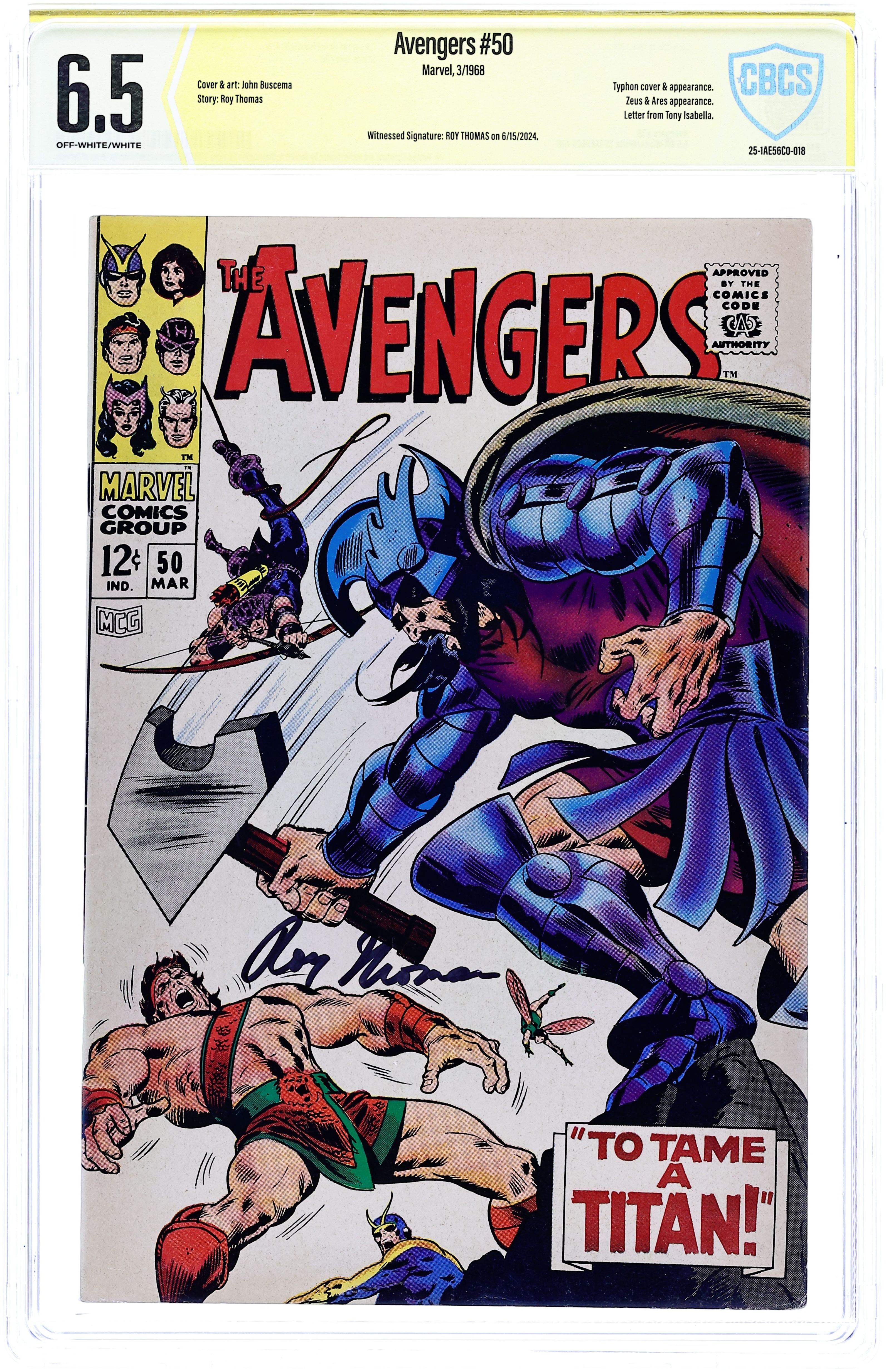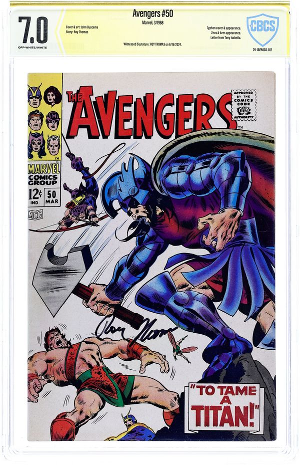 "To Tame a Titan!" Script by Roy Thomas. Art by John Buscema. Cover by John Buscema. Typhon rules Olympus! And the vengeful titan now has his sights set on conquering the land of mortals! Where is Hercules? Unfortunately, he was exiled last issue to the Land of Shades with his fellow Olympians! However since Hercules is half-mortal, Zeus is able to send him back to Earth! When Hercules returns, he sees his brave friends fighting Typhon! But Hawkeye, Goliath, and the Wasp don't have the raw power to beat Typhon! Does the Lion of Olympus? In an incredible display of strength and skill, the Prince of Power vanquishes the terrible titan! And Olympus lives again! Cameo appearances by Ares, Bia, and Kratos. (Notes: Hercules elects to stay in Olympus after the battle. Typhon returns in Avengers 163. The letters page includes a letter from comics writer Tony Isabella. This story was reprinted in Marvel Triple Action #42. This issue includes a statement of ownership: average print run 454,496; average paid circulation 269,139.) 36 pages. Cover price $0.12.
