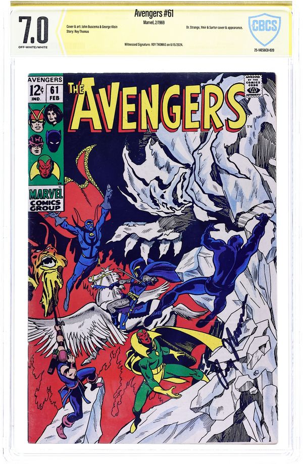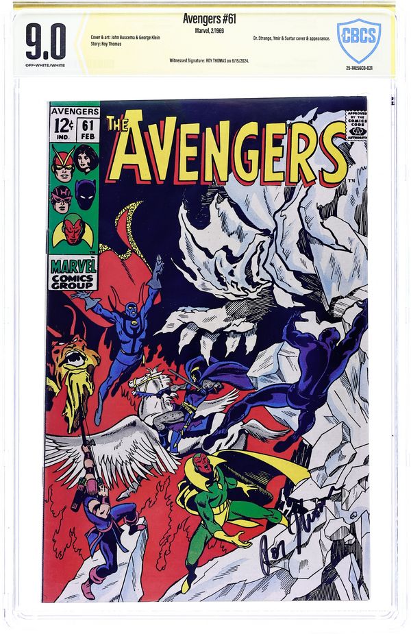 First appearance of the Avengers' Quinjet in "Some Say the World Will End in Fire, Some Say in Ice" Guest-starring Doctor Strange and the Black Knight. Script by Roy Thomas. Pencils by John Buscema. Inks by George Klein. Cover by John Buscema and George Klein. Story continues from Doctor Strange 178. A quiet night at Avengers Mansion is interrupted by the sudden arrival of the Master of the Mystic Arts! Dr. Strange warns that the Spell of Fire and Ice unleashed by the Sons of Satannish could destroy the world! And he requests immediate help from Earth's Mightiest Heroes! Without delay Hawkeye and the Black Knight rush to Antarctica to battle Surtur, while the Vision and T'Challa fly to Africa to fight Ymir! The Fire Demon and the Frost Giant are virtually indestructible! Does Doctor Strange have a magic ace up his sleeve (or perhaps cloak) to save the Earth? Avengers Lineup: Black Panther, Hawkeye, and the Vision. (Note: The letters page includes letters from comics editor Kim Metzger and Elfquest co-creator Richard Pini.) 36 pages. 12 cent cover price. Cover price $0.12.