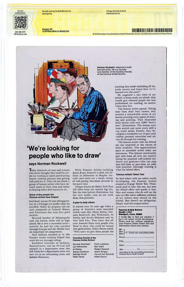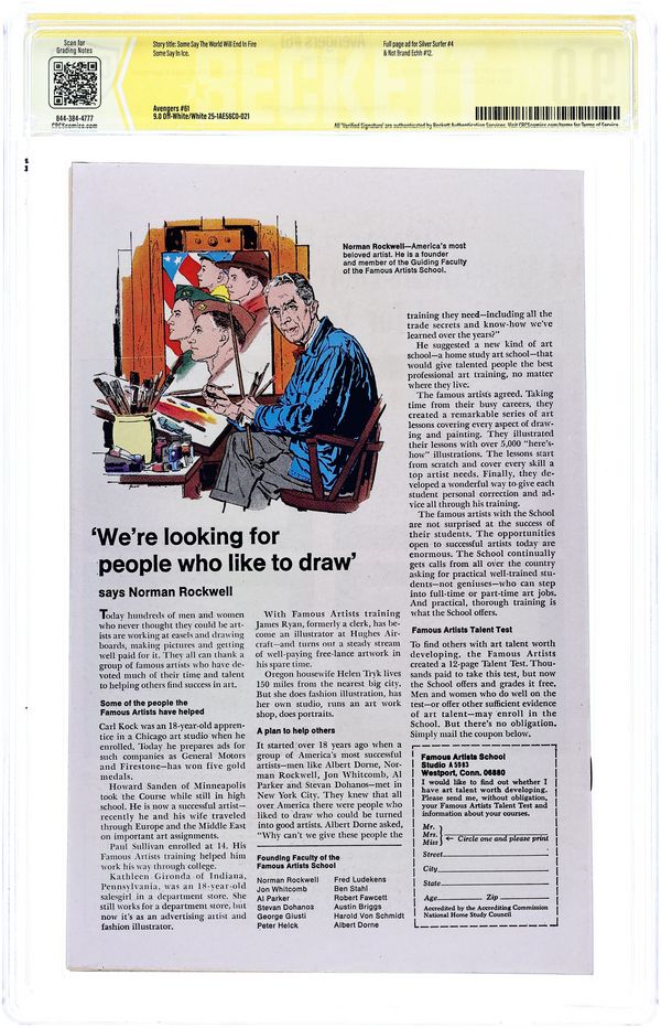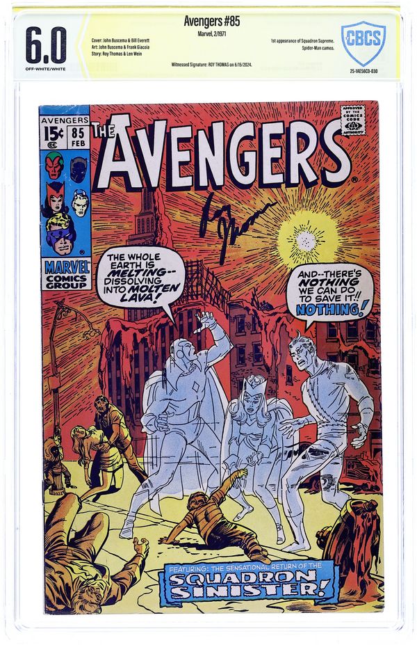 "The World is Not for Burning!" Part 1 of 2. First appearance of the Squadron Supreme. Script by Roy Thomas. Pencils by John Buscema. Inks by Frank Giacoia. Cover by John Buscema and Bill Everett. After concluding their amazing adventure on Polemachus, the Prince of Asgard uses his mighty mjolnir to sweep the Avengers back to Earth! Once the Vision, Goliath, Quicksilver, and the Scarlet Witch arrive at their Fifth Avenue headquarters; they look forward to rest and relaxation! But upon entering their familiar home, the tired quartet bumps into Nighthawk! Has the Squadron Sinister invaded the mansion?! No, the Avengers have apparently invaded someone else's mansion! What? In a bizarre twist of fate, the extra-dimensional jump from Polemachus went awry! Earth's Mightiest Heroes have landed on a parallel Earth with a different superhero team: the Squadron Supreme! When the two teams meet, cooler heads don't prevail! And the Mighty Avengers test their mettle vs. the Squadron Supreme! Cameo appearances by the Black Knight, Black Panther, Captain America, Spider-Man, Thor, Doctor Spectrum, Hyperion, and the Whizzer. Squadron Supreme Lineup: American Eagle, Hawkeye (aka the Golden Archer), Lady Lark, Nighthawk, and Tom Thumb. Avengers Lineup: Goliath, Quicksilver, Scarlet Witch, and the Vision. (Notes: The Squadron Supreme's Earth was later designated Earth-712. The cover indicates that the Squadron Sinister (from Avengers 71) has returned; however, it's the Squadron Supreme that appears for the first time in this issue.) 36 pages. Cover price $0.15.