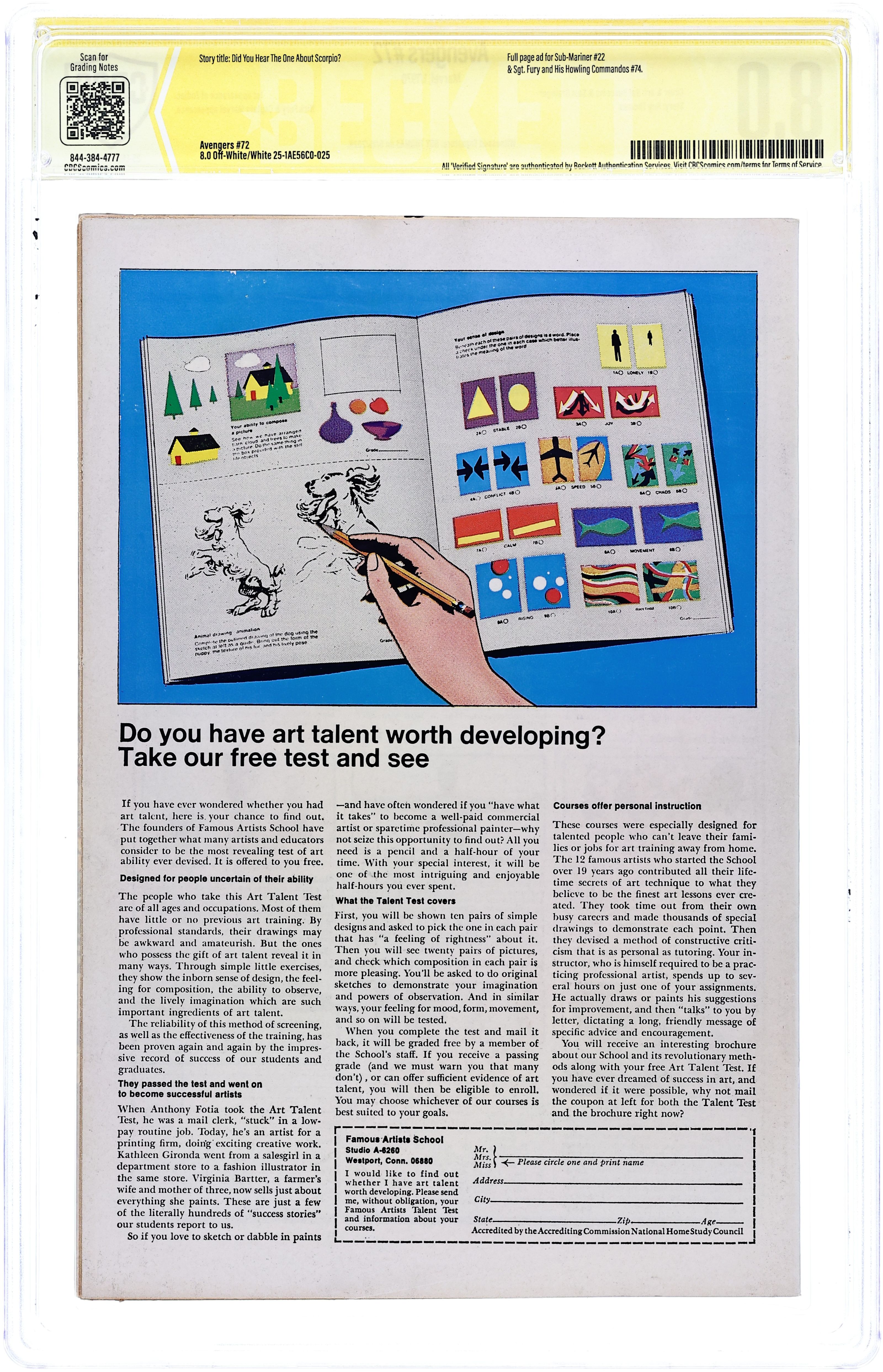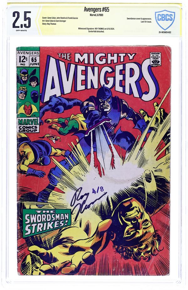 Last 12-cent issue. "Mightier than the Sword?" Part 3 of 3. Script by Roy Thomas. Pencils by Gene Colan. Inks by Sam Grainger. Cover by Gene Colan and Sam Grainger (with alterations by John Romita and Frank Giacoia). After the tragic death of his brother last issue, Clint Barton vows revenge against Egghead! And auspiciously for the new Goliath, his firstopportunity comes very soon! Upon returning to Earth, Egghead dispatches the Swordsman to Avengers Mansion to capture his old foe Henry Pym! But neither super-villain knows that Hank has recently changed his identity to Yellowjacket! Amid the confusing battle, the Swordsman grabs Clint instead and takes him back to Egghead! And for the vengeance-seeking avenger... that's right where he wants to be...for payback! Partial origin of Hawkeye (aka Clint Barton). Flashback cameos by Barney Barton and the Swordsman. Avengers Lineup: Black Panther, Goliath, Vision, Wasp, and Yellowjacket. (Notes: The Swordsman previously appeared in Captain America 105. Egghead returns in Marvel Feature (1st series) 5. This three-part story was reprinted in Marvel Super Action 24-26.) 36 pages. Cover price $0.12.