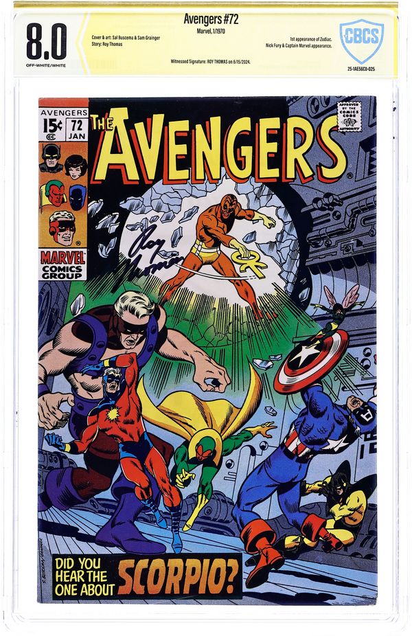 "Did You Hear the One About Scorpio?" Guest-starring Captain Marvel and Nick Fury. Script by Roy Thomas. Pencils by Sal Buscema. Inks by Sam Grainger. Cover by Sal Buscema and Sam Grainger. Captain America calls a late-night meeting at Avengers Mansion! Three New York City officials have been kidnapped in recent days by Scorpio! And the disappearances are connected somehow to SHIELD and Nick Fury! Rick Jones tries to provide some answers at the meeting, but in stunning fashion Scorpio cuts down Rick and the Avengers with one powerful blast from the zodiac key! After the quintet of avengers are taken to Scorpio's hideaway, they come face-to-face with the twelve houses of the Zodiac! And shortly thereafter the no-holds-barred battle begins! The Avengers vs. the Zodiac! Can Earth's Mightiest Heroes defeat the celestial super-villains? Perhaps the stars will be aligned for victory! First appearances of the Zodiac, Libra, and Taurus (aka Cornelius Van Lunt). Cameo appearance by Dum Dum Dugan. Flashback cameo by Jake Fury. Avengers Lineup: Captain America, Goliath, Vision, Yellowjacket, and the Wasp. (Notes: Elements of the story from Nick Fury Agent of Shield 15 continue in this issue. The Avengers battle the Zodiac again in Avengers 120. The letters page includes a letter from comics artist Keith Pollard.) 36 pages. Cover price $0.15.