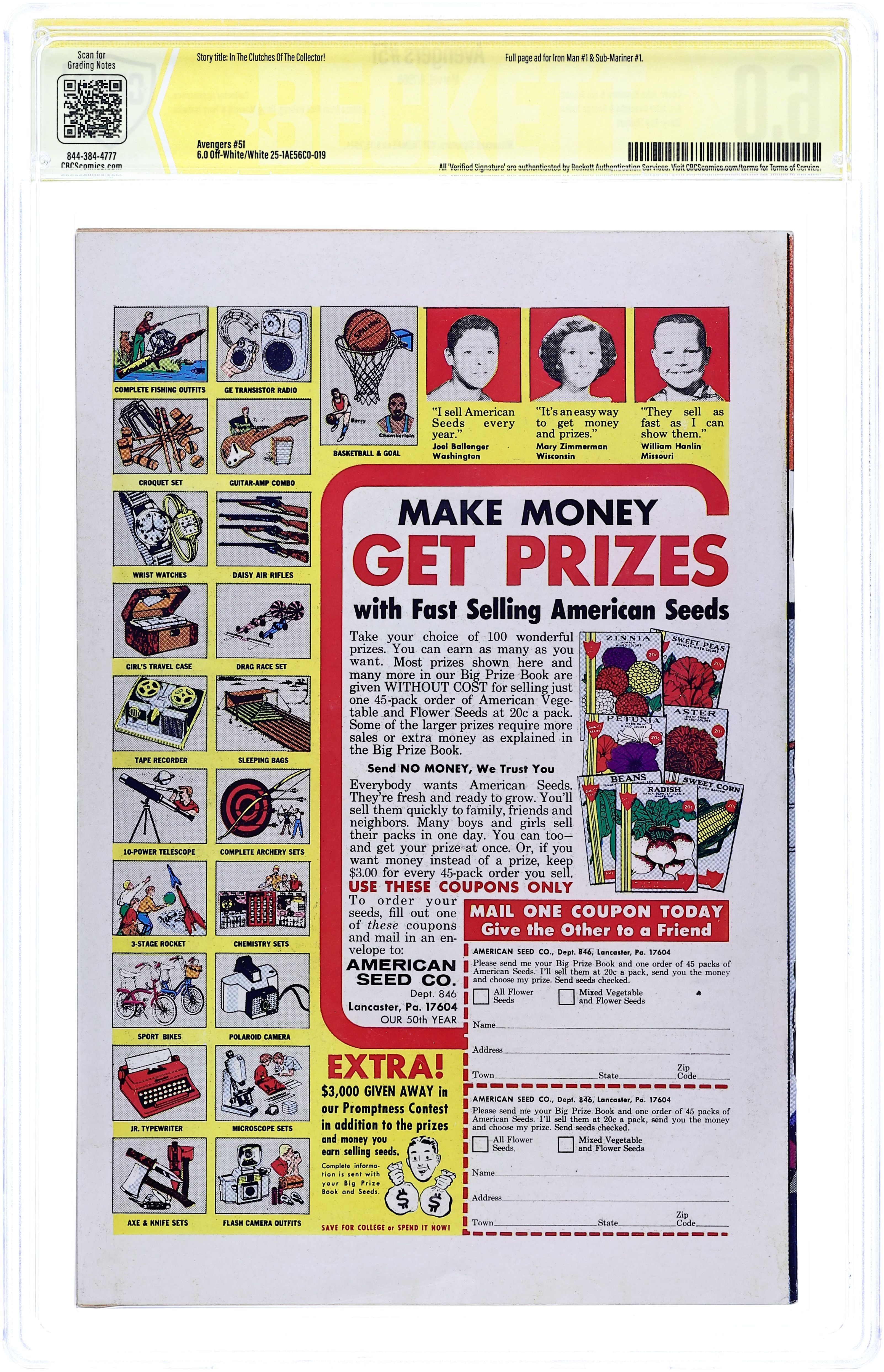 Cover pencils by Jack Kirby, inks by Dick Ayers. "When the Commissar Commands!", script by Stan Lee, pencils by Don Heck, inks by Dick Ayers; The Reds (evil commies) led by the monstrous Commissar are enslaving the peaceful land of Sin-Cong; The Avengers travel to that land to aid the people. Commissar defeats them all except the Scarlet Witch who discovers and destroys the Commissar's control panel, ending him. Avengers Roll Call: Captain America, Hawkeye, Quicksilver, and the Scarlet Witch. Appearance by Edwin Jarvis. Villains: Major Hoy and the Communists oppressors of Sin Cong (first and only appearance). Cameo by Nick Fury. Letter to the editor from Ted White (the writer?). Reprinted in Marvel Triple Action # 12. 36 pgs., full color. $0.12. Cover price $0.12.