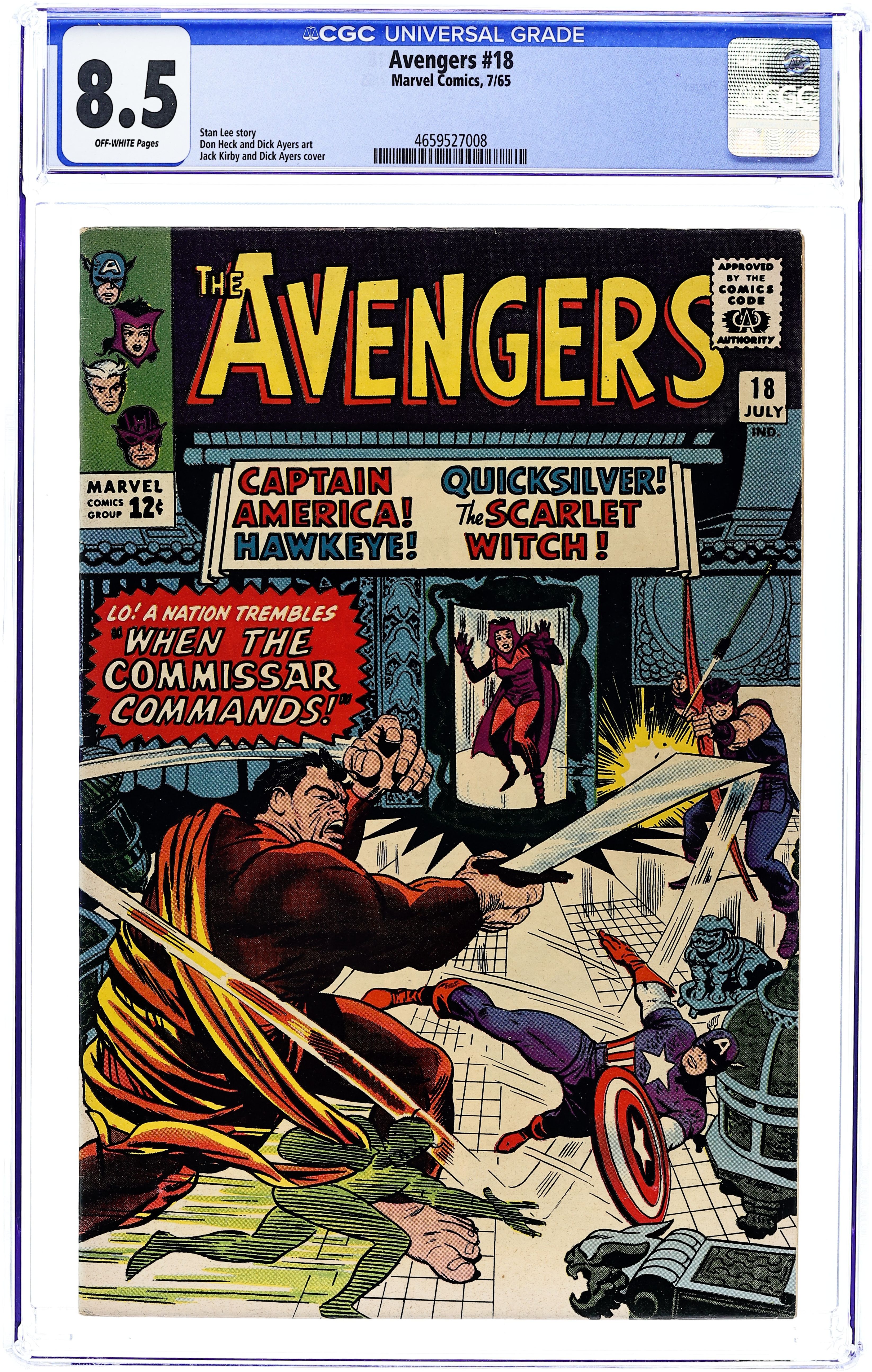 Cover pencils by Jack Kirby, inks by Dick Ayers. "When the Commissar Commands!", script by Stan Lee, pencils by Don Heck, inks by Dick Ayers; The Reds (evil commies) led by the monstrous Commissar are enslaving the peaceful land of Sin-Cong; The Avengers travel to that land to aid the people. Commissar defeats them all except the Scarlet Witch who discovers and destroys the Commissar's control panel, ending him. Avengers Roll Call: Captain America, Hawkeye, Quicksilver, and the Scarlet Witch. Appearance by Edwin Jarvis. Villains: Major Hoy and the Communists oppressors of Sin Cong (first and only appearance). Cameo by Nick Fury. Letter to the editor from Ted White (the writer?). Reprinted in Marvel Triple Action # 12. 36 pgs., full color. $0.12. Cover price $0.12.