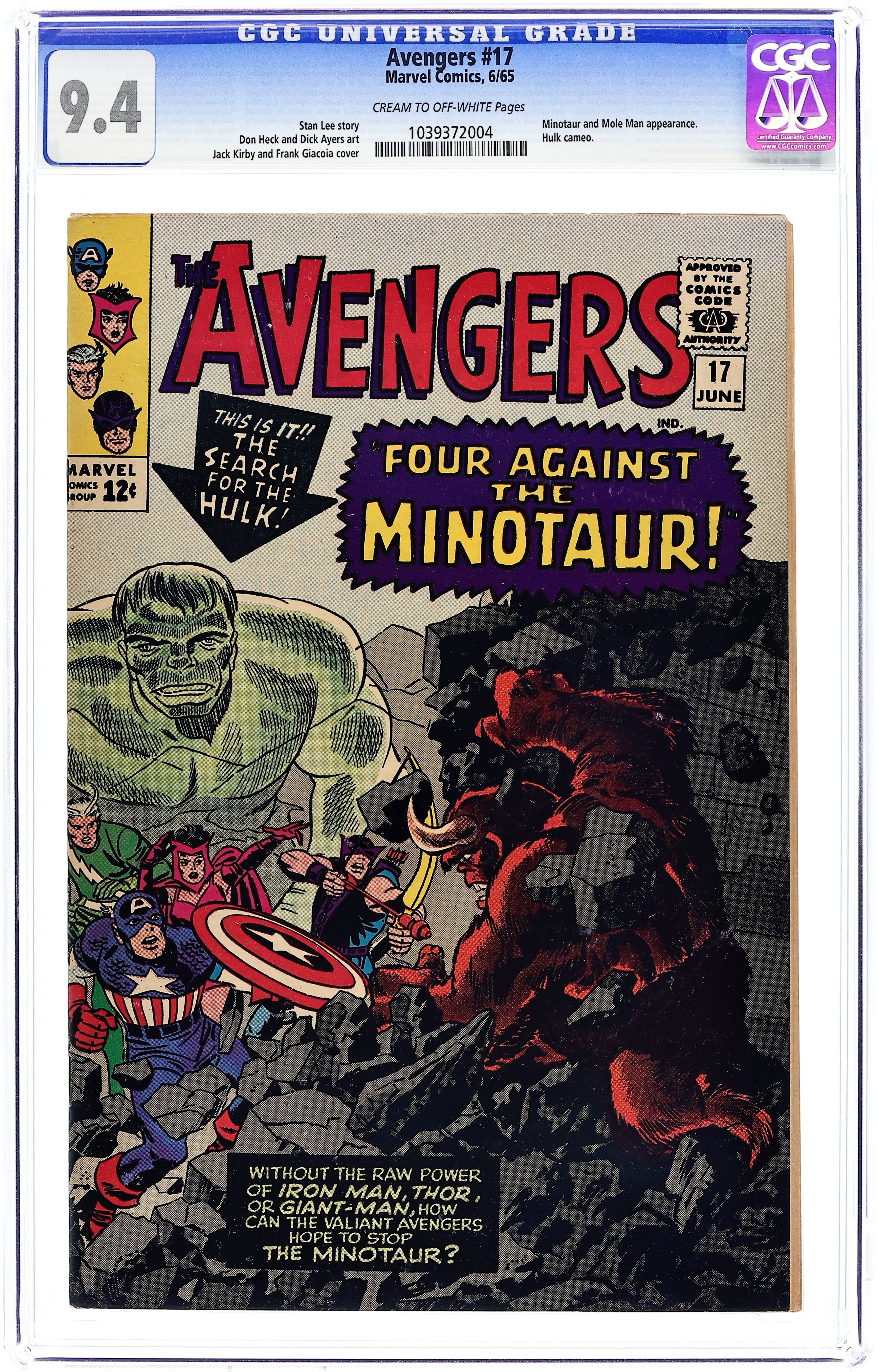 "Four Against the Minotaur!" Script by Stan Lee, pencils by Don Heck (some faces retouched by Jack Kirby), inks by Dick Ayers. Avengers Roll Call: Captain America, Hawkeye, Quicksilver, Scarlet Witch, and Rick Jones. Villains: the Mole Man, the Leader, and the first and only appearance of a minotaur. Guest appearance by the Hulk. As this and the story from Tales to Astonish 69 take place at the same time, some panels are reproductions of the Astonish panels. Reprinted in Marvel Triple Action # 11. Kirby/Frank Giacoia cover. 36 pgs. Cover price $0.12.