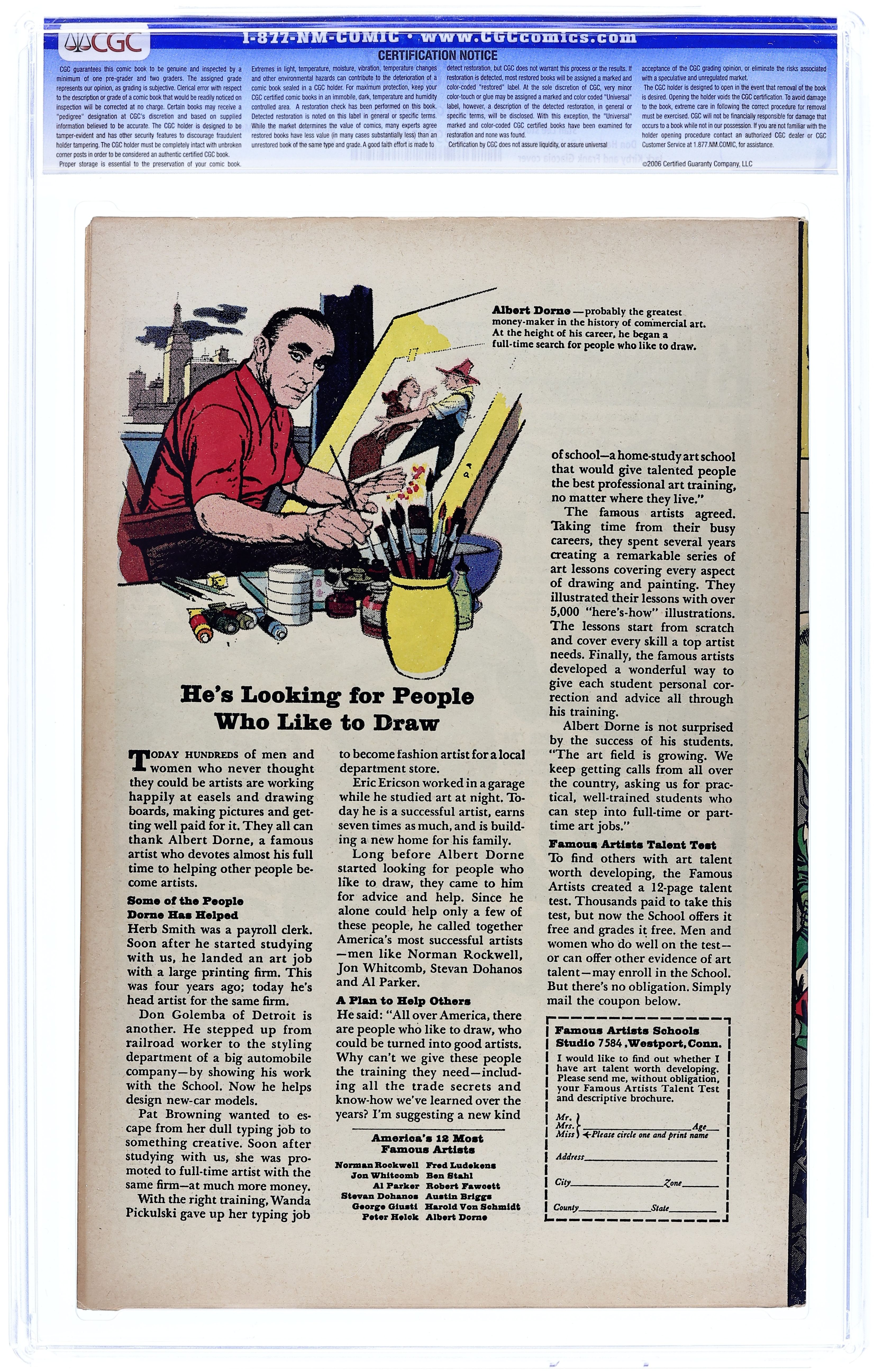 Cover pencils by Jack Kirby, inks by Wally Wood (vignettes by Don Heck and Dick Ayers/Frank Giacoia). "The Road Back," script by Stan Lee, pencils by Don Heck, inks by Wally Wood; Forced to disband the Avengers, Hawkeye, Quicksilver, and Scarlet Witch cannot find work until the Ringmaster hires them; Unable to control them, he tells the police that they tried to rob his Circus; Suddenly the three are on the run; Working on his own, Cap is able to pin the whole scheme on Enchantress and Power Man; Enchantress bails back to Asgard; Power Man, deprived of his lady love, surrenders; The City Council withdraws its order: the Avengers may assemble again. Avengers Roll Call: Captain America (leaves Avengers at end of story), Hawkeye, Quicksilver, and Scarlet Witch. Villains: the first Power Man (Erik Josten), the Enchantress, the Ringmaster, Princess Python, the Clown, Cannonball, Luigi Gambonno, Ernesto Gambonno, and Bruto the Strongman. Cameos by the Mad Thinker's "awesome" Android, Iron Man, Thor, and Giant Man. Reprinted in Marvel Triple Action #16. 36 pgs., full color. $0.12. Cover price $0.12.