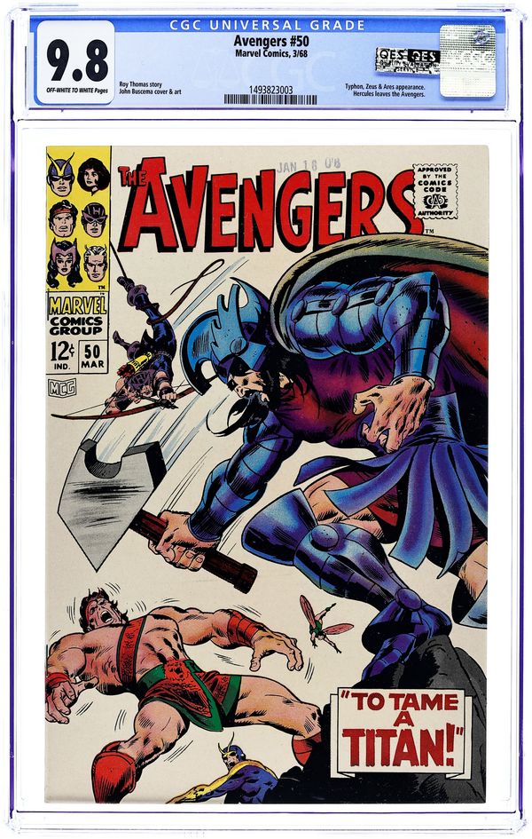 "To Tame a Titan!" Script by Roy Thomas. Art by John Buscema. Cover by John Buscema. Typhon rules Olympus! And the vengeful titan now has his sights set on conquering the land of mortals! Where is Hercules? Unfortunately, he was exiled last issue to the Land of Shades with his fellow Olympians! However since Hercules is half-mortal, Zeus is able to send him back to Earth! When Hercules returns, he sees his brave friends fighting Typhon! But Hawkeye, Goliath, and the Wasp don't have the raw power to beat Typhon! Does the Lion of Olympus? In an incredible display of strength and skill, the Prince of Power vanquishes the terrible titan! And Olympus lives again! Cameo appearances by Ares, Bia, and Kratos. (Notes: Hercules elects to stay in Olympus after the battle. Typhon returns in Avengers 163. The letters page includes a letter from comics writer Tony Isabella. This story was reprinted in Marvel Triple Action #42. This issue includes a statement of ownership: average print run 454,496; average paid circulation 269,139.) 36 pages. Cover price $0.12.