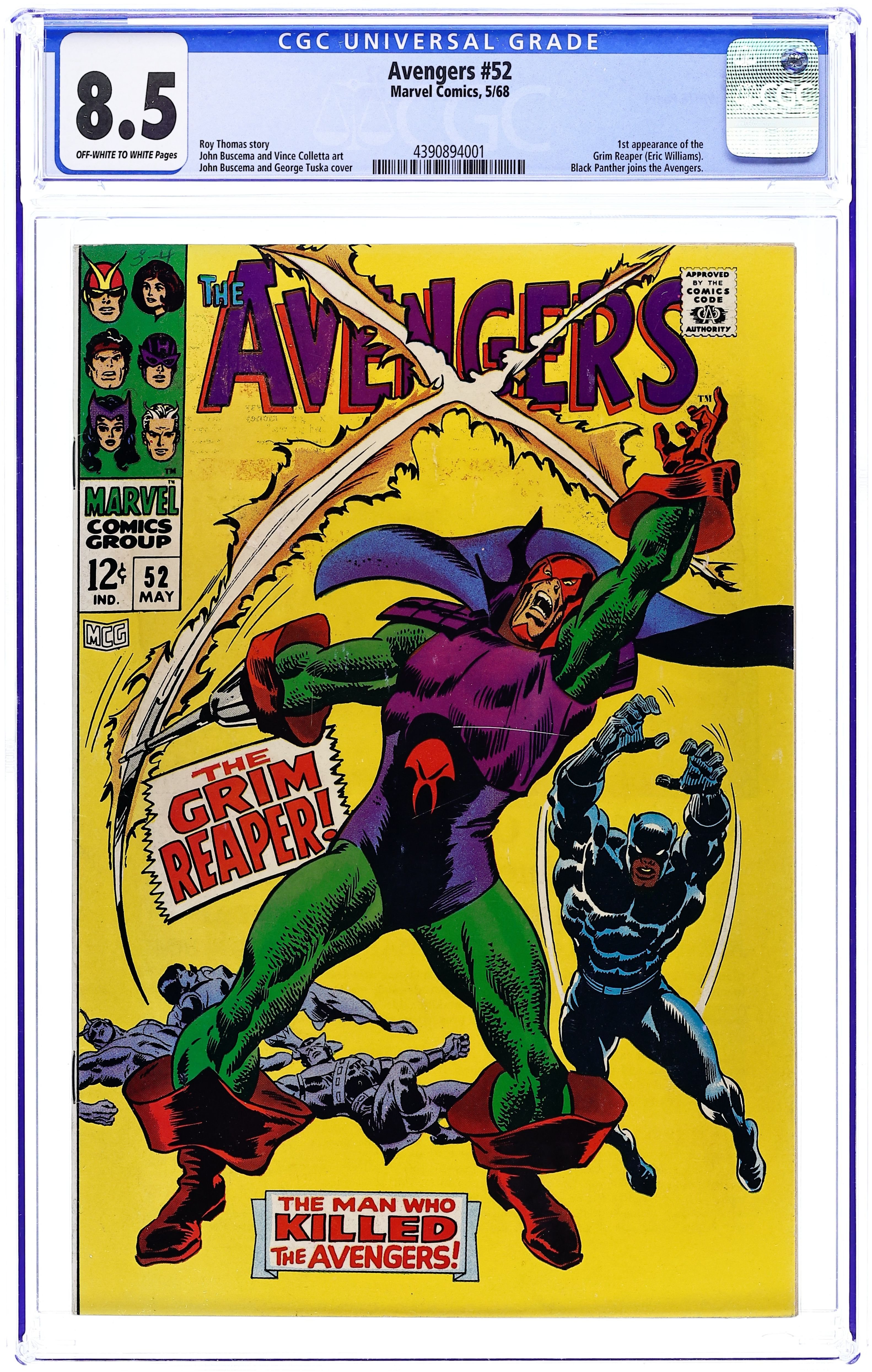 First appearance of the Grim Reaper in "Death Calls for the Arch-Heroes!" Script by Roy Thomas. Pencils by John Buscema. Inks by Vince Colletta. Cover by John Buscema. The Black Panther arrives at Avengers Mansion ready to join Earth's Mightiest Heroes! However when T'Challa reaches the main meeting room, he finds his three would-be teammates lying on the floor unconscious! The panther begins to render first aid, but Jasper Sitwell suddenly appears and arrests him for murder! While being transported to and questioned at the local police station, T'Challa puts the evening's strange pieces together! And the newest avenger rushes back to the mansion to face the true perpetrator! Wow, the Black Panther vs. the Grim Reaper! What a debut for the superhero and the super-villain! Cameo appearances by the Black Widow, Tony Stark, Captain America, and Thor. Flashback cameo by Wonder Man to recap the events of Avengers #9. Avengers Lineup: Black Panther, Goliath, Hawkeye, and the Wasp. (Notes: The Grim Reaper (aka Eric Williams) returns in Avengers #78 to continue his quest for revenge. The letters page includes a letter from comics writer Mike Uslan. This issue was reprinted in Marvel Triple Action #44.) 36 pages. Cover price $0.12.