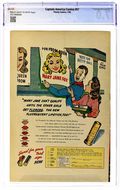 Cover by John Romita. Stories by Don Rico and Joe Gill. Art by John Romita, Dick Ayers and Ernie Bache. "You Die at Midnight!" by Don Rico and John Romita (with the first panel drawn by Carl Burgos) - Communist spies attempt to extort a man who works at the shipyard into turning over plans for atomic-powered vessels or else they will kill his blind son. A disguised Captain America takes his place, and Bucky substitutes for the boy. They reveal themselves and are mopping up the spies when the blind boy comes out of the apartment attempting to help. One of the spies grabs him and threatens to shoot him. Captain America deflects his aim, but the gun discharges near his head, restoring the boy's sight. Captain America and Bucky hand over the spies to the police. Also in this issue: Cap and Bucky in "The Man with No Face" and "Striking Back at the Soviet," both by Don Rico and John Romita; untitled Human Torch and Toro tale by Joe Gill, Dick Ayers and Ernie Bache; and 2-page text story "Bait for a Spy" (writer unknown). 36 pages, full color. Cover price $0.10.
