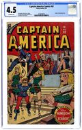 Captain America and Bucky in "Sparkles Strikes Back," "Diamonds Spell Doom," and "Terror at the Fair!" Human Torch back-up story, "Death is the Highest Bidder!" Two-page text story, "Recruit." Syd Shores cover. 52 pgs. Cover price $0.10.