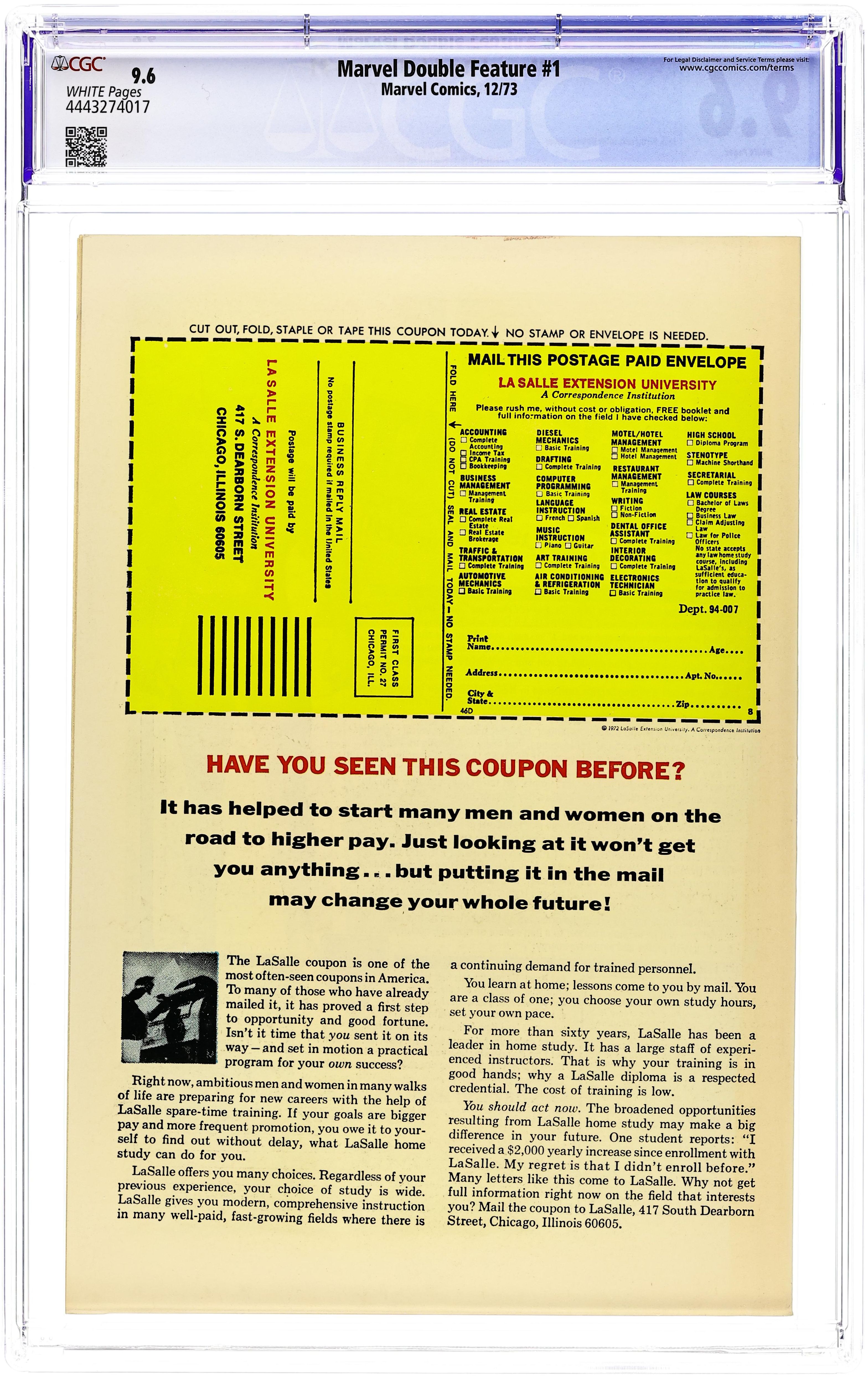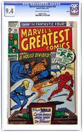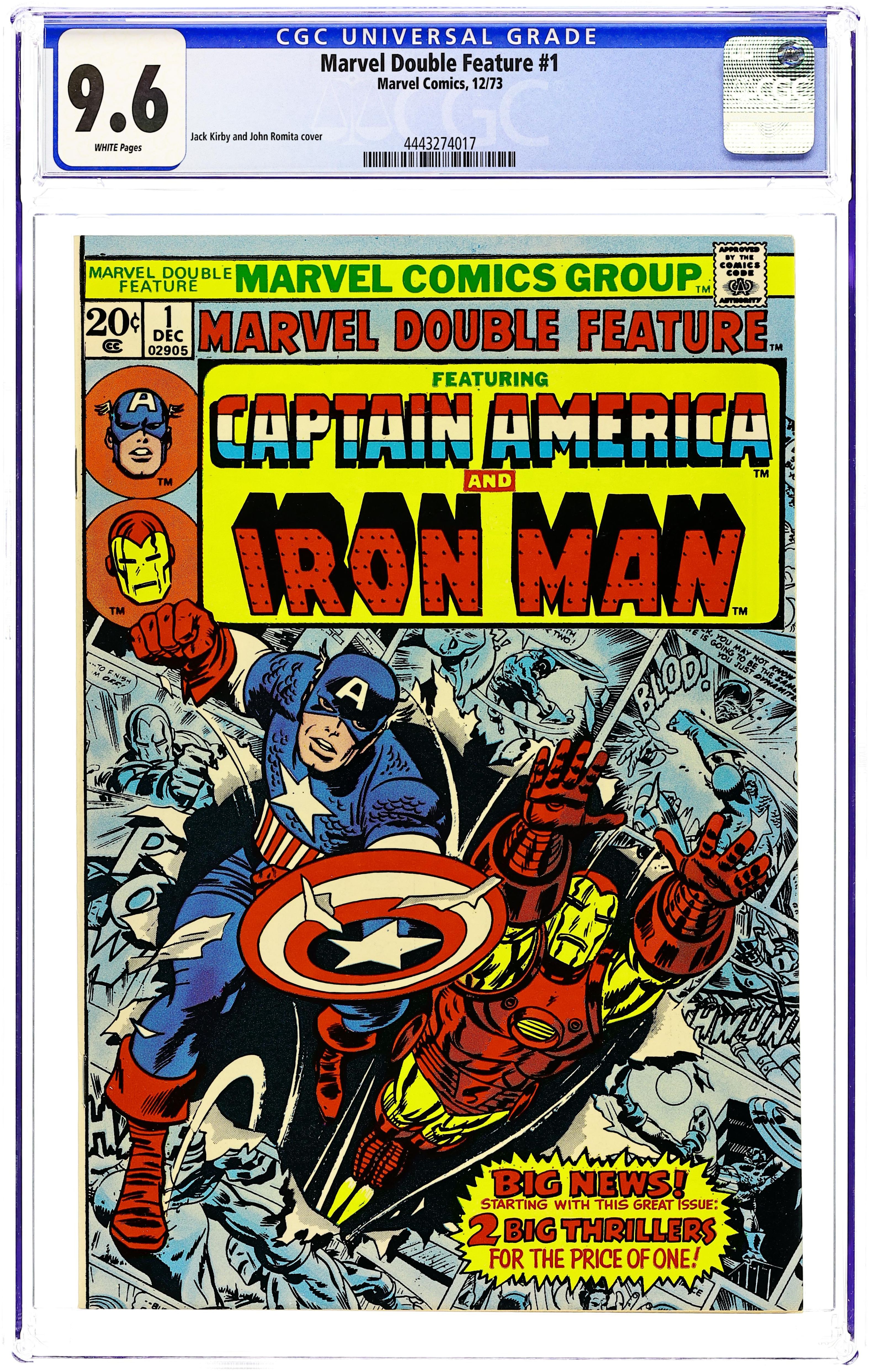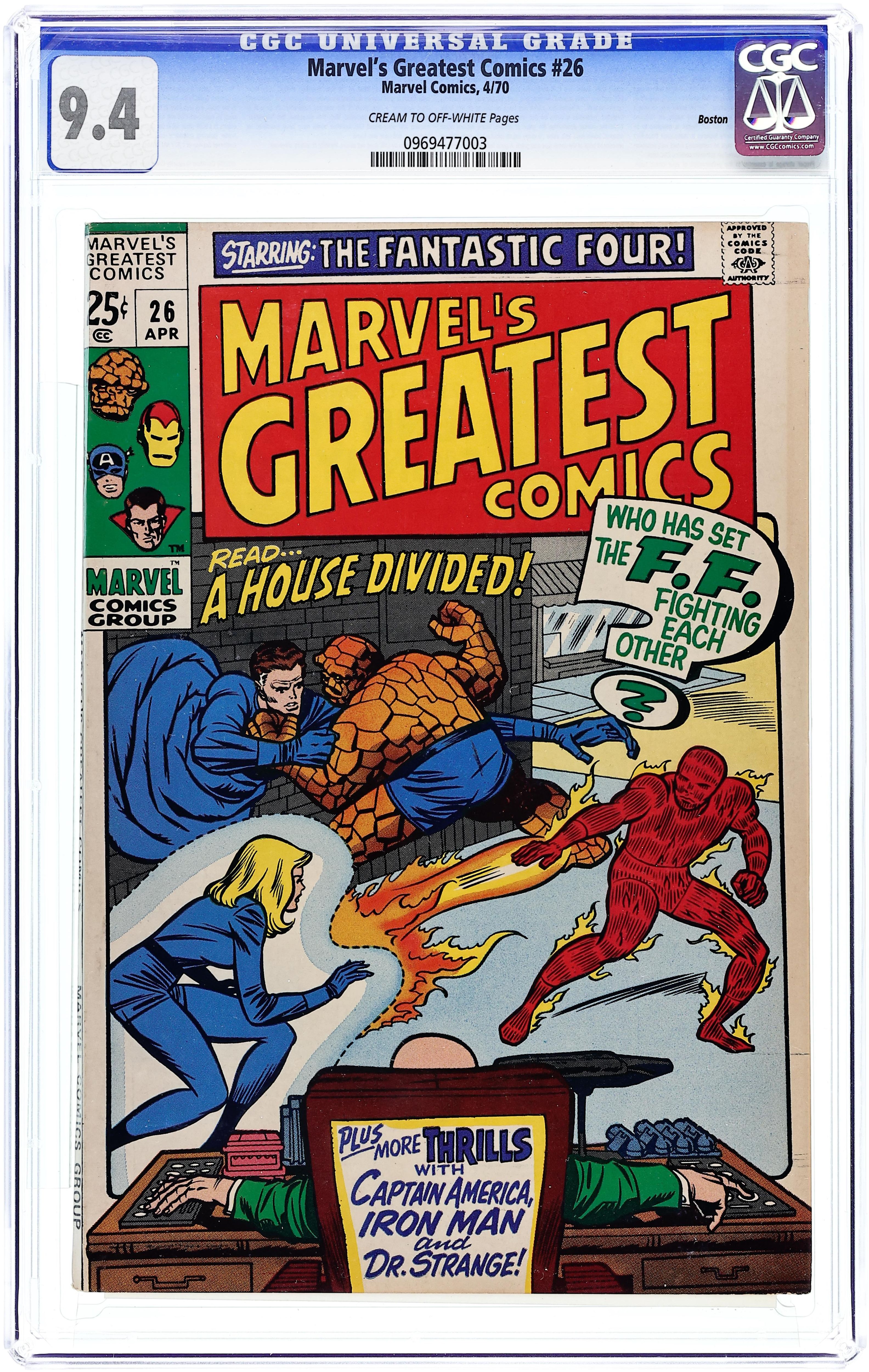 Giant-size issue. Cover pencils by Jack Kirby, inks by Chic Stone. "A House Divided!", script by Stan Lee, pencils by Jack Kirby, inks by Chic Stone; Billionaire Gregory Gideon bets his bid for world domination on his ability to destroy the Fantastic Four; Reprinted from Fantastic Four #34. "If A Man Be Mad!", script by Al Hartley, pencils by Don Heck, inks by Mike Esposito (as Mickey Dimeo); Tony Stark must face not only the traitorous Morgan Stark, his own cousin, but also Count Nefaria and invading aliens; Reprinted from Tales of Suspense #68. "The Army of Assassins Strikes!", script by Stan Lee, pencils by Jack Kirby, inks by Chic Stone; Baron Zemo sends the Army of Assassins after Cap, who is assisted by Rick Jones in defeating them; Reprinted from Tales of Suspense #60. "When Meet the Mystic Minds!", script by Steve Ditko (plot) and Stan Lee (dialogue), art by Steve Ditko; Desperate to learn the secret of Eternity, Dr. Strange probes into the unconscious mind of The Ancient One, meeting one deadly trap after another, until at last, he reaches the mind of his beloved Master; Reprinted from Strange Tales #137. 68 pgs., full color. $0.25. Cover price $0.25.