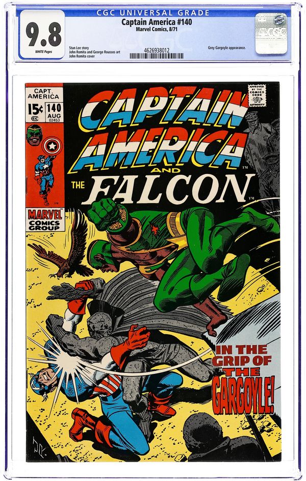 "In the Grip of Gargoyle!" Part 2 of 4. Script by Stan Lee. Pencils by John Romita Sr. Inks by George Roussos. Cover by John Romita Sr. Inside a stonecutter's storage yard, the Sentinel of Liberty and the Falcon battle the Grey Gargoyle! The heroes know they cannot let the gargoyle touch them...or they will turn to stone! The best Cap and his partner can do is fight the super-strong villain to a standstill -- and then free the missing policemen. Afterwards, while the shield-slinger meets with the policecommissioner, Redwing tracks the Grey Gargoyle's movements. And the Falcon decides to challenge the gargoyle on his own! Will Sam Wilson be the next person turned to stone? Retelling of the Grey Gargoyle's origin. Cameo appearances by Commissioner Feingold, Brian Muldoon, Leila Taylor, NickFury, Dum Dum Dugan, and Sharon Carter. 36 pages. Cover price $0.15.