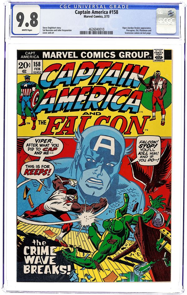 "The Crime Wave Breaks!" Part 2 of 3. Script by Steve Englehart. Pencils by Sal Buscema. Inks by John Verpoorten. Cover by Sal Buscema and Frank Giacoia. On a Manhattan rooftop, Captain America and the Falcon are in dire straits! The Viper shot each of them with a poison dart, and now they only have minutes to live! In a cruel twist, the Viper tosses a vial of antidote on the roof before he leaves; however, it's out of reach for both men! But if somehow Cap can find a way to get the vial, the antidote will save his life and the Falcon's. And possibly give the Living Legend an extra boost -- for his next confrontation against the Cowled Commander! Cameo appearances by Redwing and Brian Muldoon. (Note: Captain America gains super-strength in this issue.) 36 pages. Cover price $0.20.